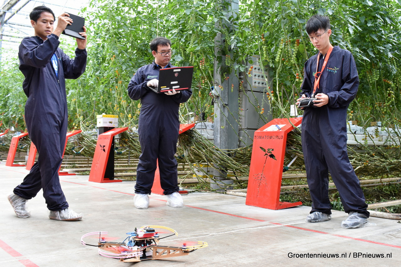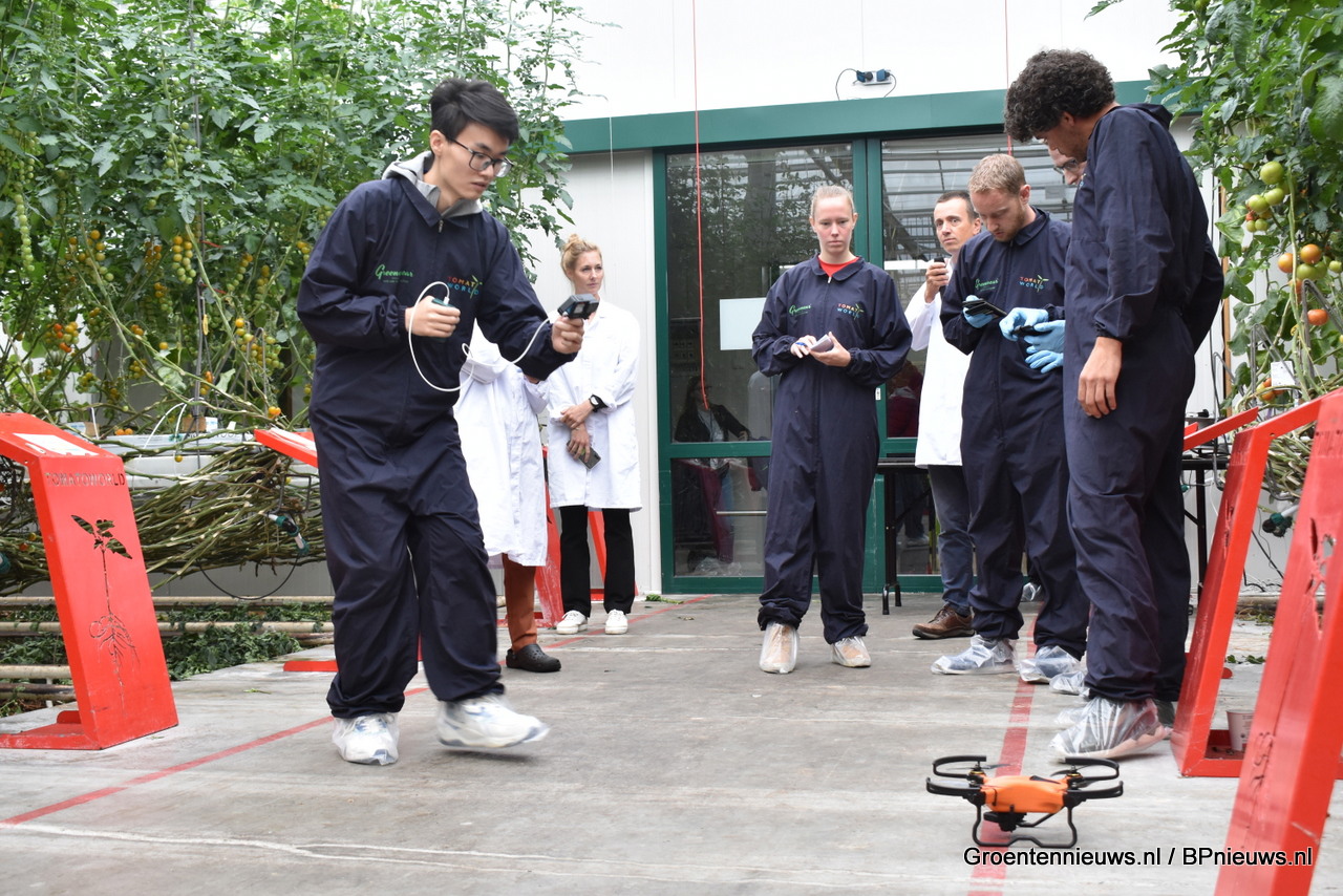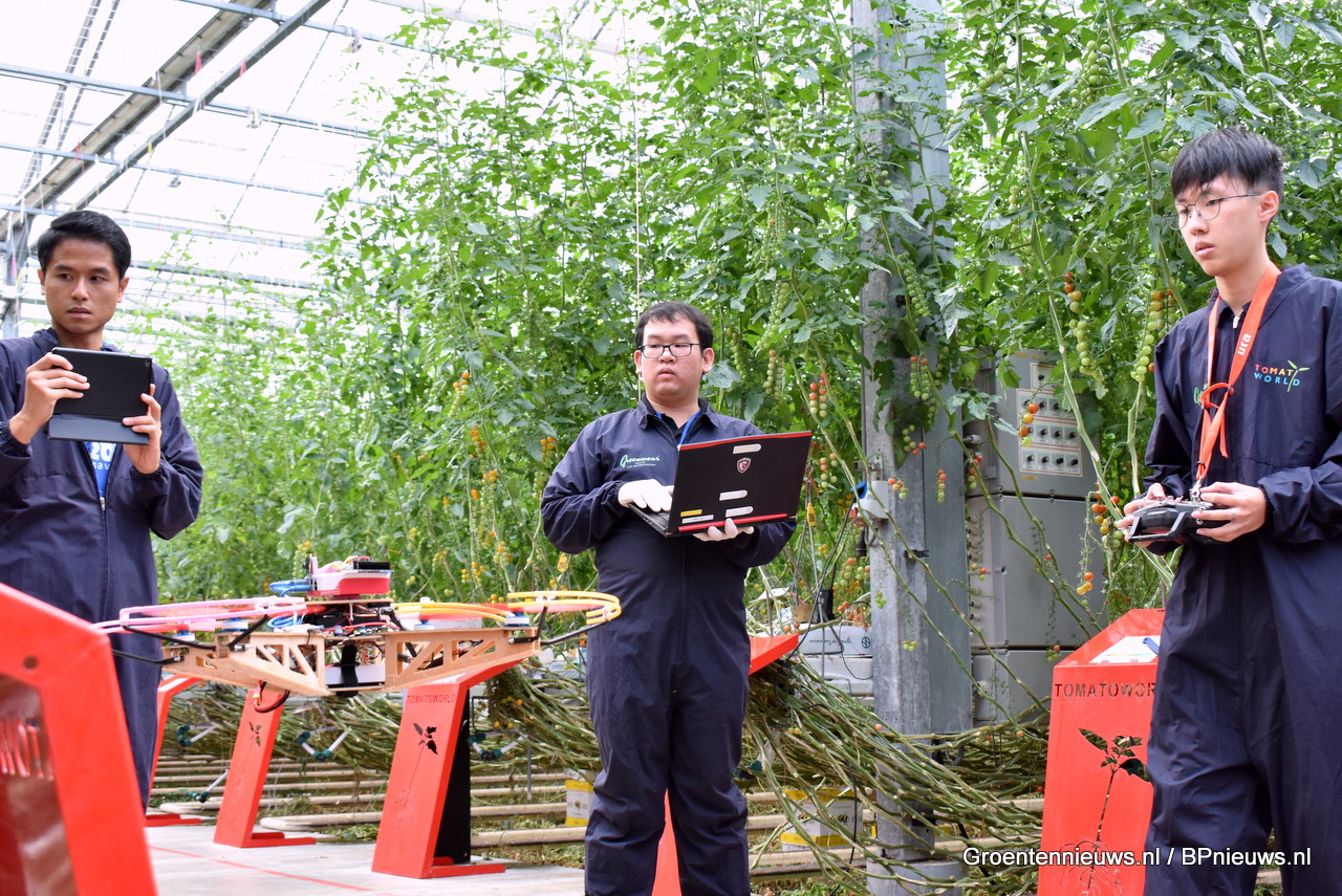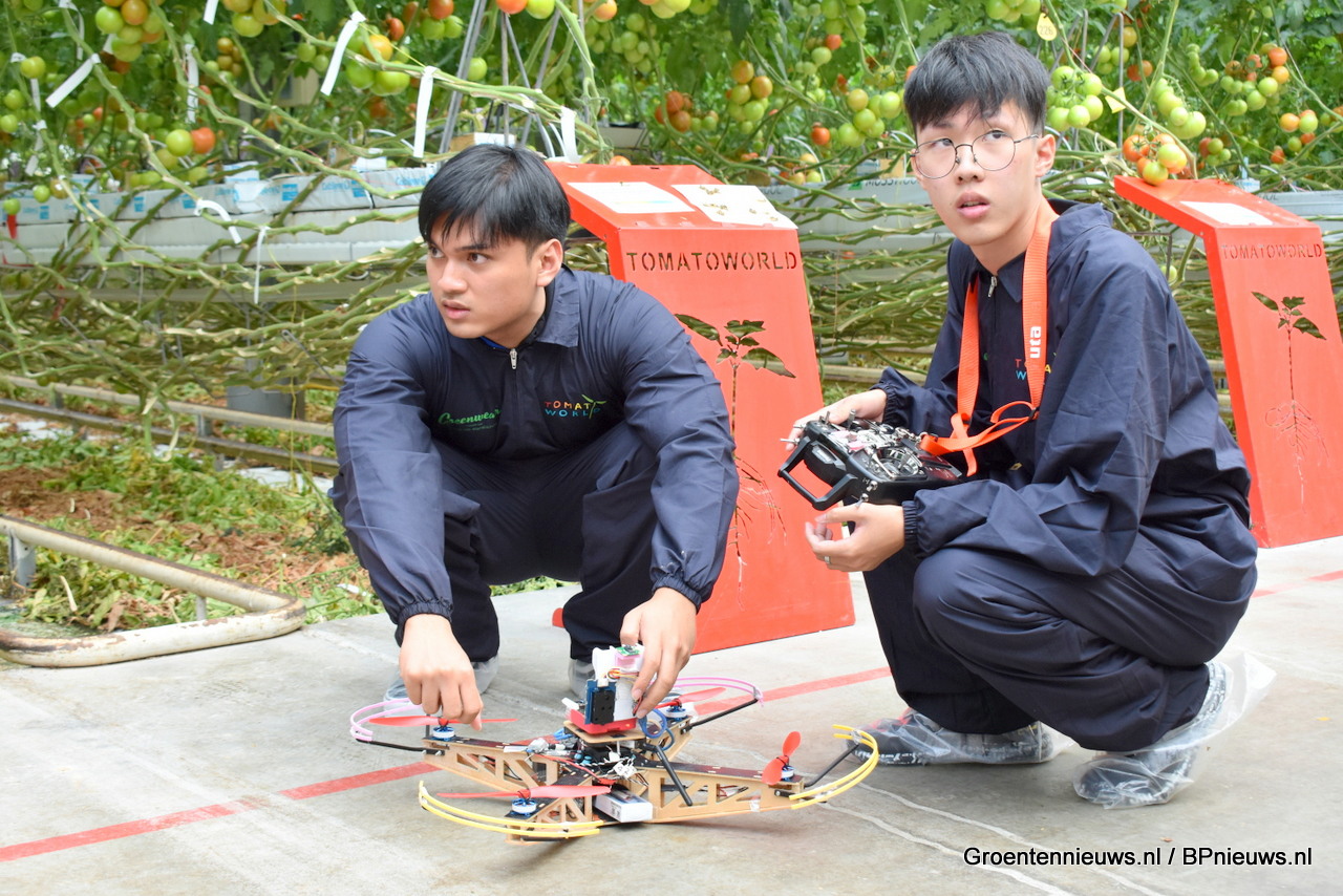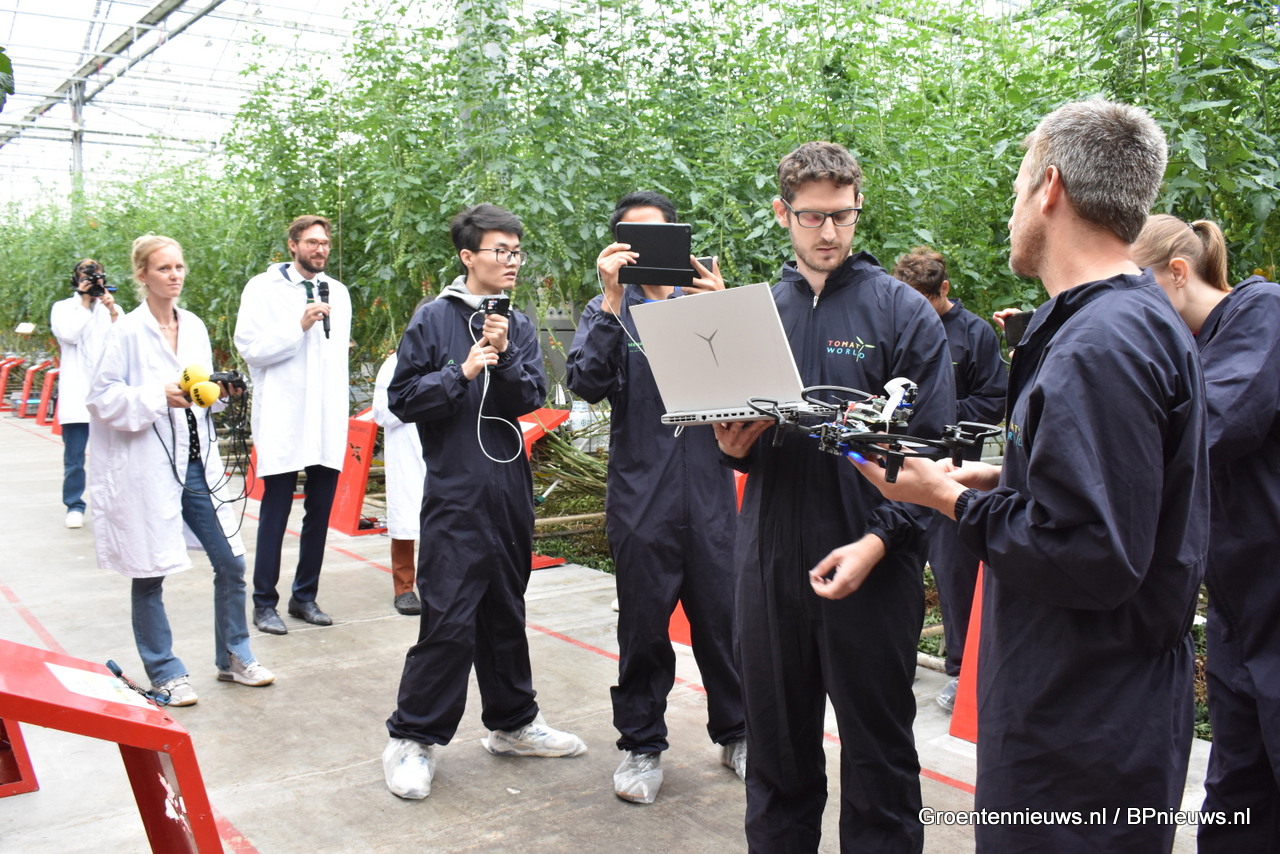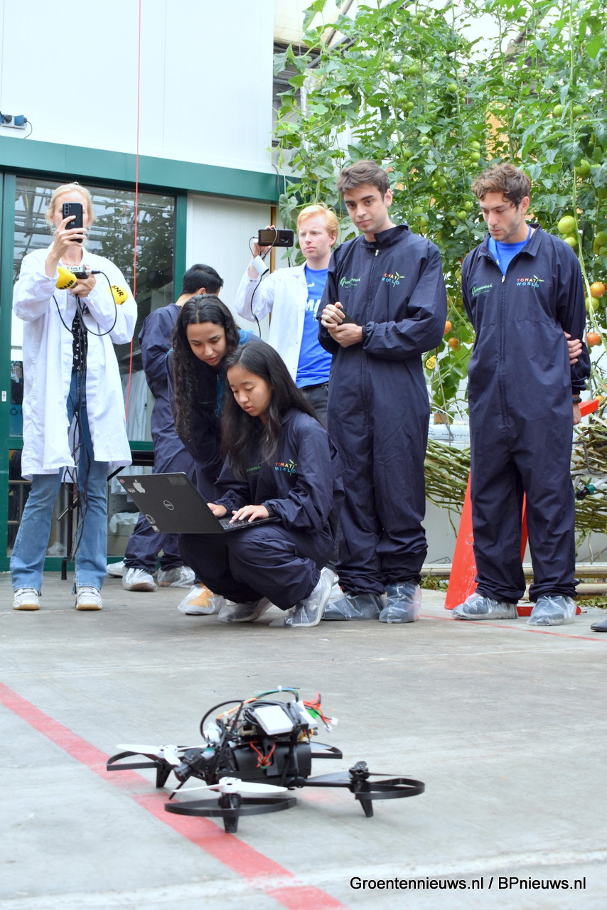 Het blijft een bijzonder zicht en bijzonder knap hoe de drone tussen de tomatenplanten door vliegt. Het team uit Brazilië had een goede eerste vlucht. Toch waren er nog wat aanpassingen nodig om de vlucht af te kunnen maken. In de middag deden ze nog een poging.