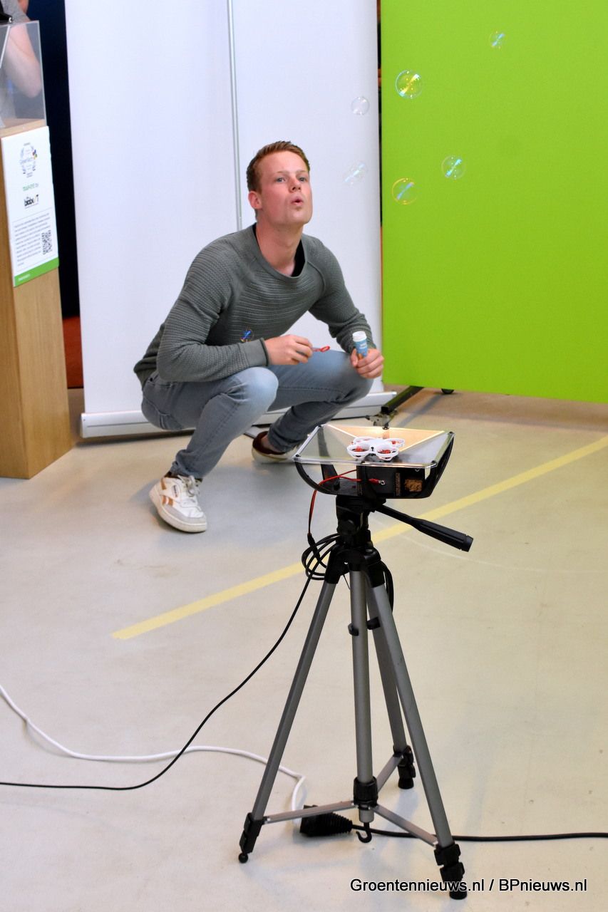 Vanuit deze zaal kon later ook de drone-competitie gevolgd worden. Enkel de teams mochten, na door de desinfectiepoort te zijn gegaan en steriele kleding te hebben aangedaan, de kas in.