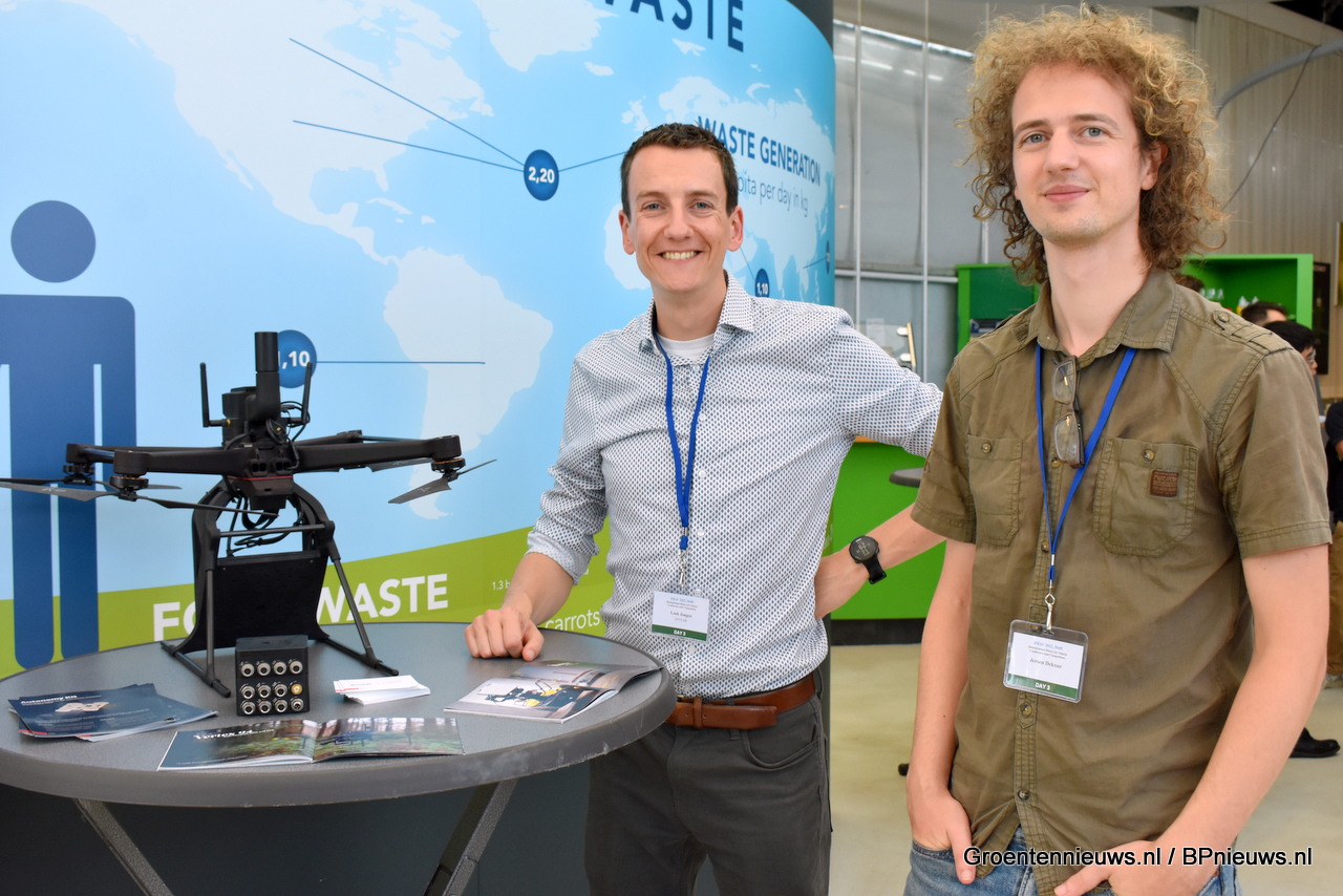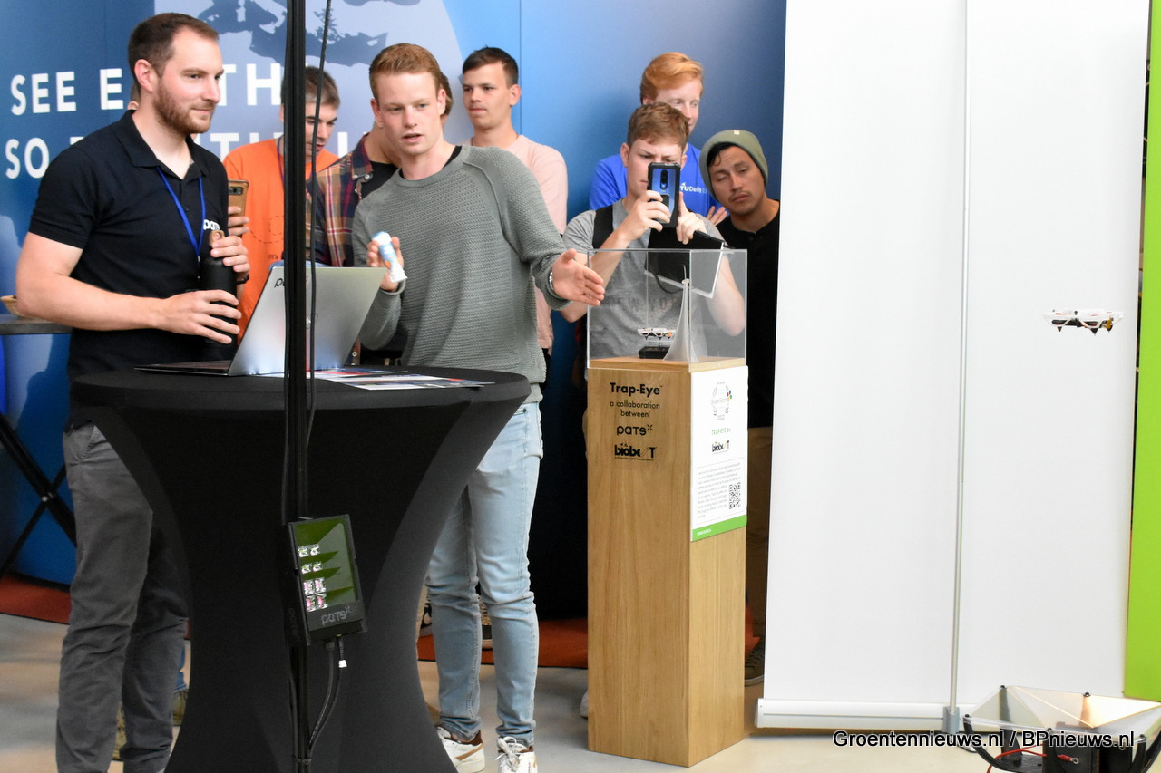 De drone heeft zijn werk gedaan. Een bezoeker praat met Ludwig Kragl van PATS over de zojuist gegeven demo. In de tomatenkas begaf de drone van PATS zich tijdens het evenement niet.
