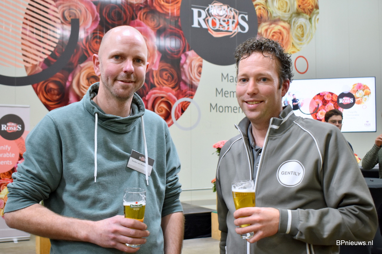 Sander van Winden, bedrijfsleider bij Berg Roses, en met Karel Zuidgeest van Karel Zuidgeest Bloemen genieten van een kouwe.