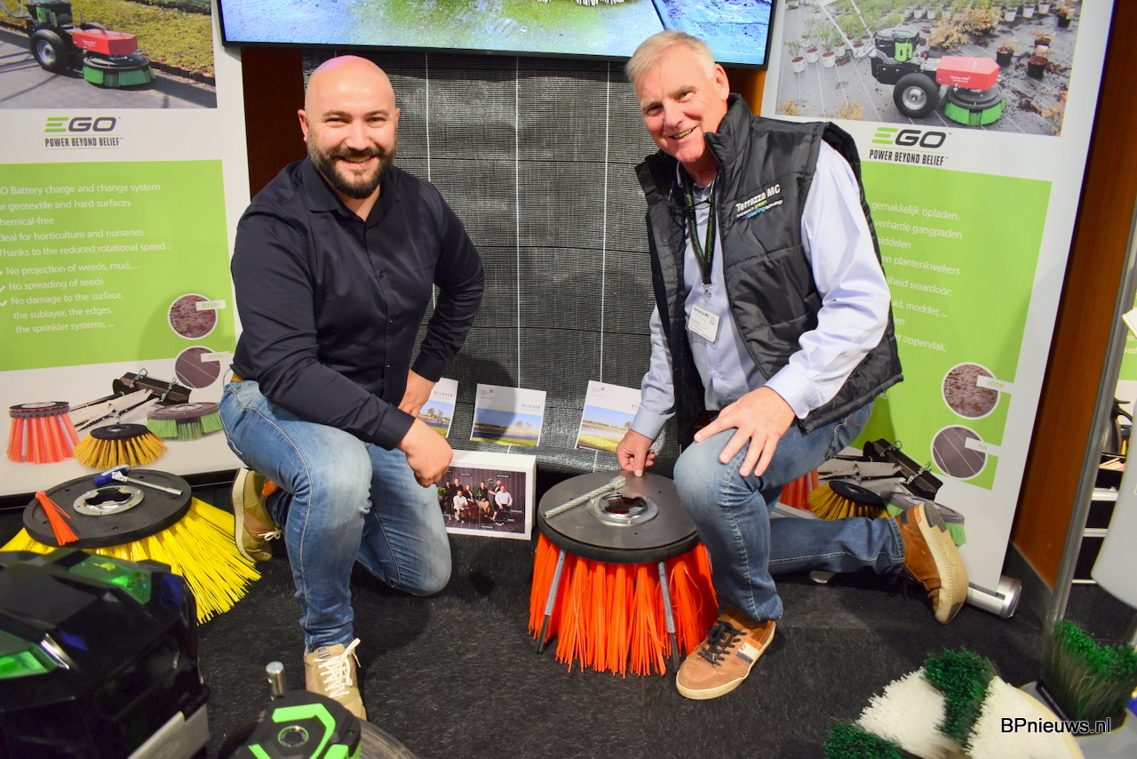 Maarten Balcaen van Beaulien International Group samen met Dany Mestdag van Terrazza MC. Beaulien heeft gronddoek ontwikkeld met het end of life concept in gedachten. Om ervoor te zorgen dat het product langer mee gaat en daarna gerecycled kan worden. Hiervoor hebben zij ook een partnerschap gesloten met Terrazza MC, om de gronddoeken chemi vrij te onderhouden schoon te maken.