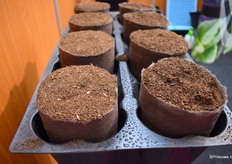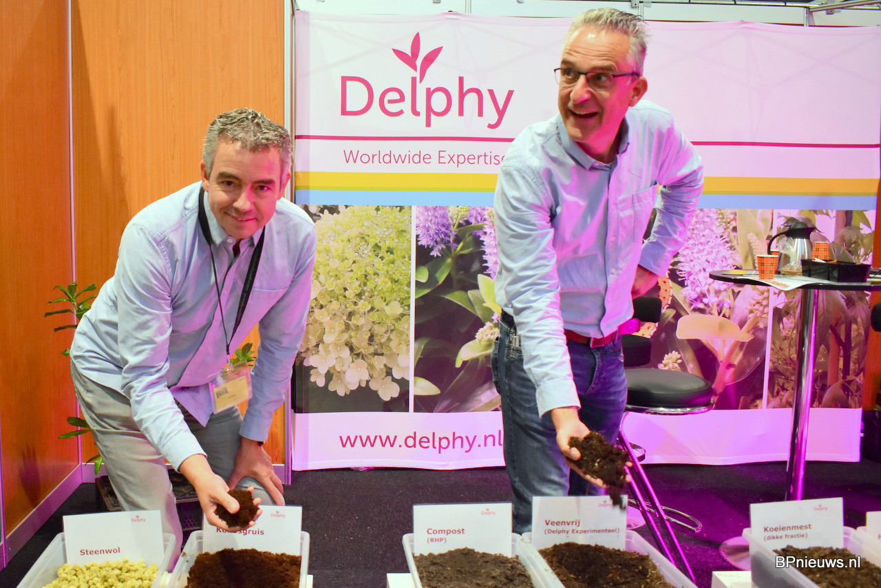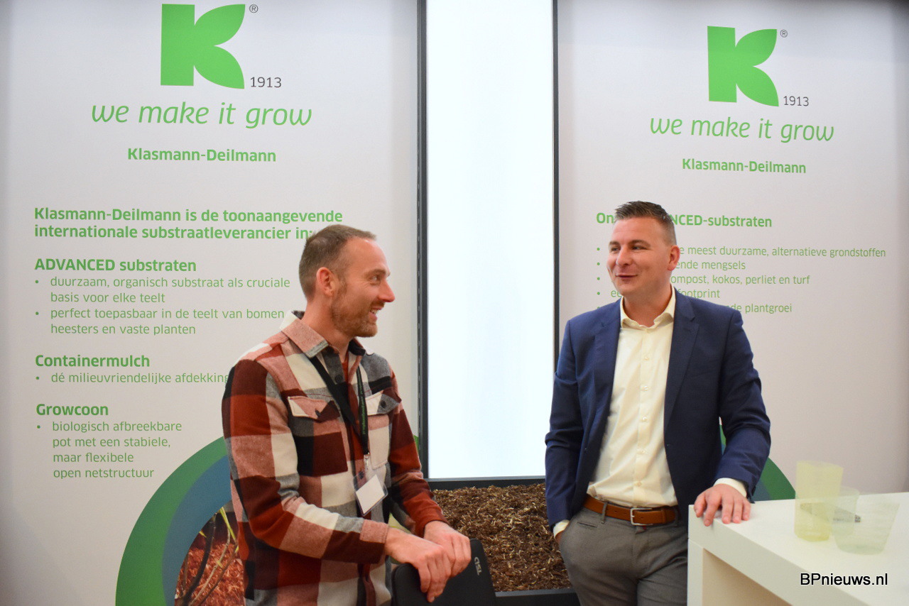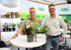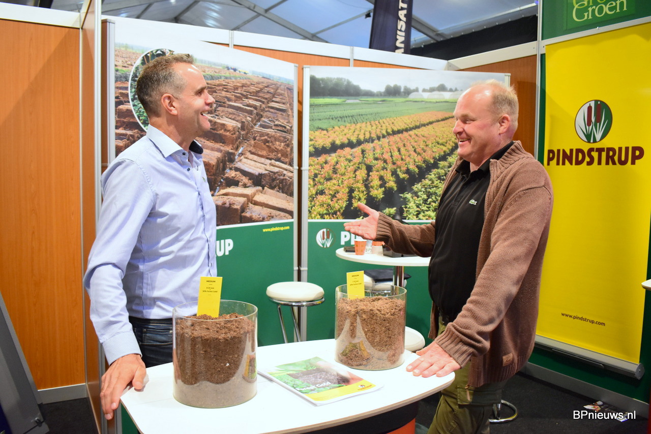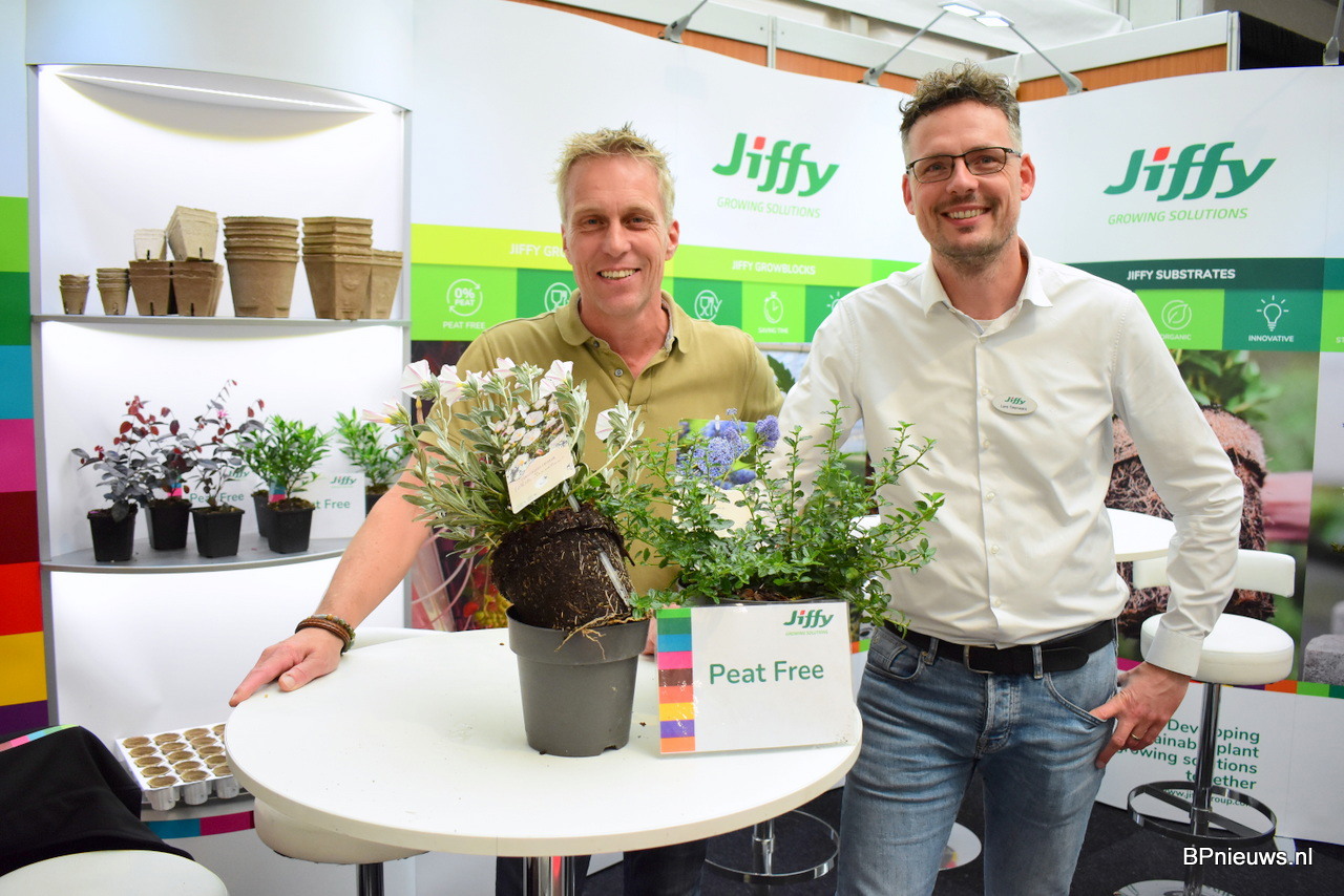 Peter Ham en Lars Tolenaars van Jiffy zette extra in op hun veenvrije substraten. De vraag is zeer actueel en komt vanuit de markt. "Wij moeten leren om nieuwe mengsels te maken. De telers moeten opnieuw leren telen."