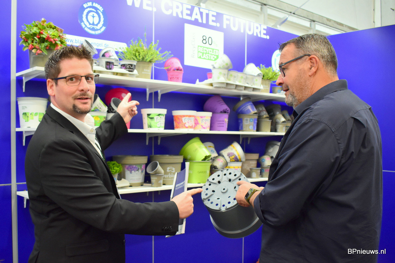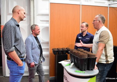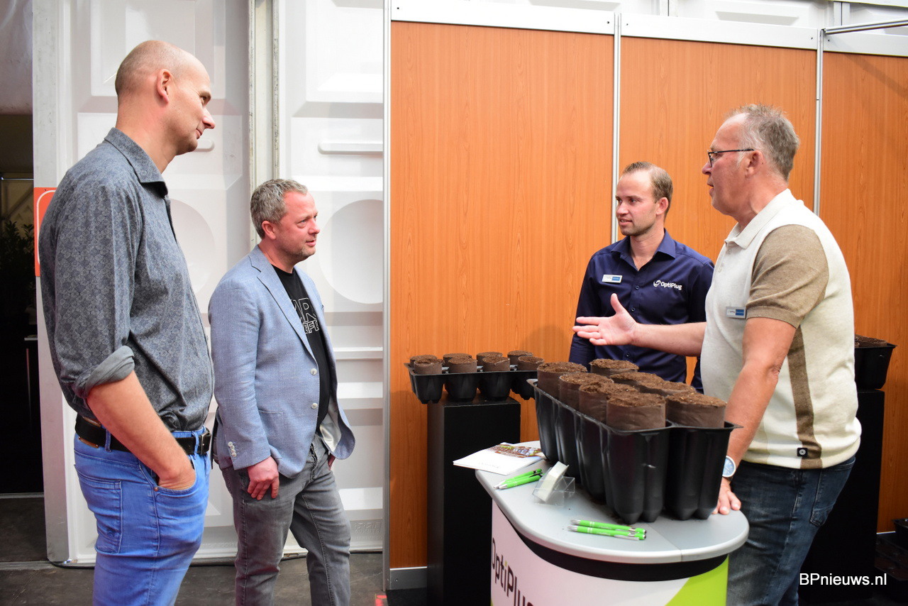 Richard en Rico druk in gesprek met geïntresseerden in de nieuwe paperplug maten voor de boomkwekerij. Zij stonden er met de nieuwe 8, 10 en 12 cm plugs.