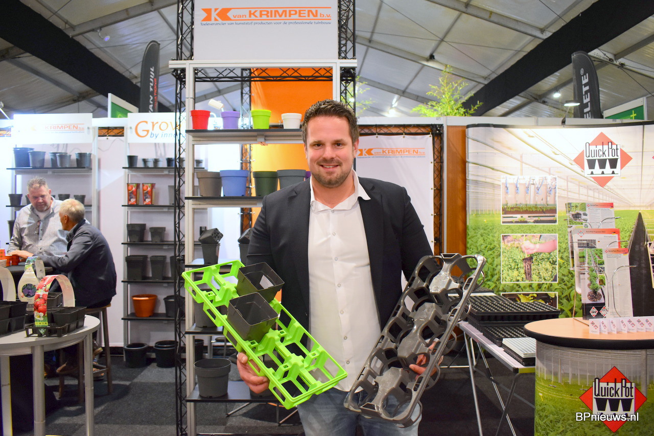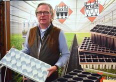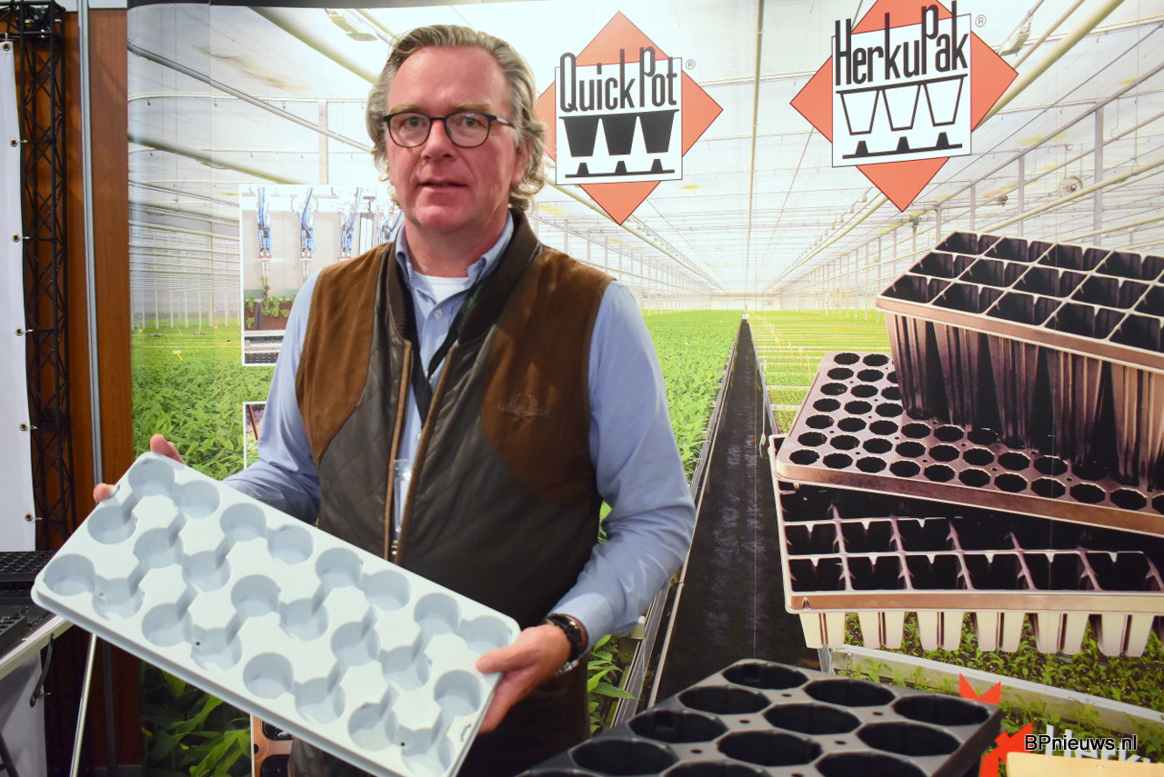 Frans Jan van Van Krimpen met de nieuwe 10 vaks R-Tray uit de R-Tray serie. De trays werden uitgelicht op de beurs omdat het een goede vervanging is voor de eenmalige trays. De R-Trays zijn meerdere malen te gebruiken. "We zien steeds meer een circulaire markt. Eind gebruikers willen hun trays steeds vaker inleveren waardoor we een gesloten systeem krijgen".