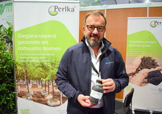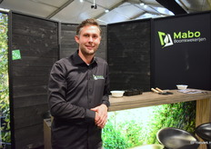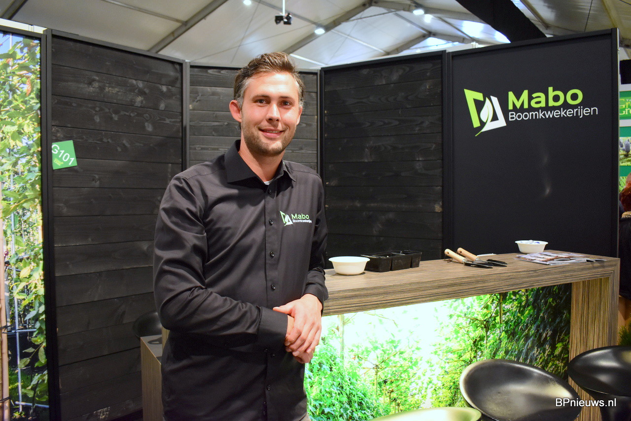 Niels Maurits van Mabo Boomkwekerijen stond op de beurs met de mogelijkheid om digitaal door de tuin rondgeleid te worden. Er stonden dan ook geen planten meer op de stand maar een mooi groot scherm. Niels kweekt laan en vormbomen in vollegrond en containerteelt.