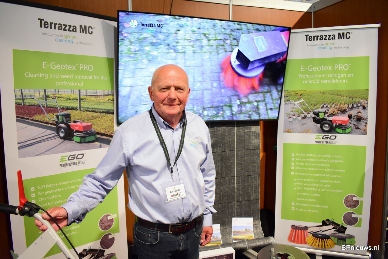 Patrick Gernaey van Terraza Mc met zijn borstels en schoonmaakmachines voor op de kwekerij. Voor ieder oppervlak heeft hij een juiste borstel die in een handeling te verwisselen is.