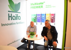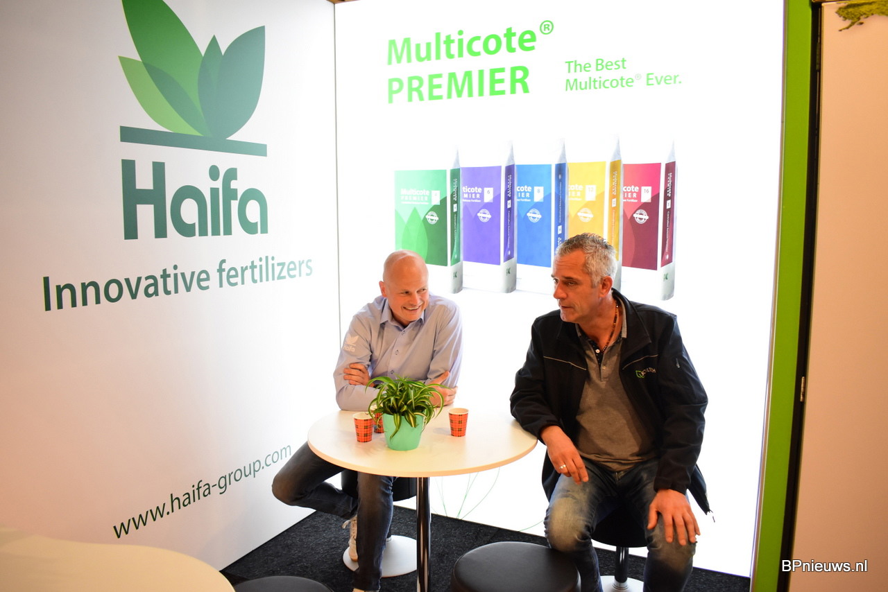 Bram van Hal van Haifa (links) in gesprek met Erwin Stokman van Soiltech (rechts).