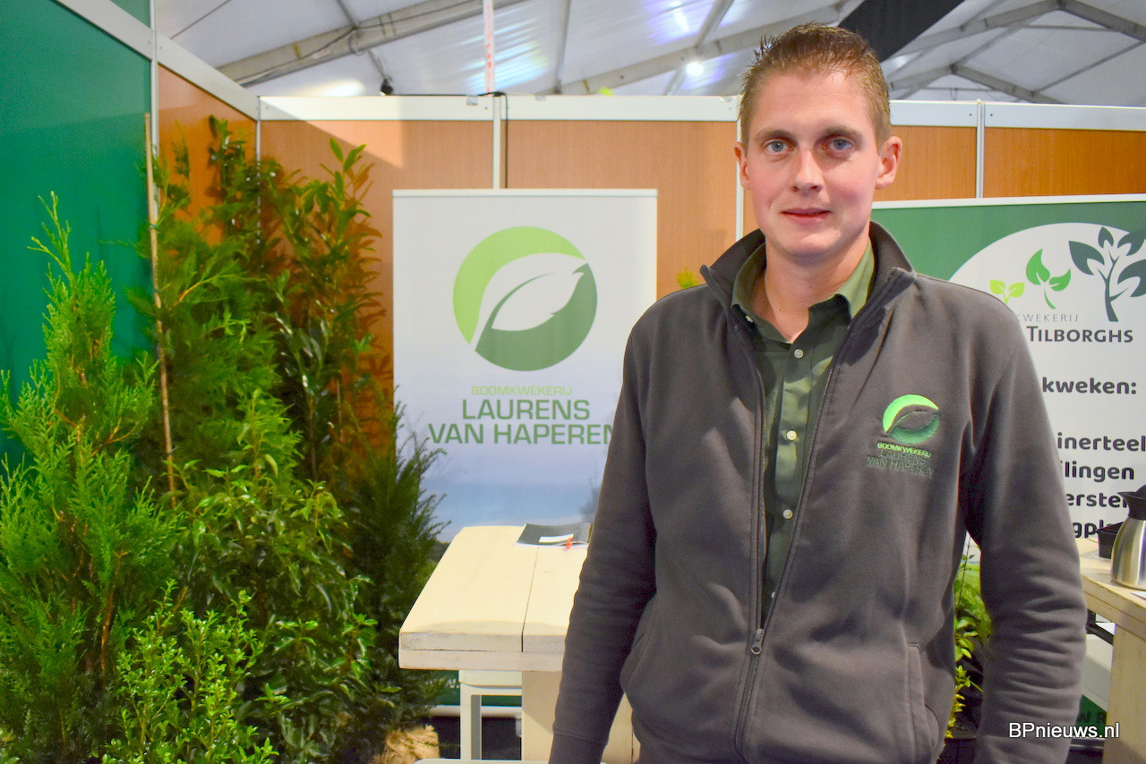 Boomkwekerij Laurens van Haperen. Laurens stond zelf op de beurs en is, net als zijn buurman, twee jaar geleden voor zichzelf gestart. Hij kweekt coniferen en heesters van 80 cm tot 2 meter. Vooral met kluit.