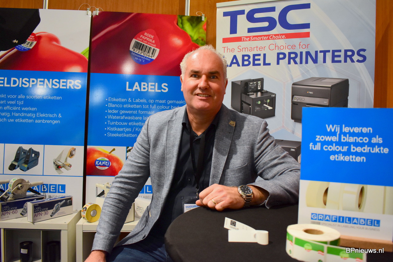 Sacha de Jonge stond op de beurs met zijn labels en printers. Hij staat voor de 8e keer op de GrootGroen en nog altijd tevreden.