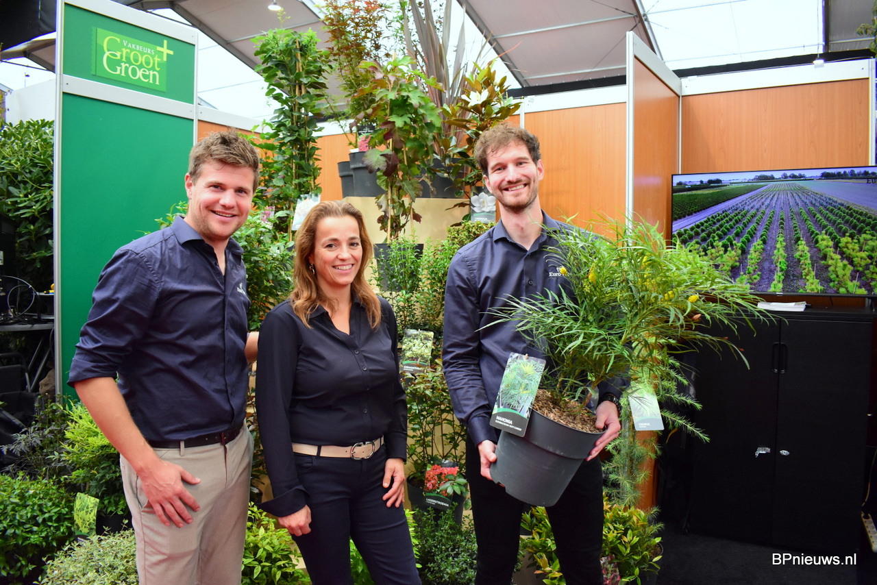 Jeroen Surminski, Lenny Christiaans en Bjorn van Megen van Euro Tree stonden op de beurs met hun sierheesters in containers, pinussen, haagplanten en snoeivormen. Euro Trees is gevestigd in de omgeving van Venlo en bestrijkt in totaal 90 hectare waarvan 10 hectare onder glas. Bjorn met hun Mahonia "Soft Caress".
