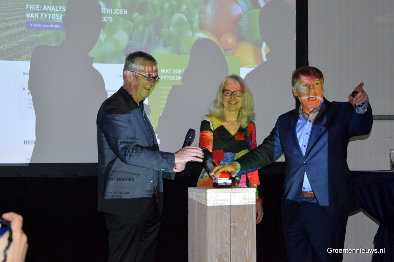 Gert Mulder (GroentenFruit Huis), Anneke van Dijk (LTO Nederland) en Sjaak van der Tak (Glastuinbouw Nederland) op het podium om FytoCompass te presenteren.