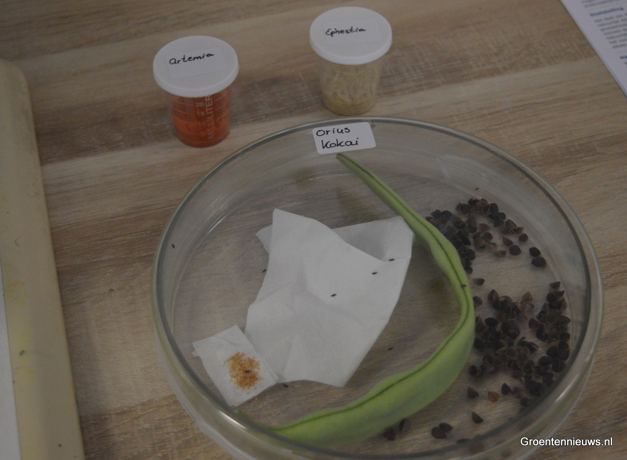 Orius Kokai krijgt voeding mee om langer actief te blijven. De biologische bestrijder wordt gevoed met Artemia en Ephestia.