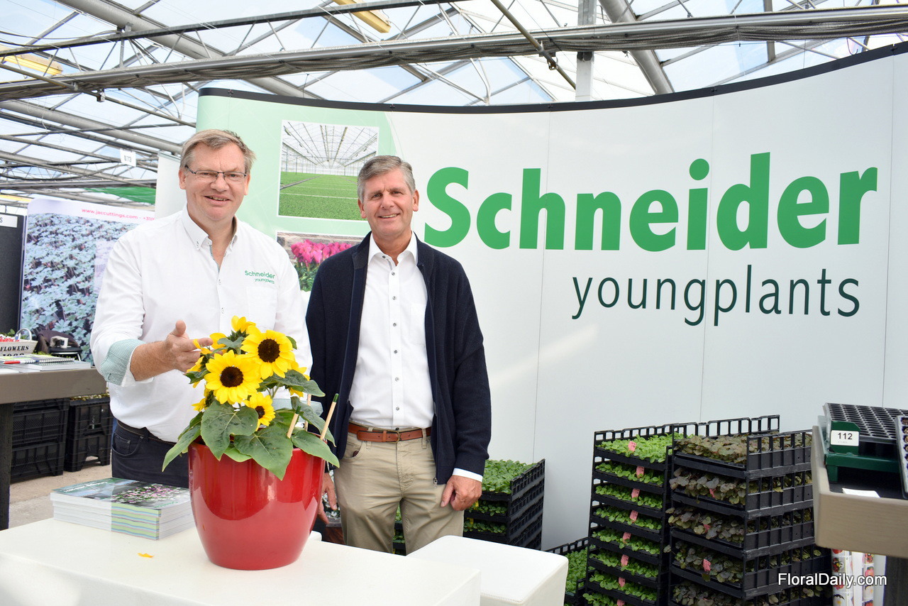 Stephen Fones en Anton Hooijmeijer van Schneider Youngplants presenteren de Helianthus Sunsation van Benary, een 'genetisch super compacte dwerg zonnebloem'.