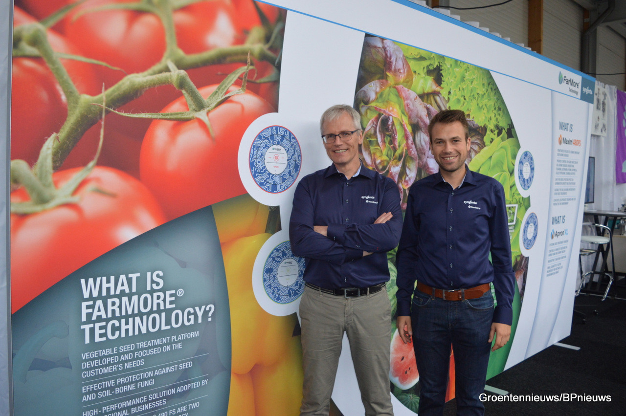 Peter Wessels en Pieter Bogaerts (Syngenta Seedcare) stonden op Seed meets Technology om uit te leggen wat FarMore Technology kan bijdragen aan het gezond opkomen van groentegewassen.