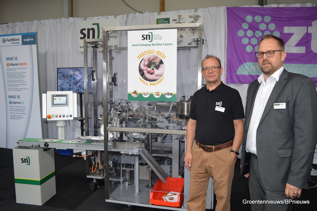 Thomas Anton en Dirk Müngersdorf (SN Maschinenbau) brachten een machine mee op zaden te doseren en te verpakken, met name ook in kleinere hoeveelheden voor consumentenverkoop.