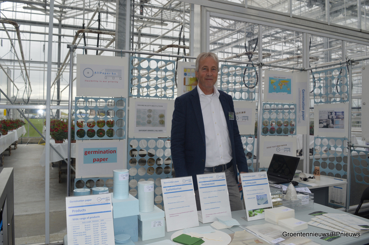 Theo Loeters van Allpaper had een breed assortiment aan papier bij zich waarmee zaden worden getest.