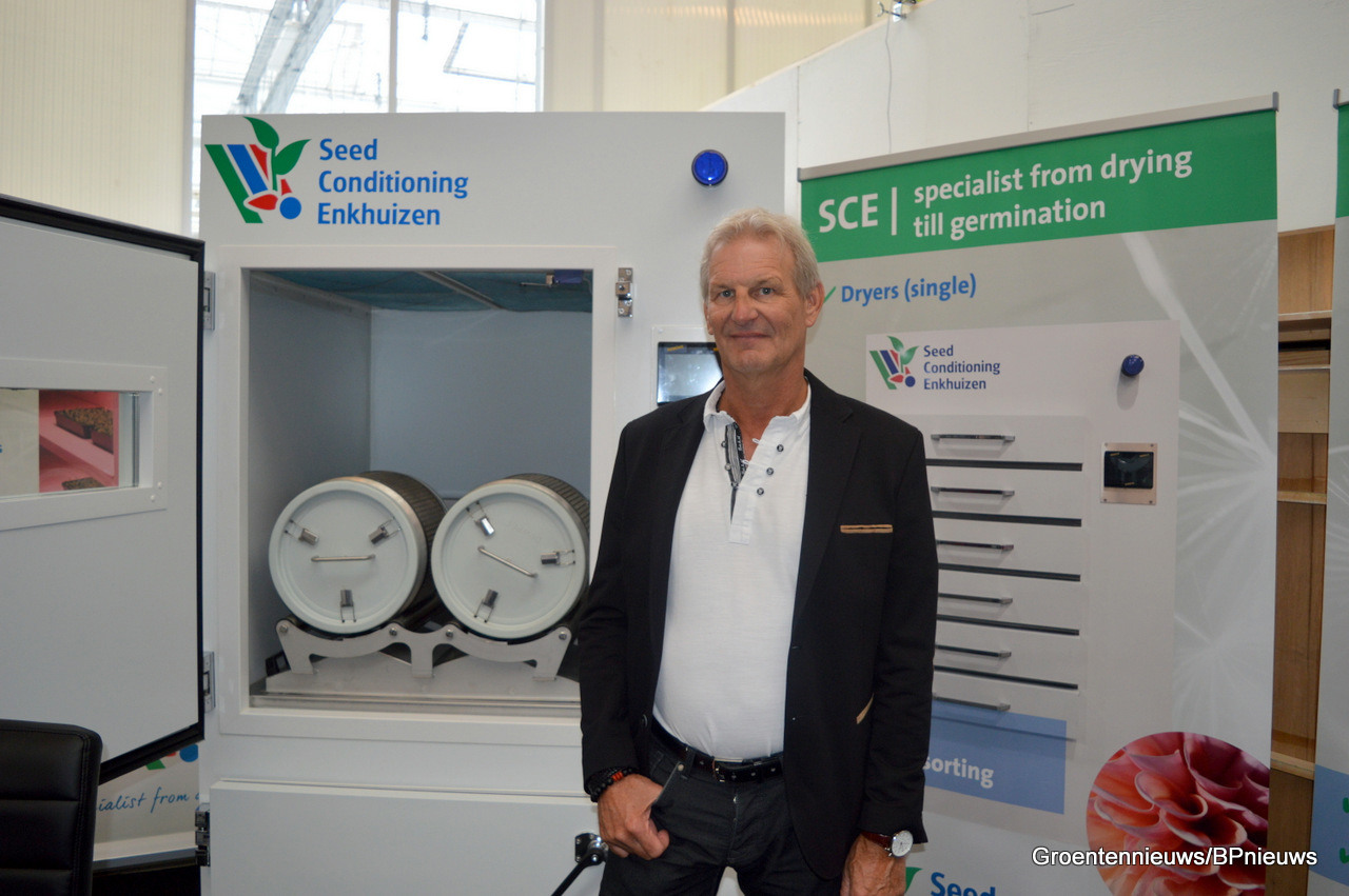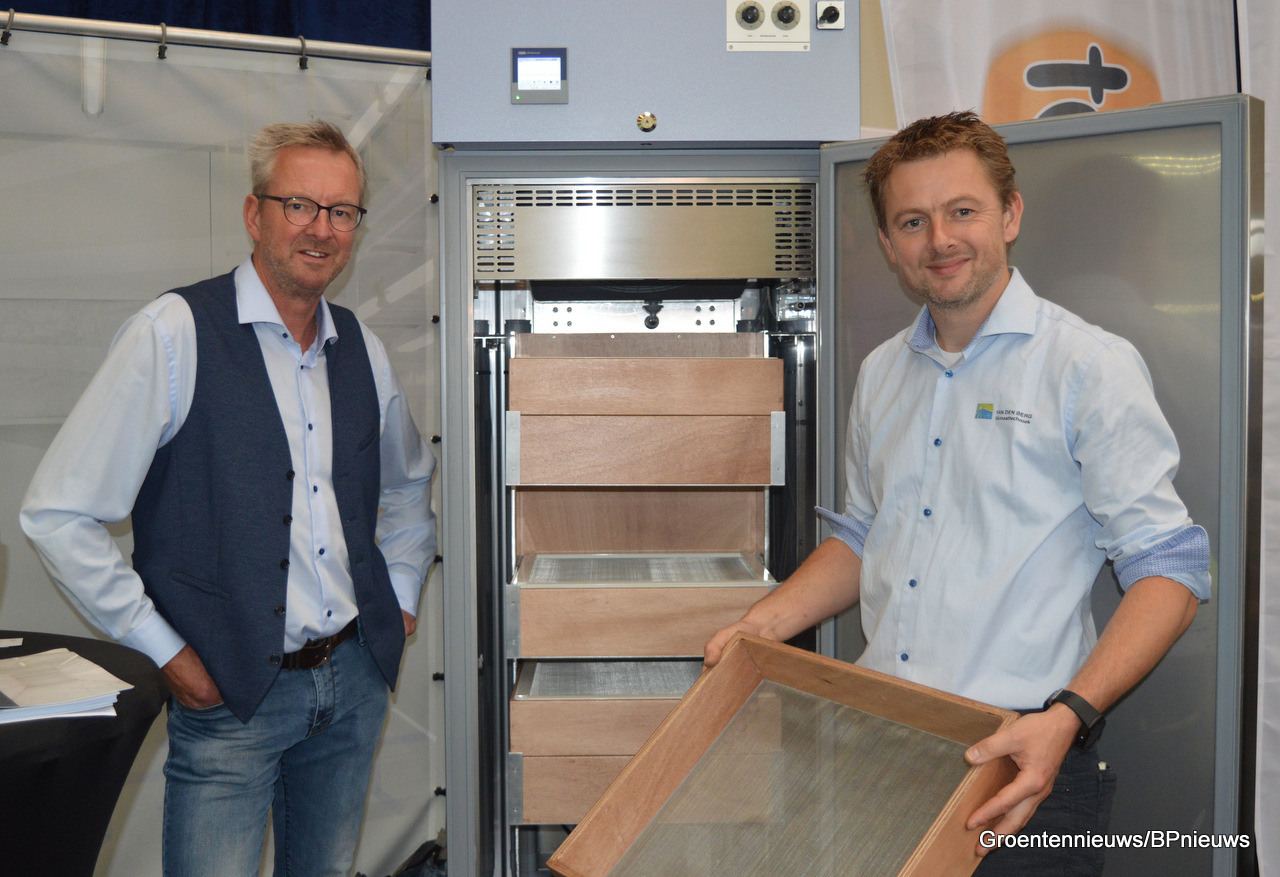 Van den Berg Klimaattechniek, hier met op de foto Jacco van Wieringen en Stephen Geenen, bij een droogkast met daarin een nieuw, extra fijnmazig gaas om bloemenzaden mee te drogen. De droogkast is daarbij ook uitgerust met een nieuw foefje, namelijk een frequentiegestuurde ventilator die een dusdanig boost kan geven dat de zaadjes automatisch gekeerd worden, met de hand zaden omwoelen is dus niet meer nodig.