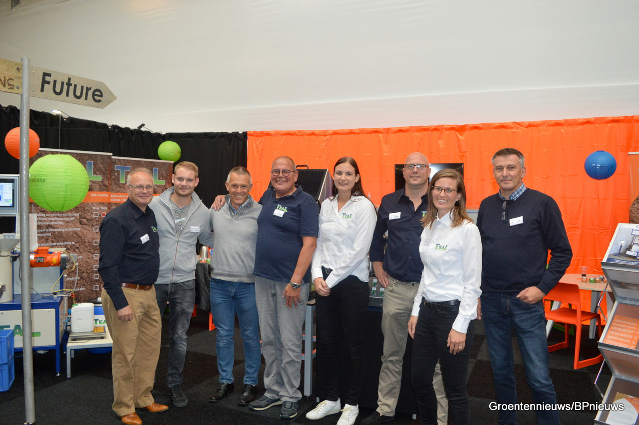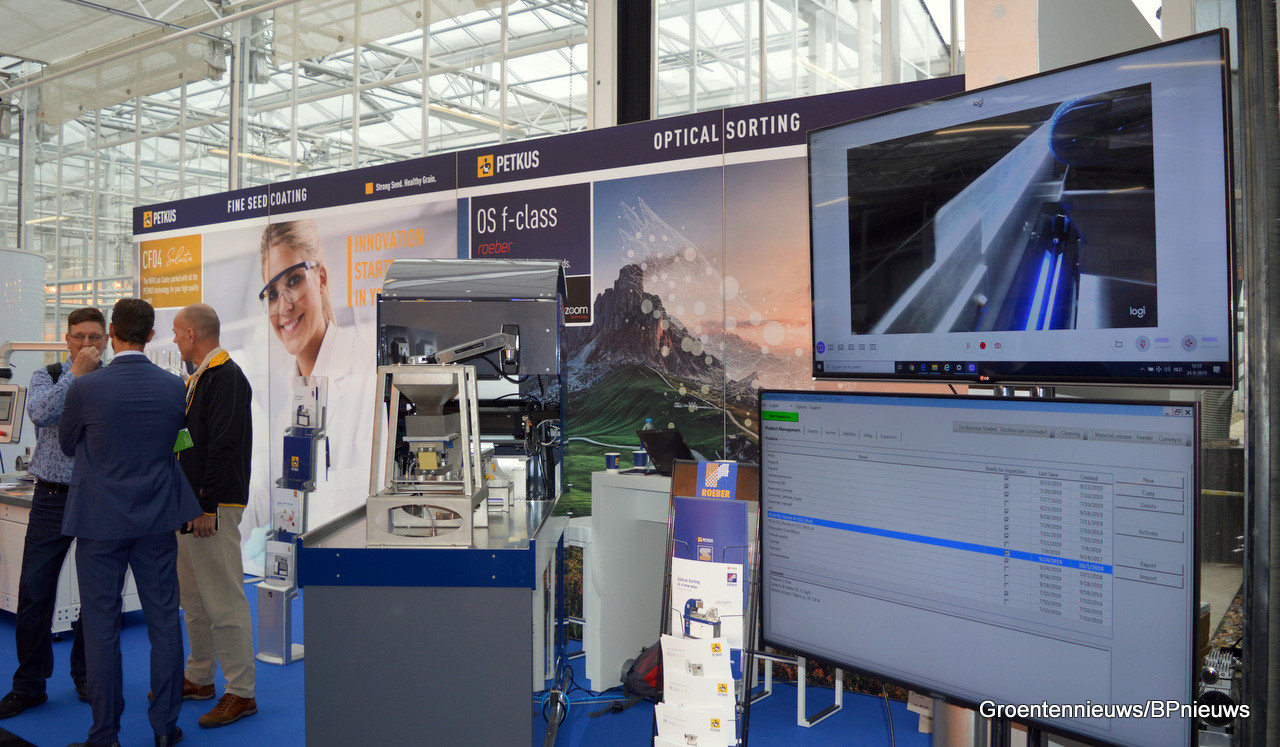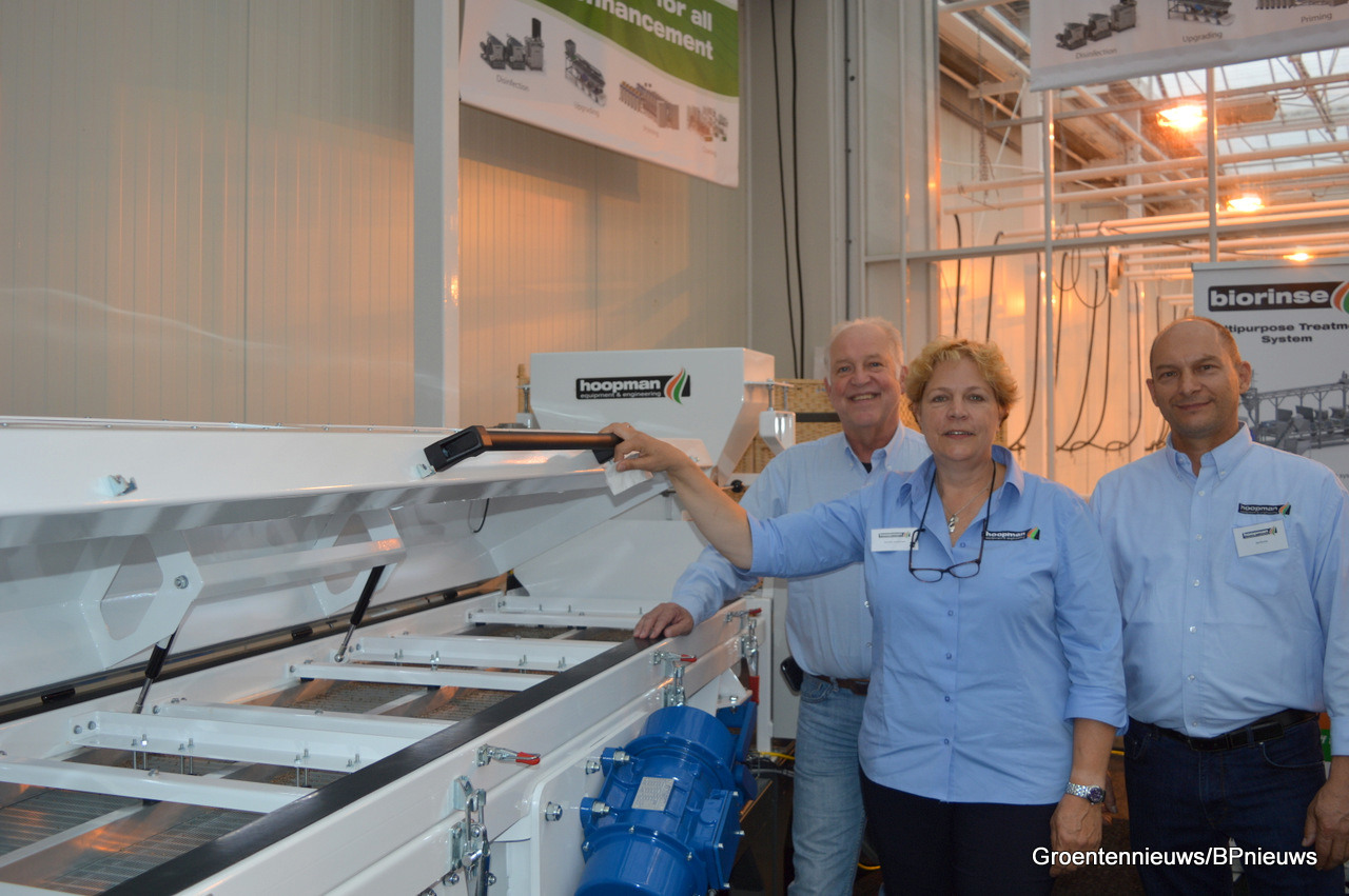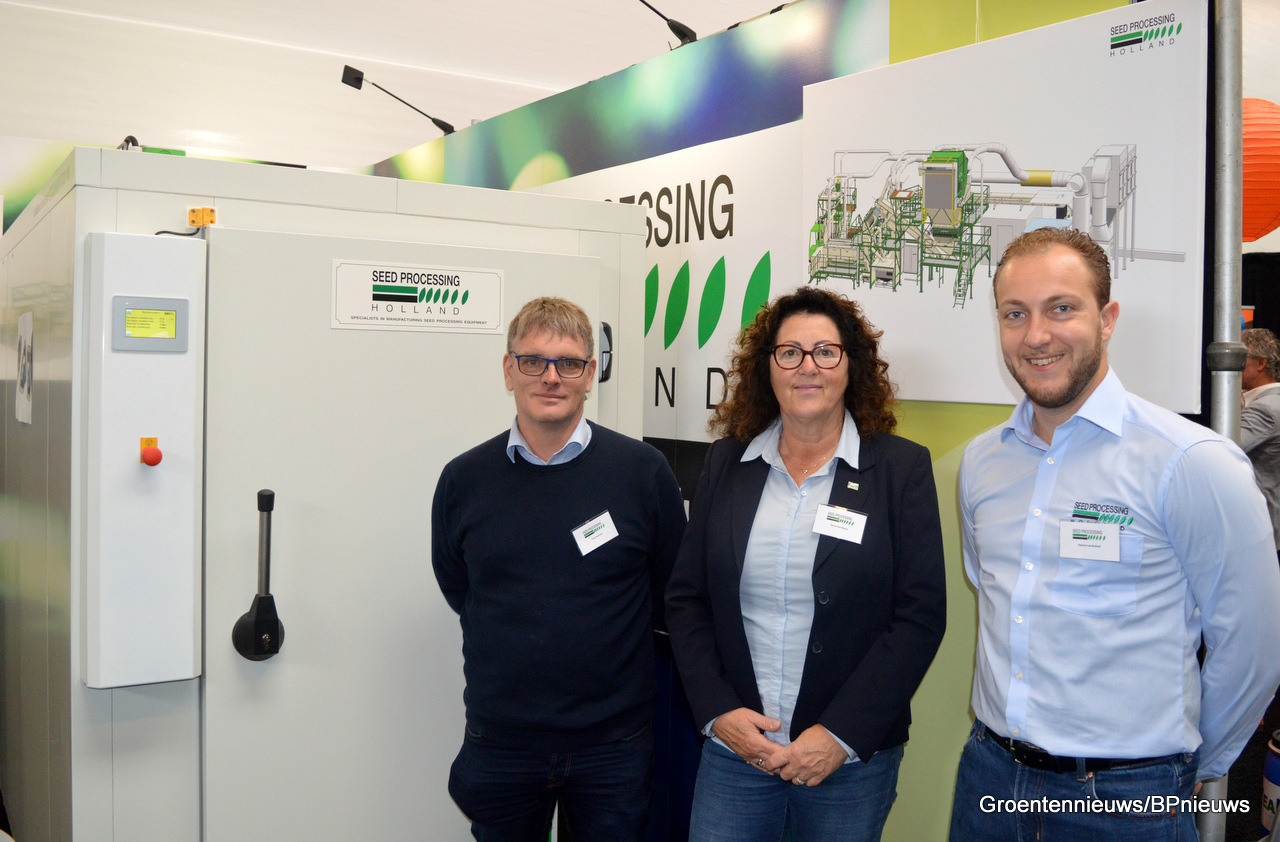 Hoopman Equipment & Engineering, met op de foto Jan Willem Hoopman, Marieke van Gorssel en Jan Eenink, had de VCS-600 klaibratiemachine meegenomen, waarmee zaden gezeefd en daarmee gekalibreerd worden.