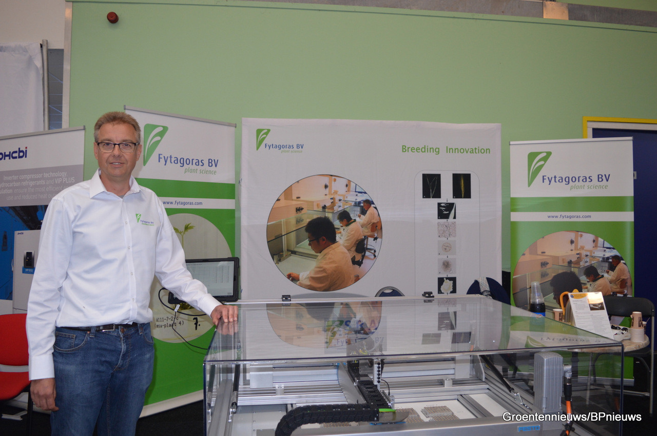 Hans Keijzer van Z.T.I. Smart Machines geeft uitleg bij een prototype zaadselectierobot