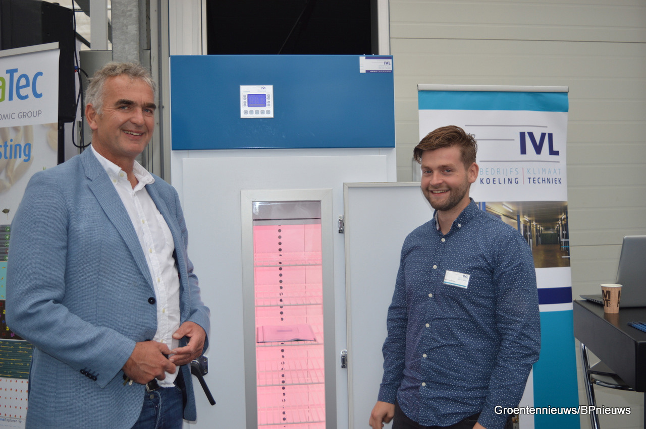 Hans van Leeuwen en Steven van Vulpen (IVL Bedrijfskoeling B.V.) bij een klimaatkast, waarvan het bedrijf er in verschillende uitvoeringen, vooral over de verlichting heeft de klant volgens de mannen vaak specifieke wensen, de wereld over stuurt.