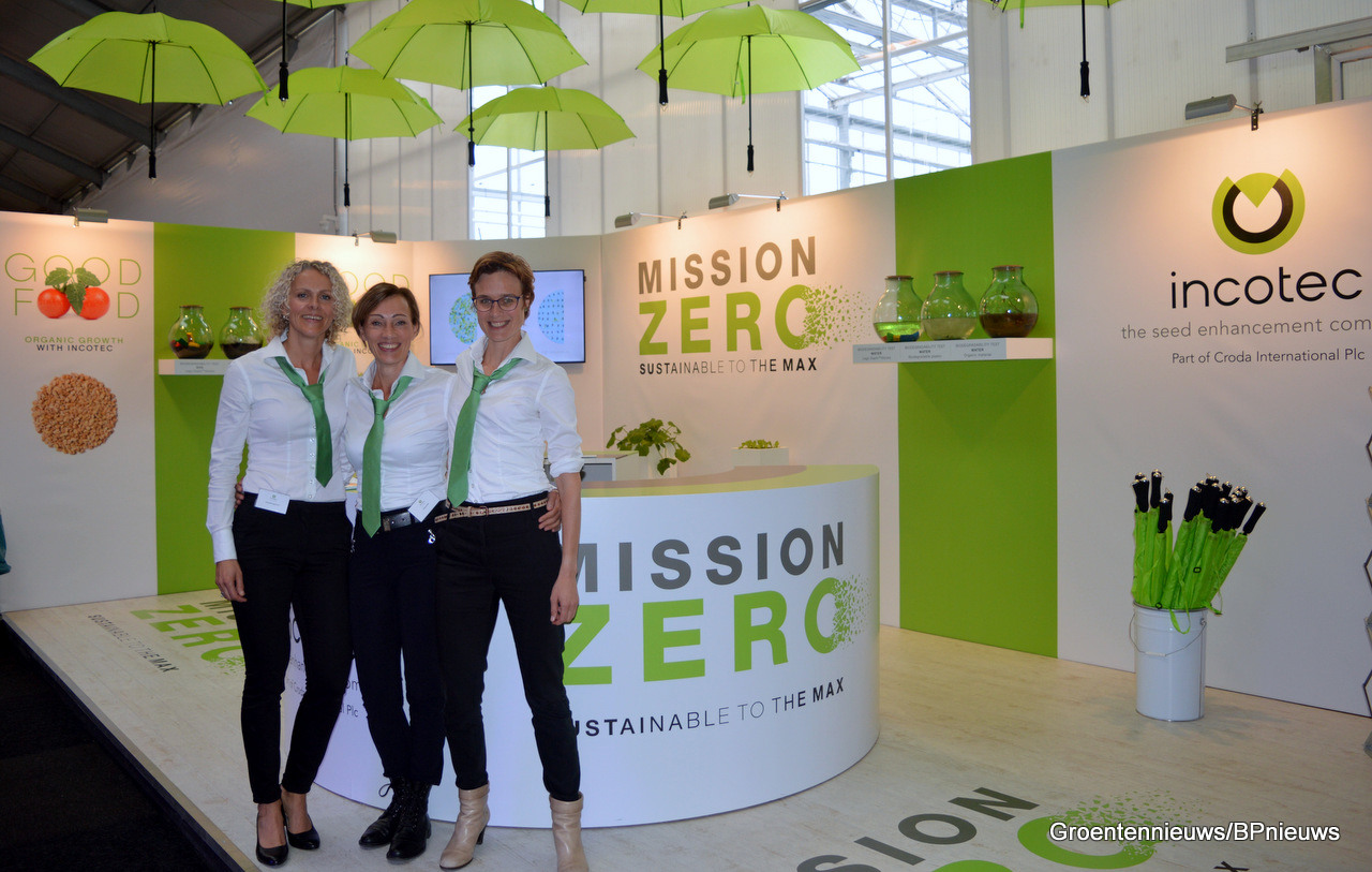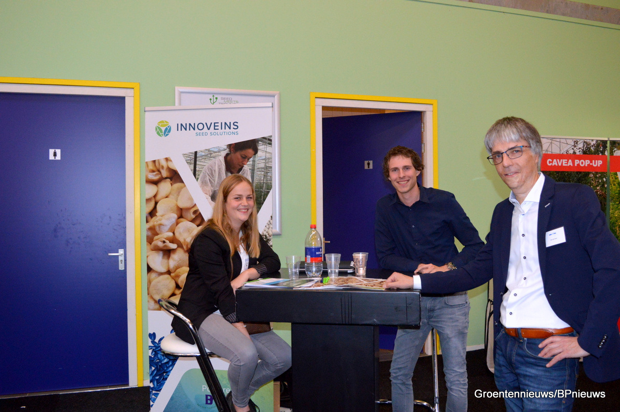 Rien den Boer (Aris) op bezoek in de stand van Innoveins Seed Solutions die werd bemand door Conny Vervoort en Niels Peeters.