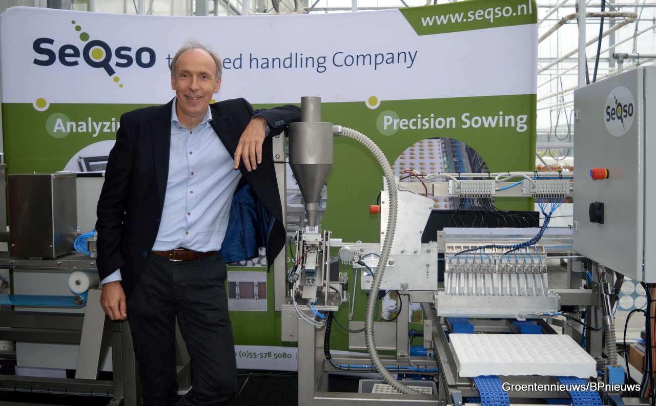 Fred Hugen (SeQso) bracht een machine mee om ‘naakte zaden’ met grote precisie te zaaien, dat wil zeggen, met een foutmarge van minder dan één procent. Handjes zijn dan niet meer nodig.