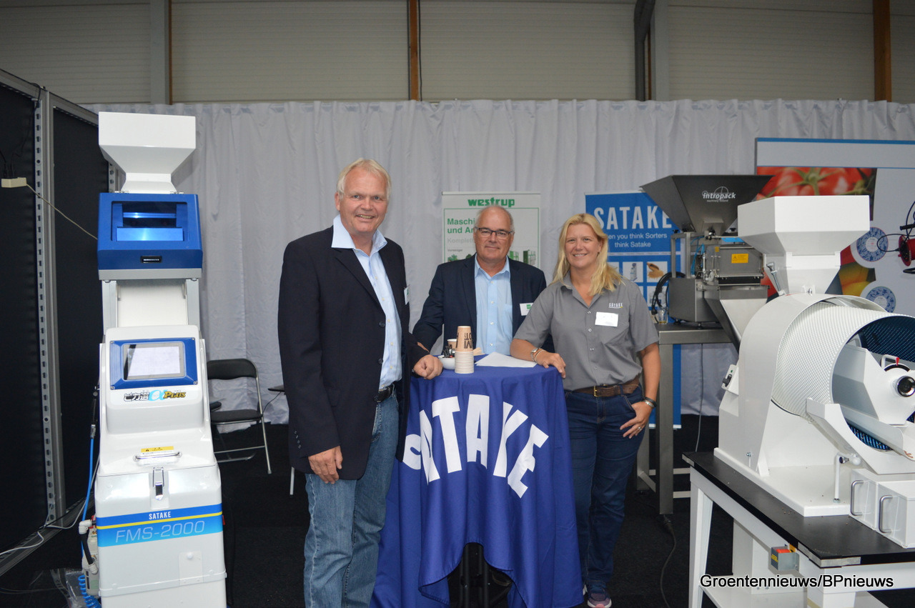 Frank Düing, Arne Christensen (Westrup Anlagenbau GmbH) en Vanessa Schofield (Satake Europe Limited). Satake levert zaadsorteertechniek waarmee op full color en op vorm gesorteerd kan worden. De mannen van Westrup zijn daarentegen gespecialiseerd in zaadschoningstechniek.