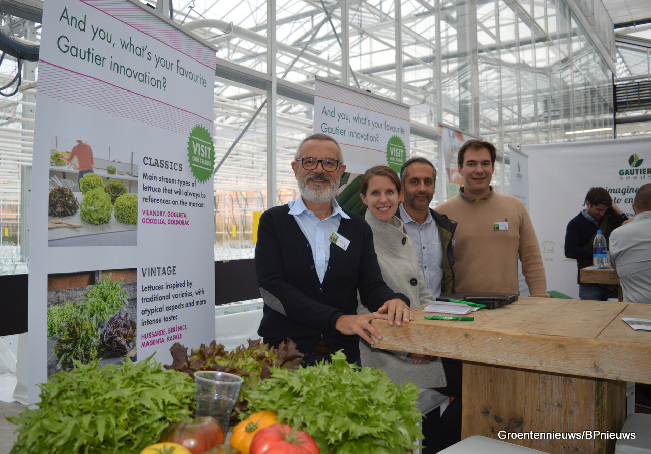 Groenten op de voorgrond, een lachend team van Gautier Semences op de achtergrond.