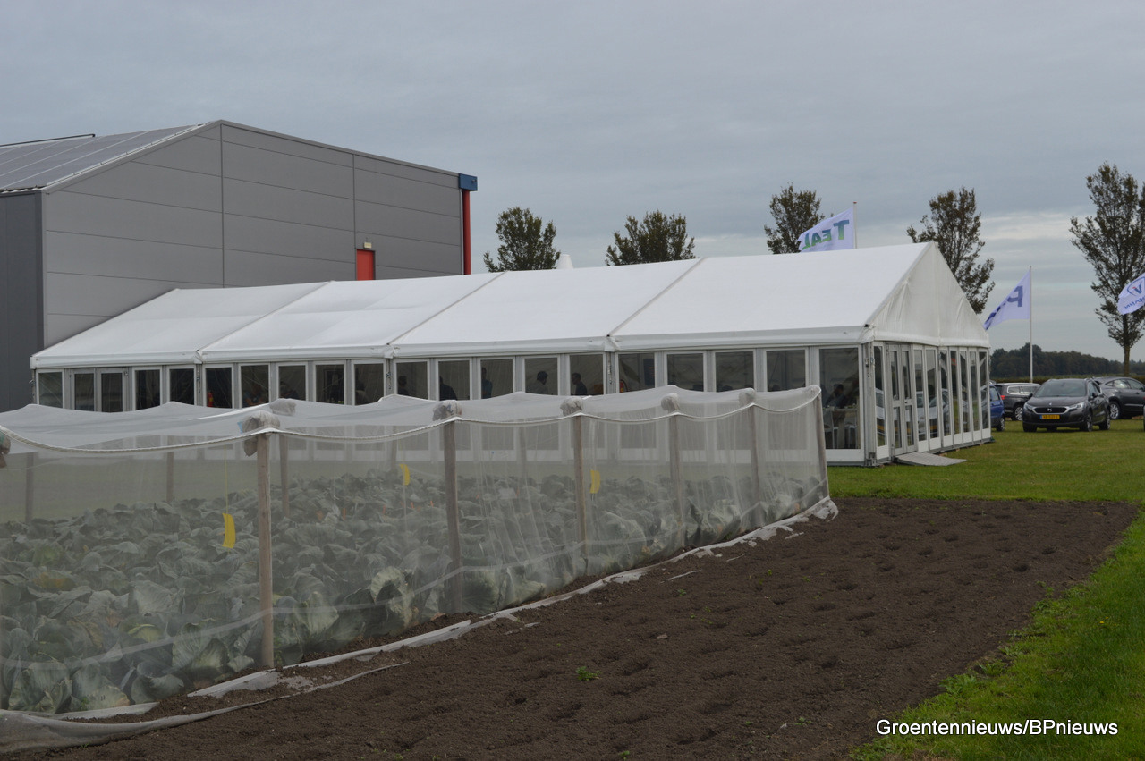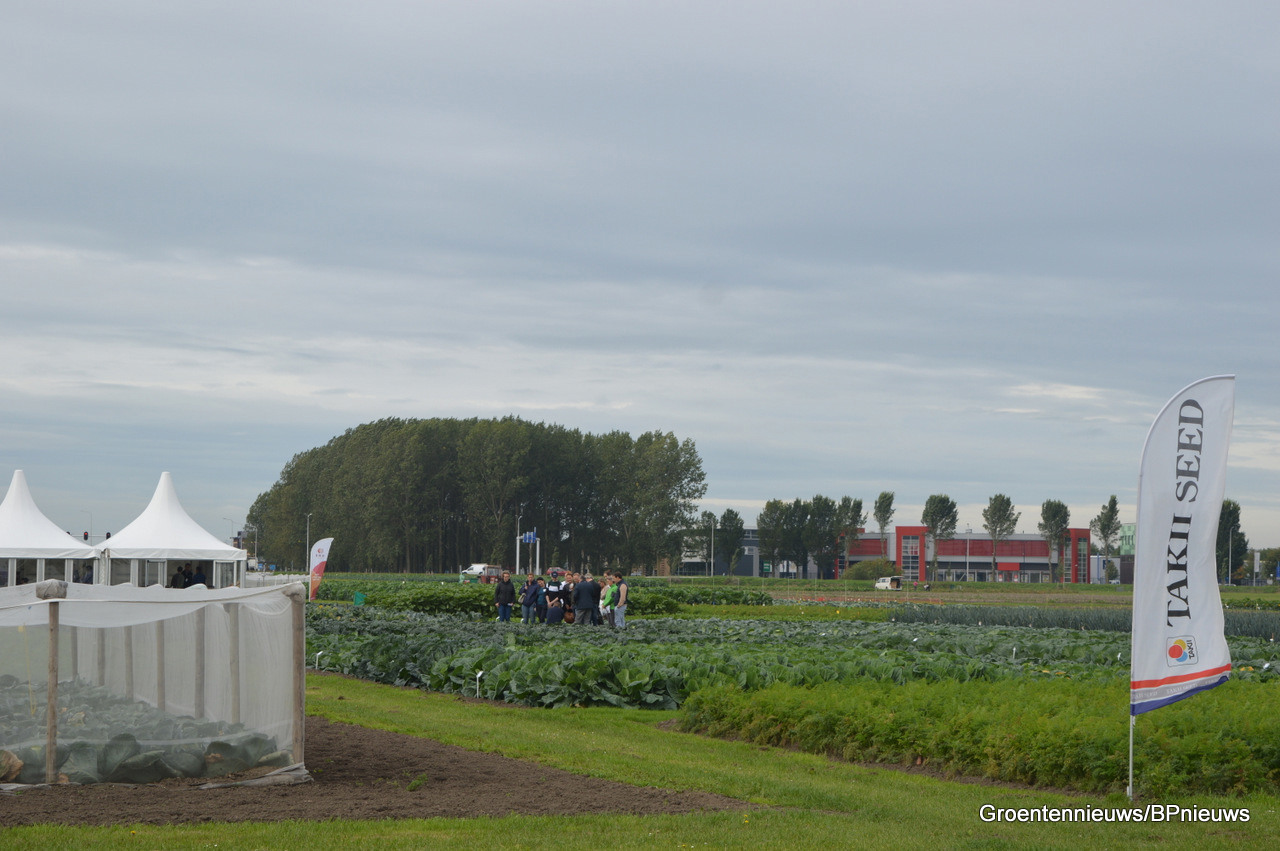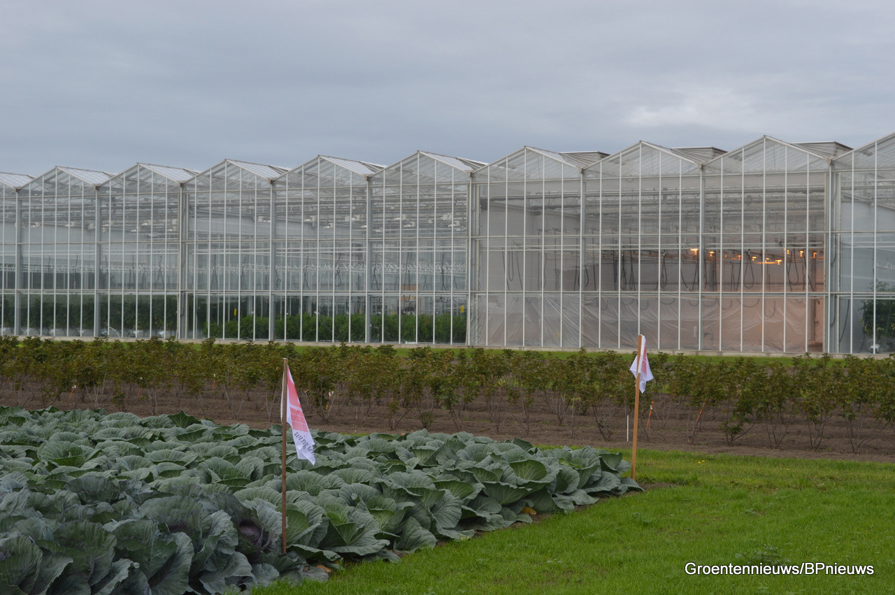 Een hoekje demoveld van Wing Seeds met op de achtergrond de kassen van Proeftuin Zwaagdijk