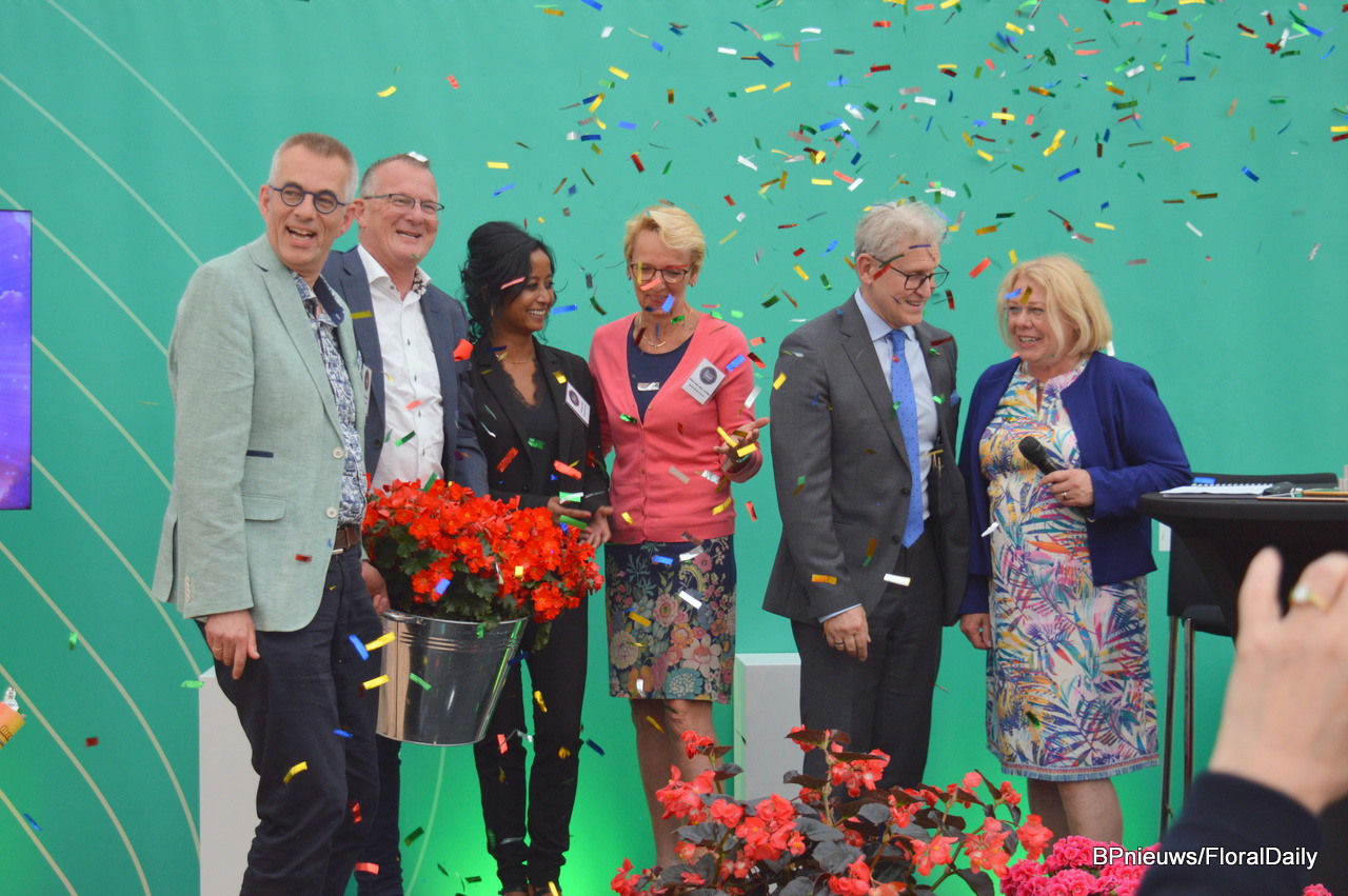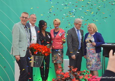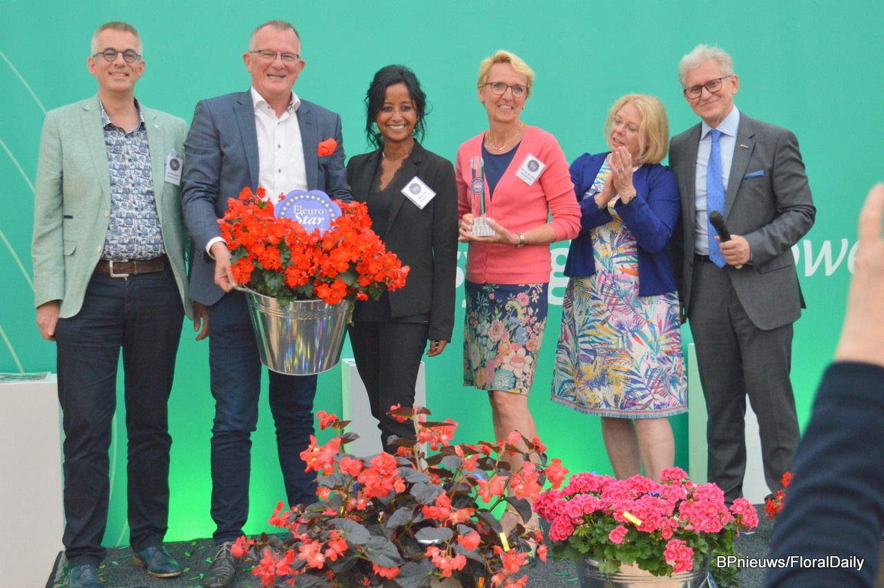 Cor Bremmer, commercieel directeur ornamentals; Marc Driessen, directeur ornamentals; Sirekit Mol, marketing manager; Ans van der Velden, hoofd veredeling – allen van Beekenkamp Plants; en Heike Gronemann, voorzitter van de FleuroStar jury en Karol Pawlak, president van FleuroStar
