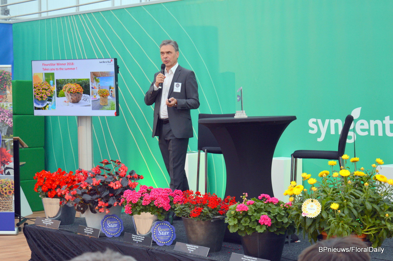 Klaus Gaumann, directeur marketing bij Selecta one, die vorig jaar met de Purple Sun de FleuroStar Award won. Hij vertelde dat men na het winnen van de award eerst een goed feestje gebouwd heeft, maar dat men daarna versteld stond van de vele aandacht die FleuroSelect en de verschillende media voor het product wisten te genereren. Vervolgens heeft het bedrijf het afgelopen jaar simpelweg veel meer osteos verkocht dan daarvoor.