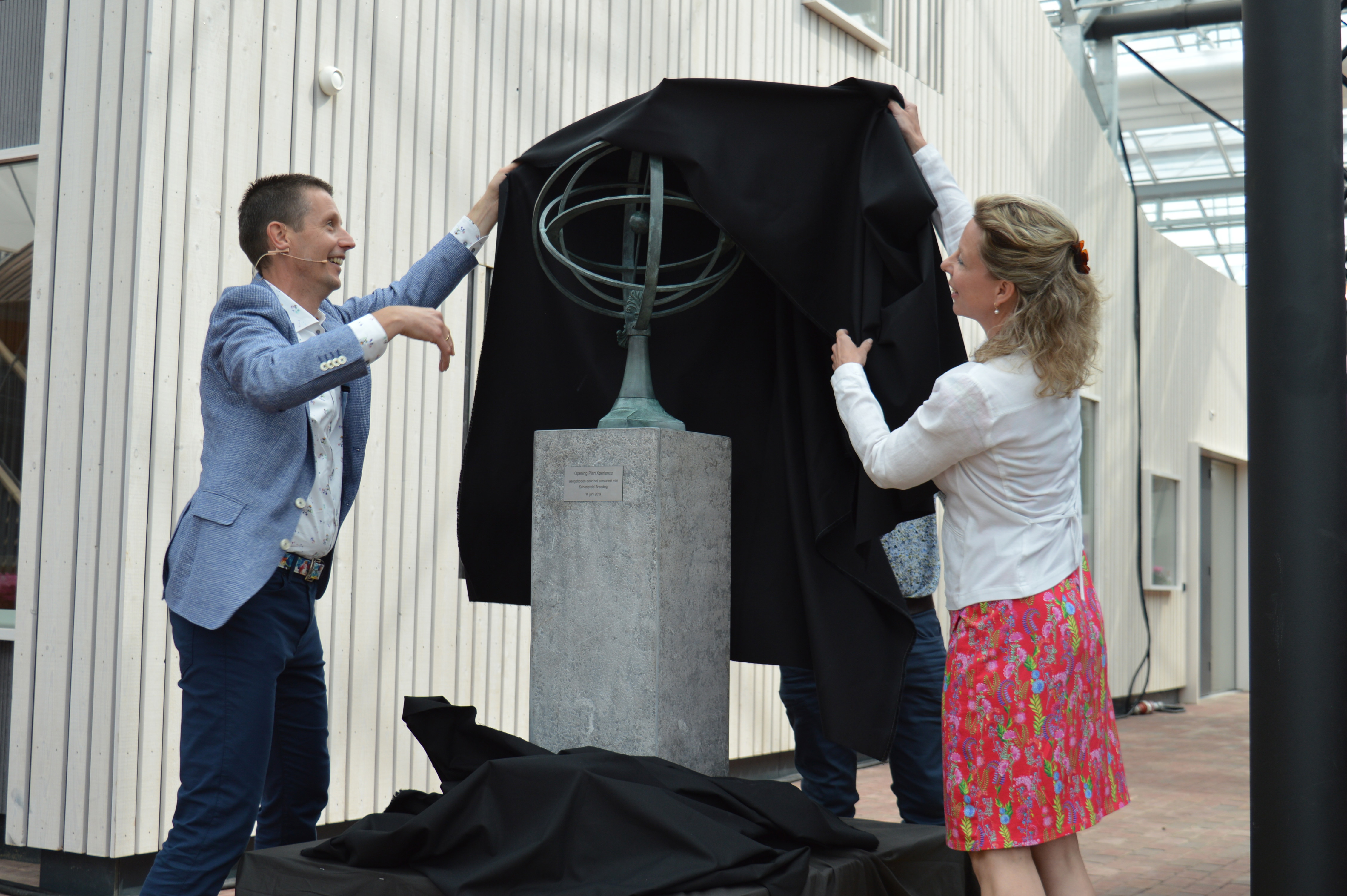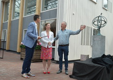 Namens het personeel kregen Peter en zijn vrouw Daniëlle deze zonnewijzer overhandigd.