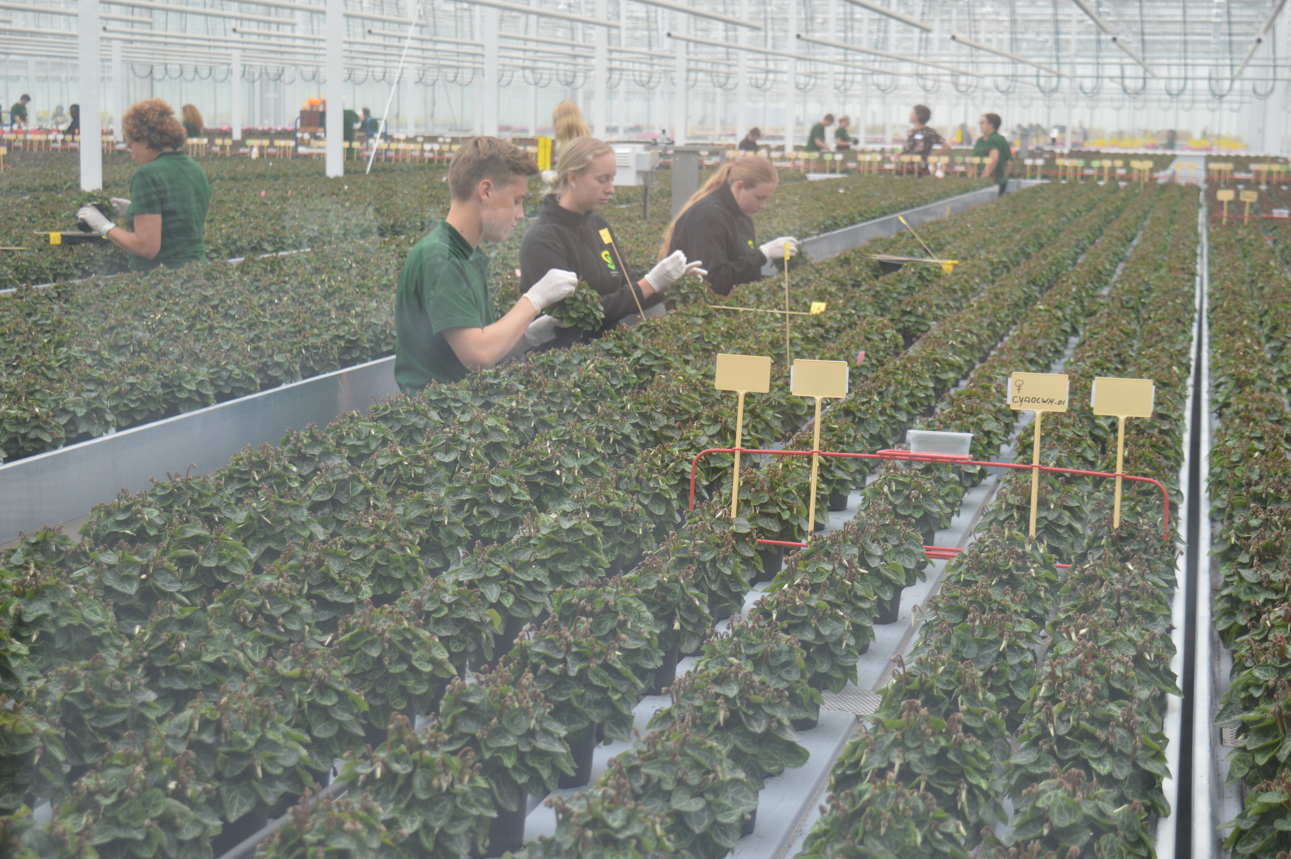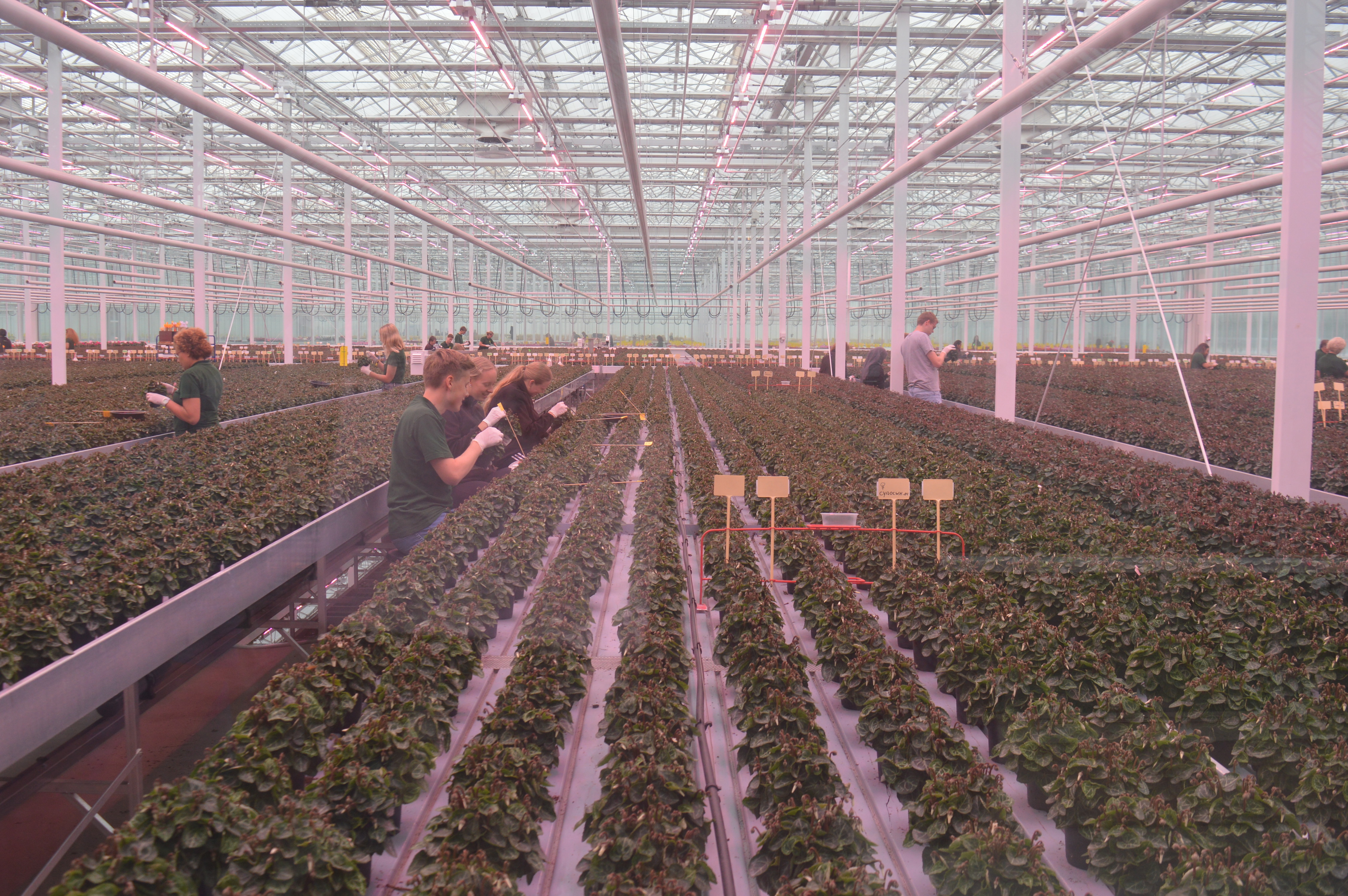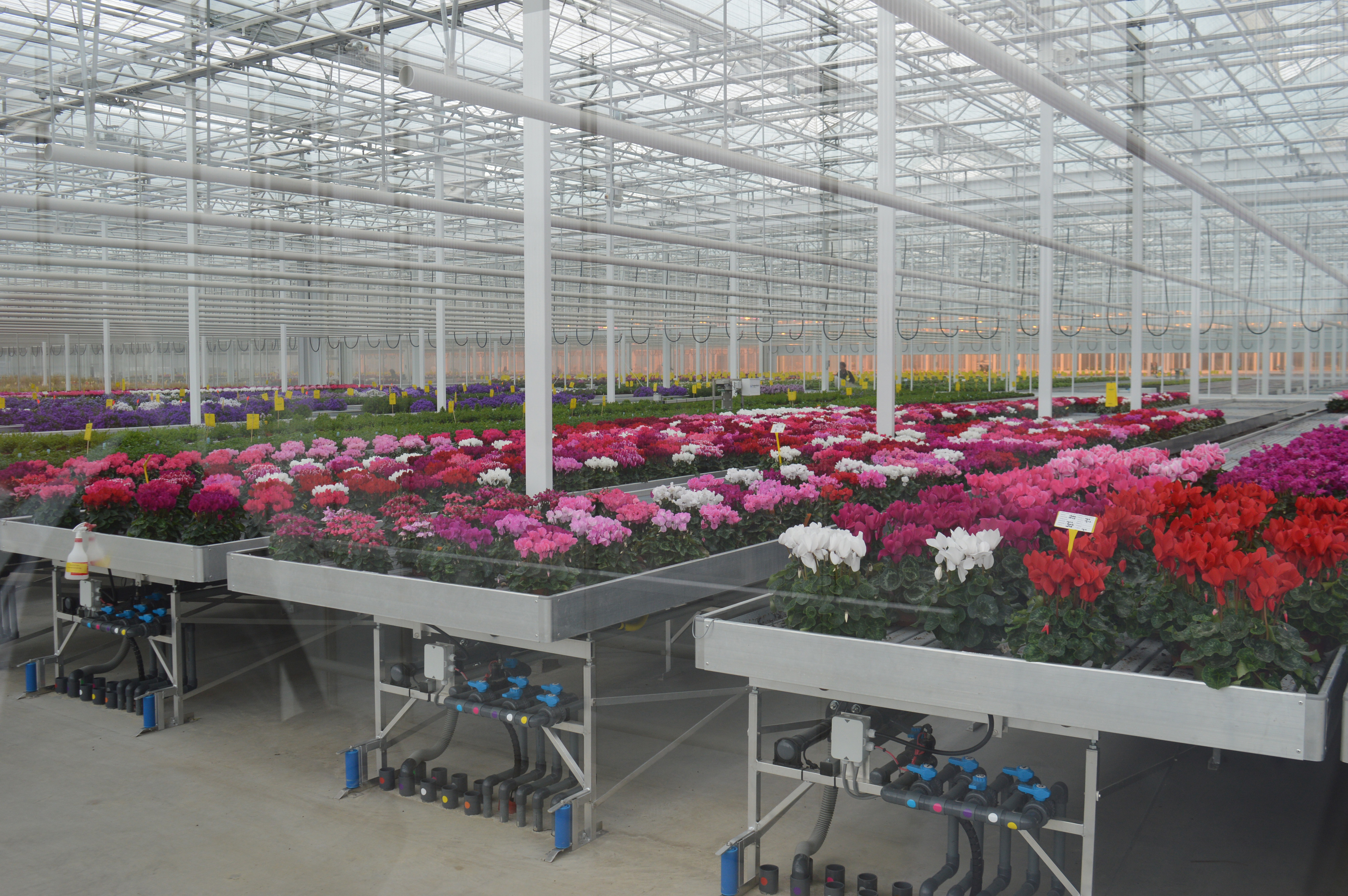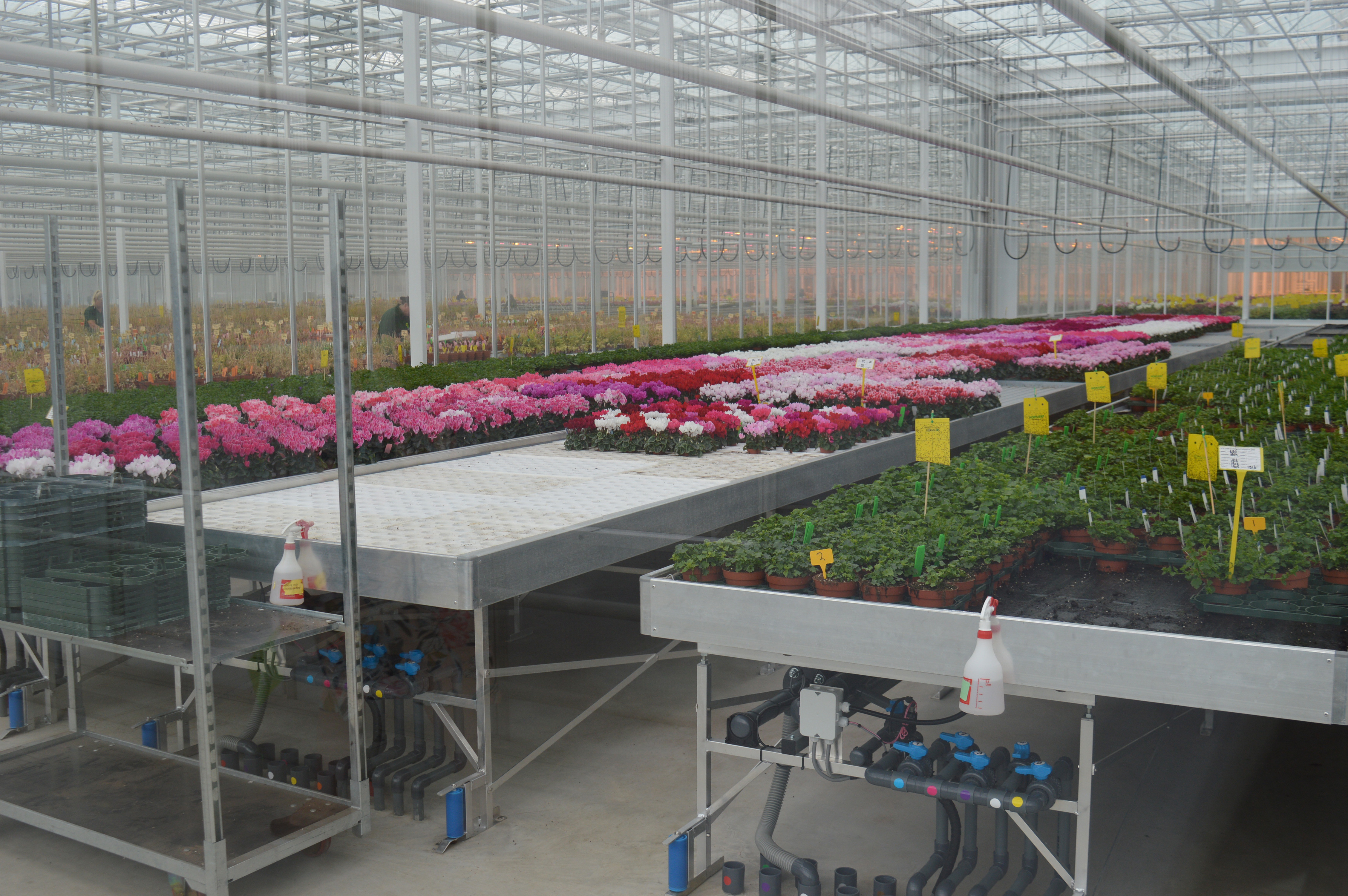 Per afdeling zijn, afhankelijk van het gewas dat er staat, schermen, lampen en überhaupt de gehele kasindeling op maat gemaakt. Hier, in de afdeling cyclamen, is o.a. ook geïnvesteerd in LED.