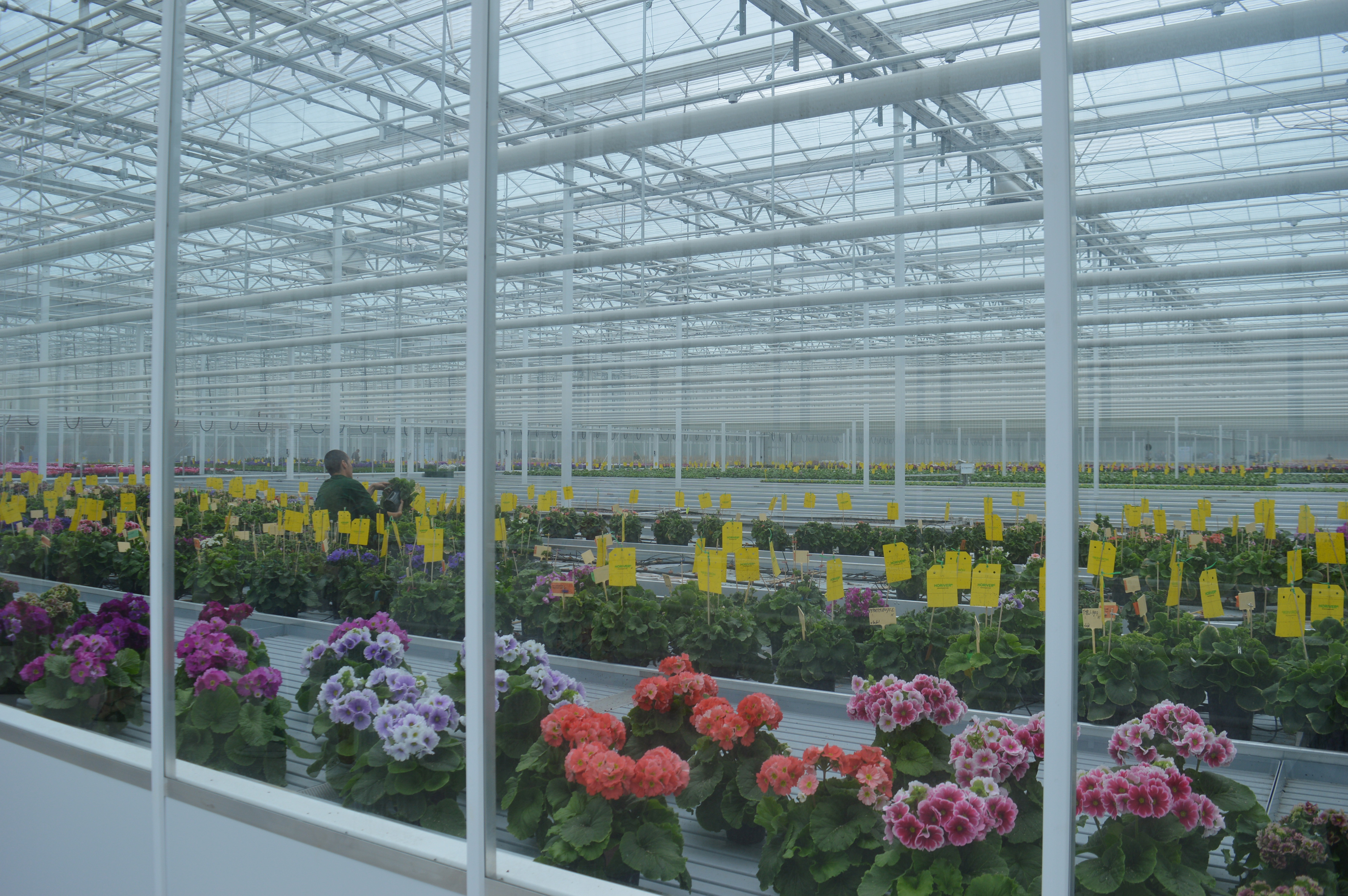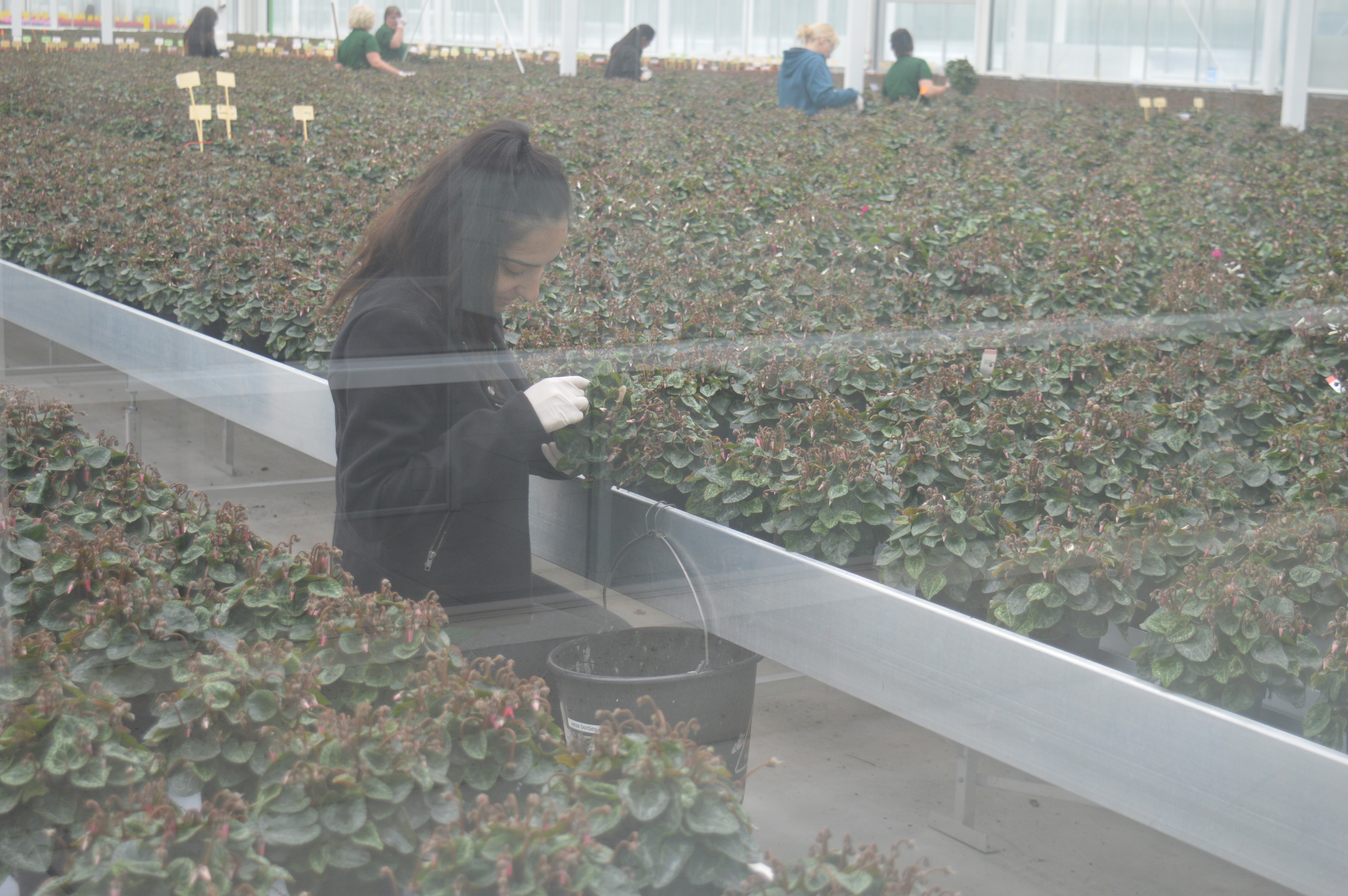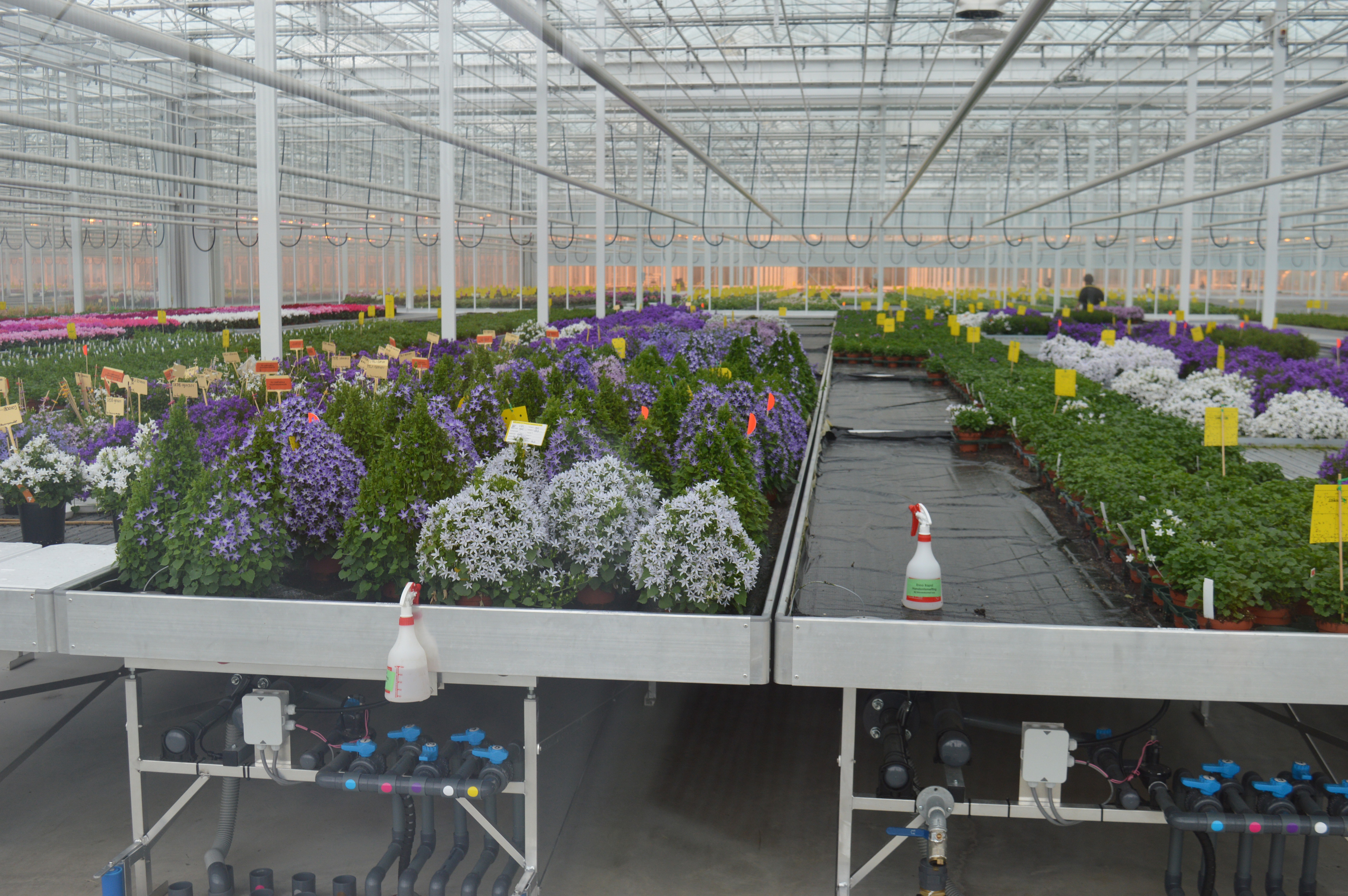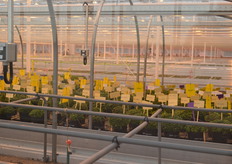 Per afdeling zijn, afhankelijk van het gewas dat er staat, schermen, lampen en überhaupt de gehele kasindeling op maat gemaakt. Hier, in de afdeling cyclamen, is o.a. ook geïnvesteerd in LED.