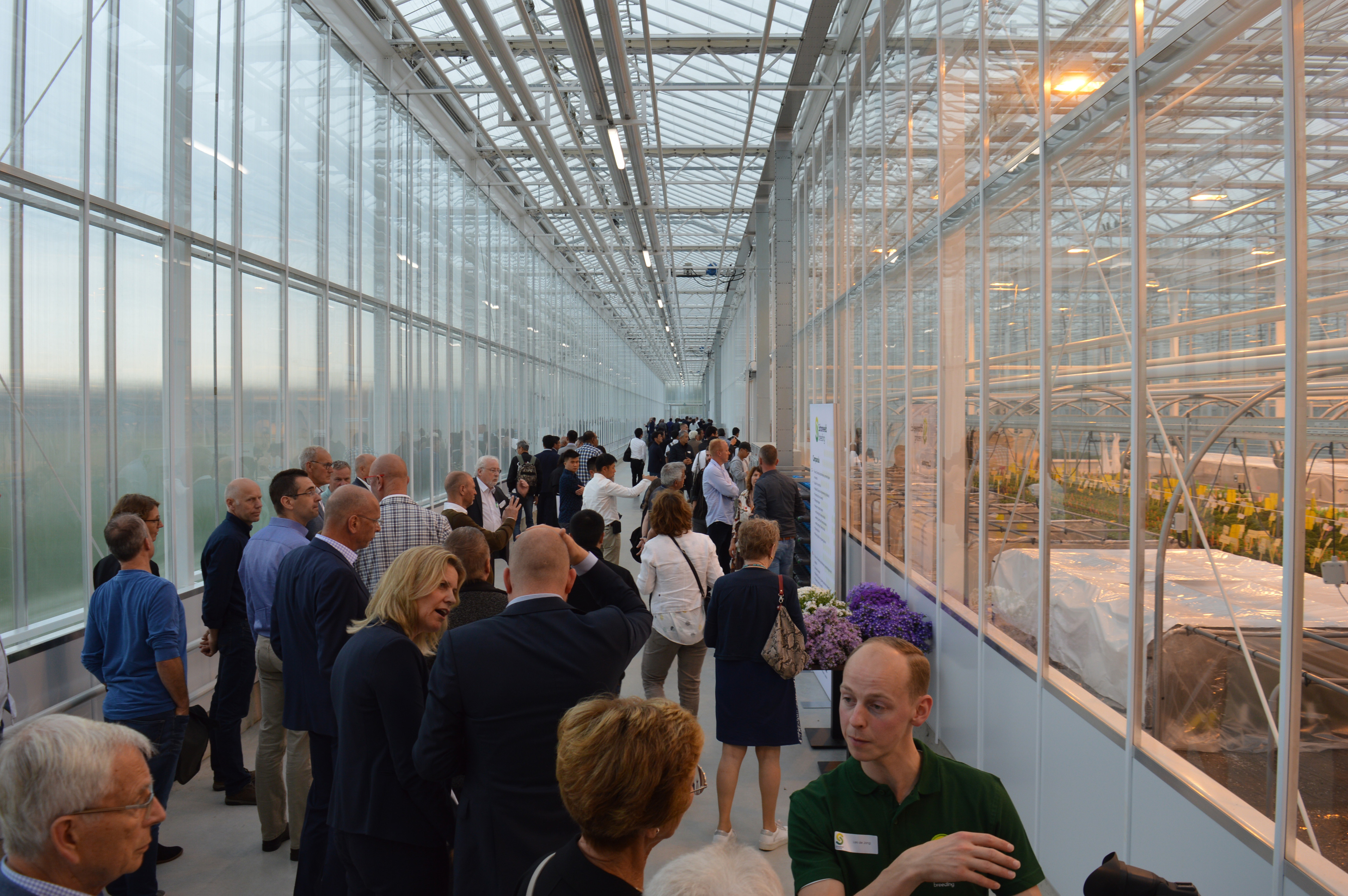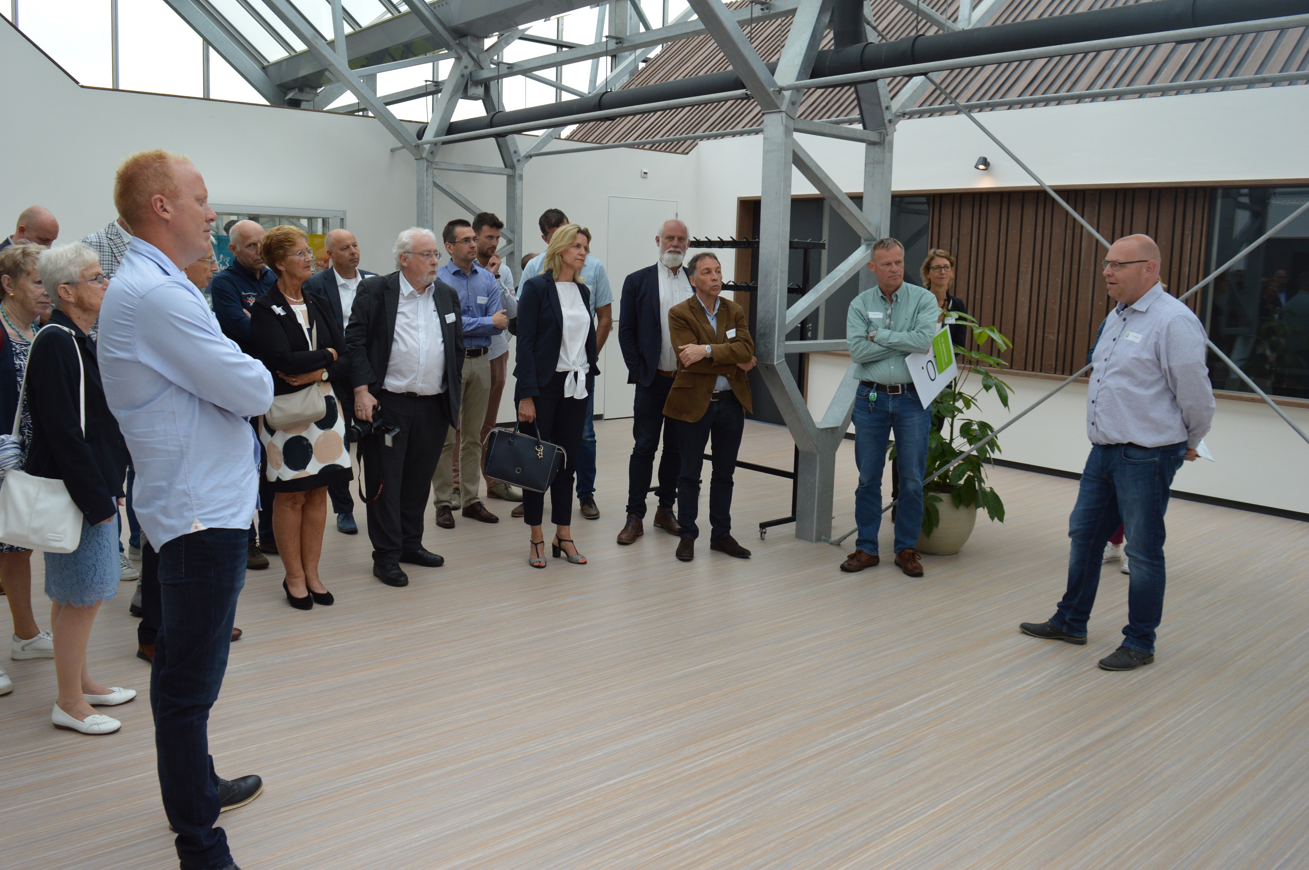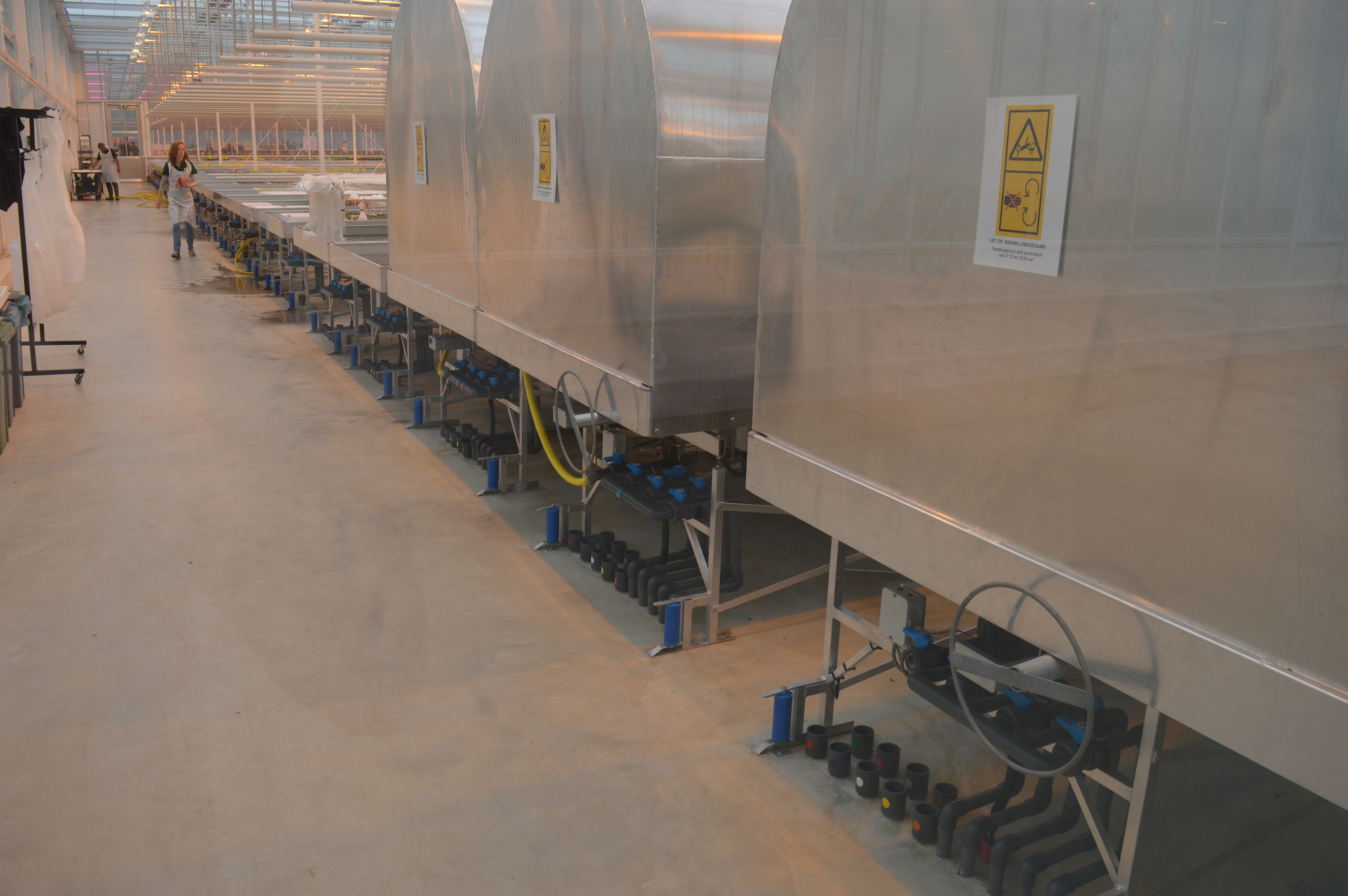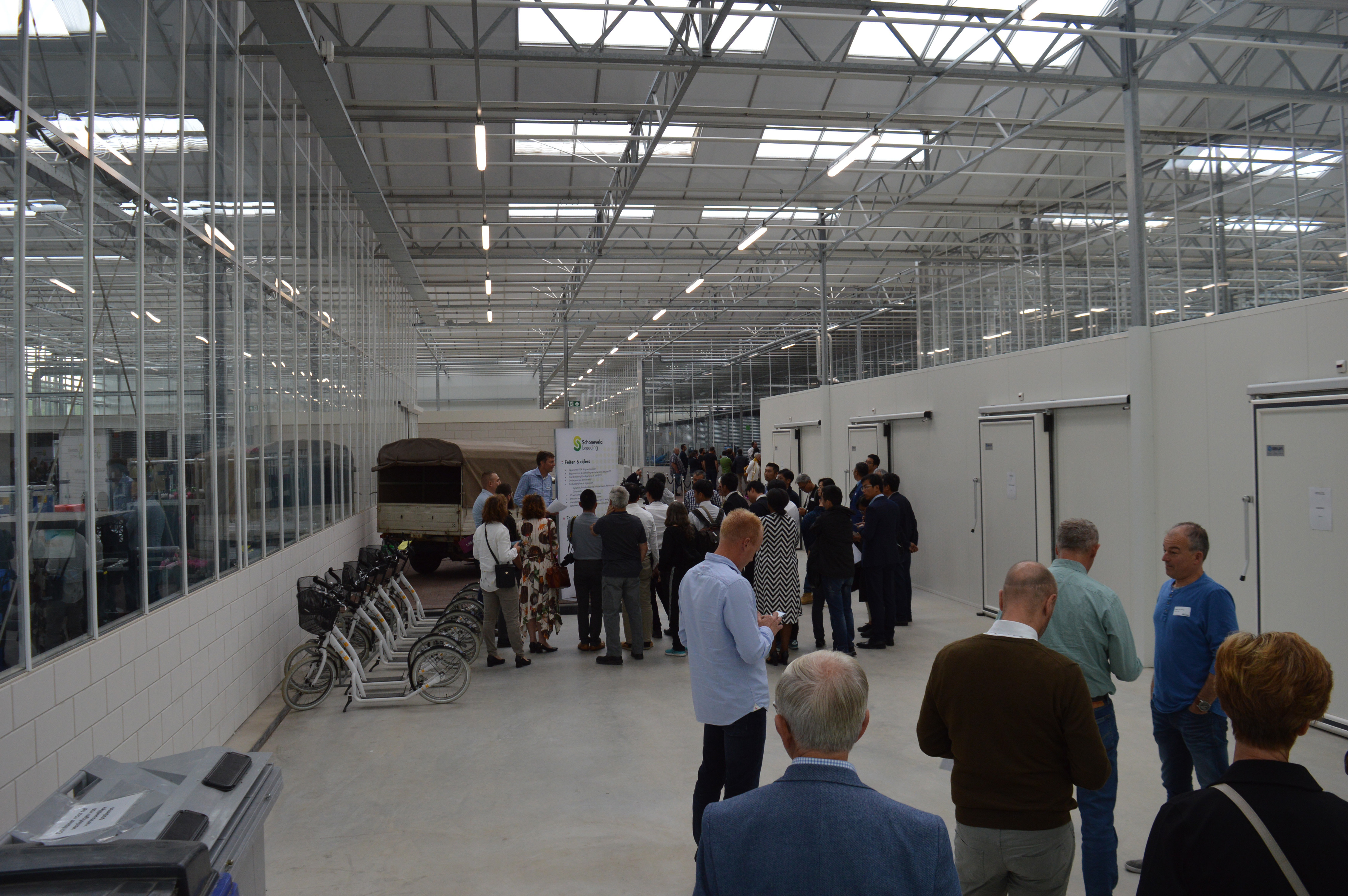 In tien verschillende groepjes maakte men vervolgens een rondje door het bedrijf. Er is niet beknibbeld op die zaken die het geheel tot een aan alle duurzaamheidseisen beantwoordende onderneming maakt, vertelt Lianne Hutten. Zo is de waterkringloop volledig gesloten en komt er nog nog een zonneveld, welke de eigen energievraag moet gaan vervullen. Het geheel aan kassen is, zoals bijvoorbeeld ook in de proefkasjes van de WUR in Bleiswijk, omringd door een corridor, waarmee een effectieve klimaatbuffer is geschapen.