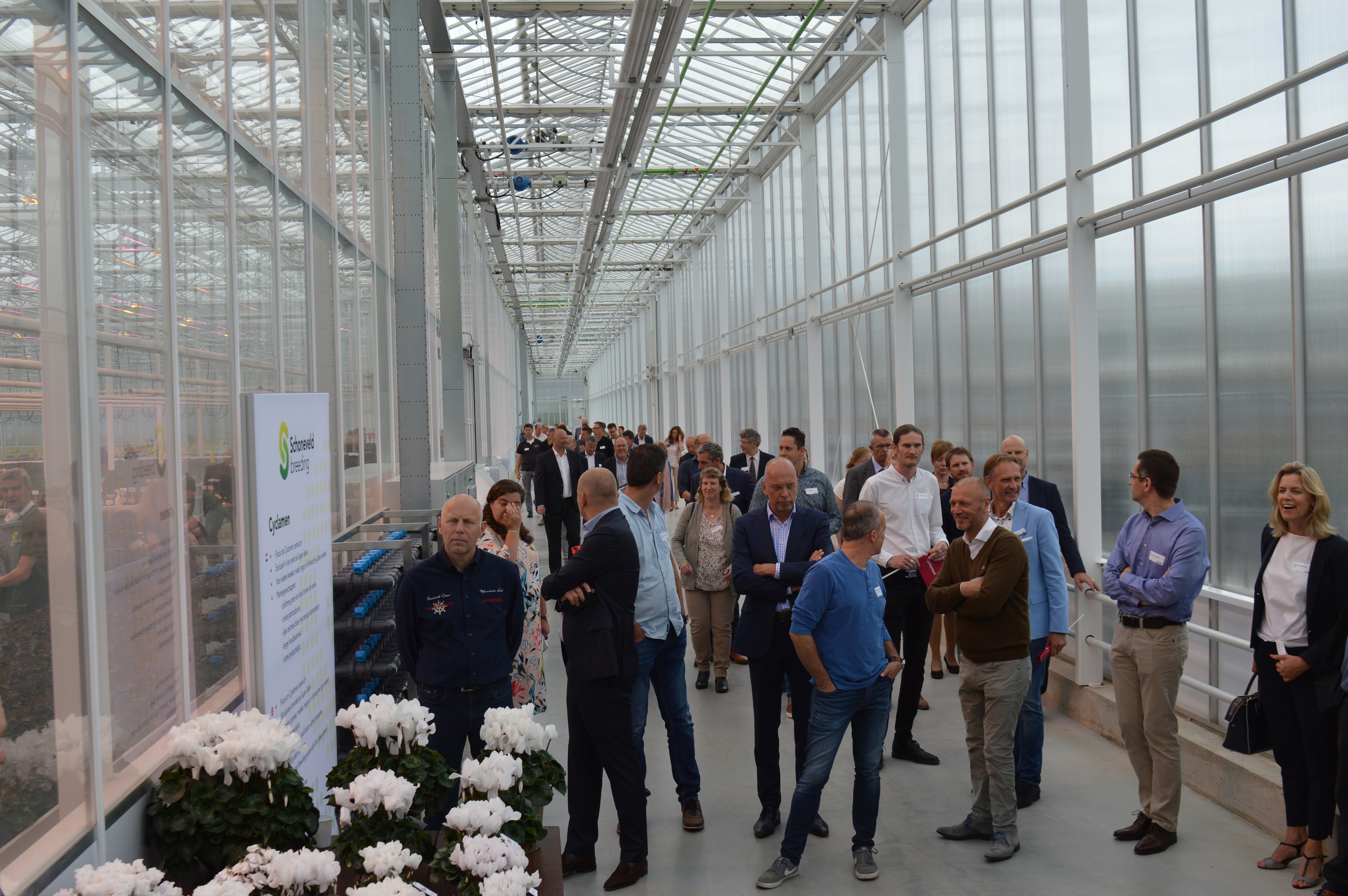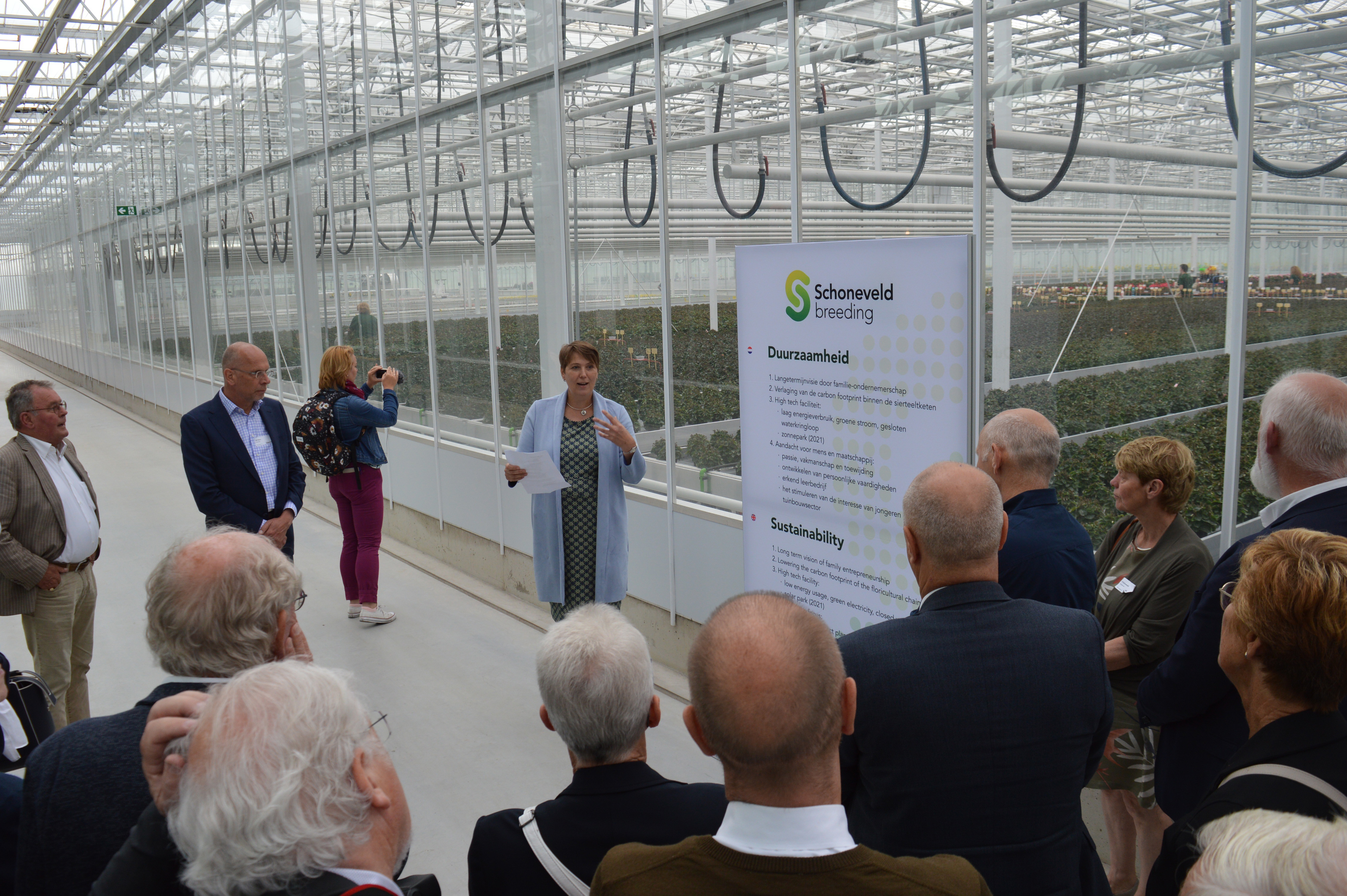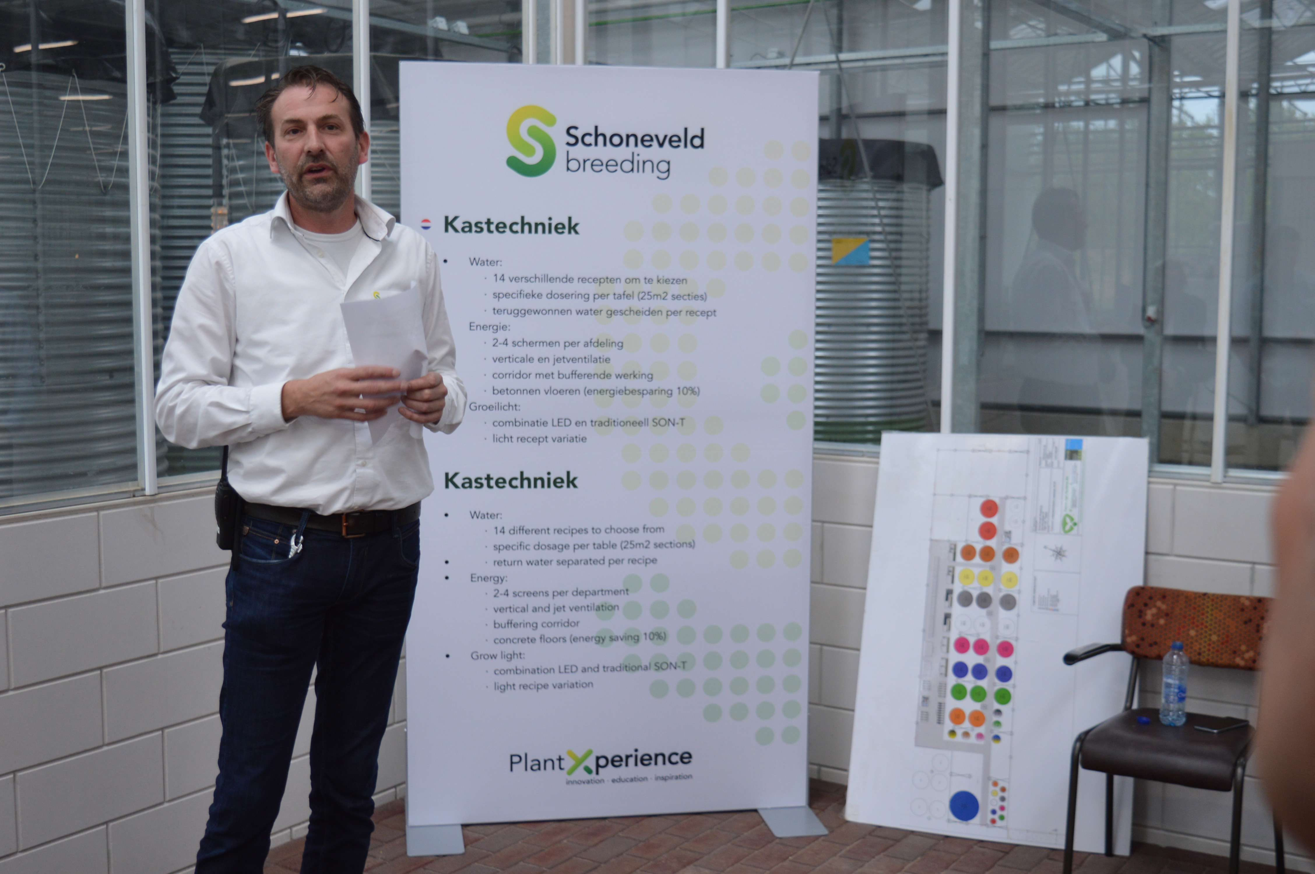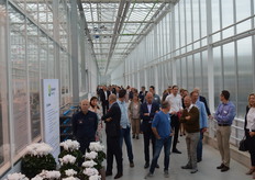 In tien verschillende groepjes maakte men vervolgens een rondje door het bedrijf. Er is niet beknibbeld op die zaken die het geheel tot een aan alle duurzaamheidseisen beantwoordende onderneming maakt, vertelt Lianne Hutten. Zo is de waterkringloop volledig gesloten en komt er nog nog een zonneveld, welke de eigen energievraag moet gaan vervullen. Het geheel aan kassen is, zoals bijvoorbeeld ook in de proefkasjes van de WUR in Bleiswijk, omringd door een corridor, waarmee een effectieve klimaatbuffer is geschapen.