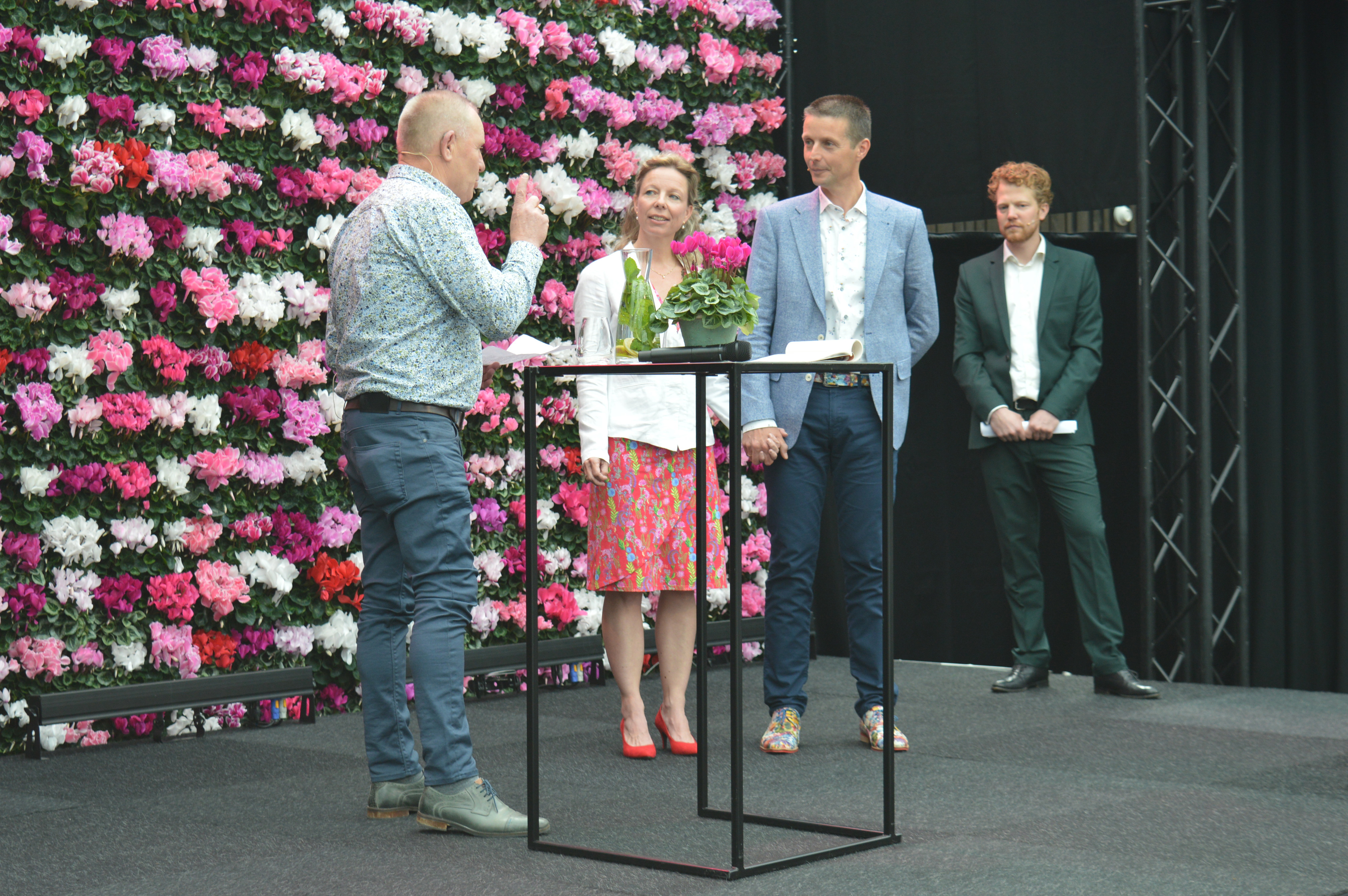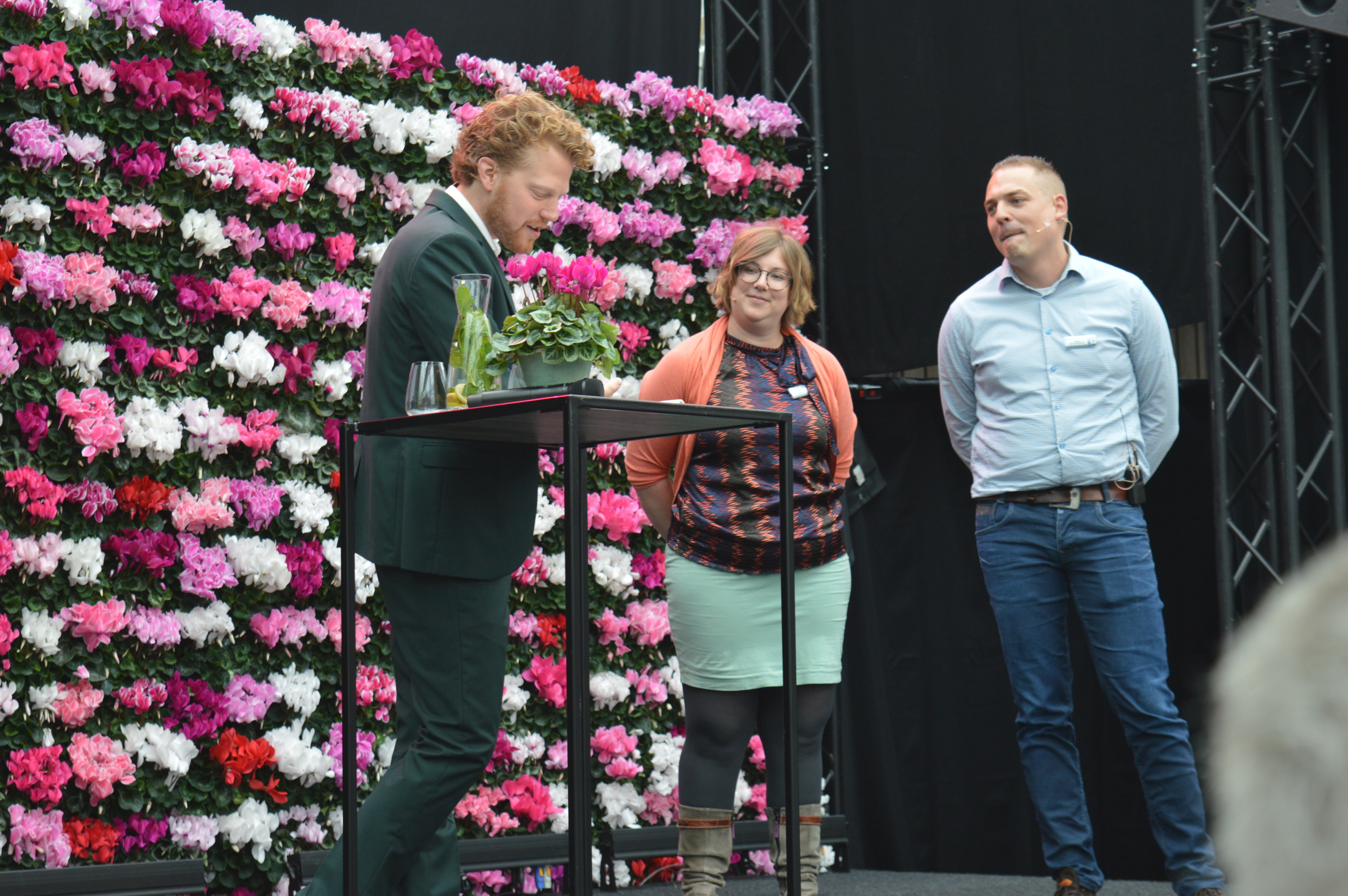 Een belangrijk gedeelte van het programma was gewijd aan de verschillende medewerkers. Pepijn riep er verschillende naar voren, zoals hier Dinja Lenkhorst en Huub van Oorsprong, beide area managers binnen het bedrijf.
