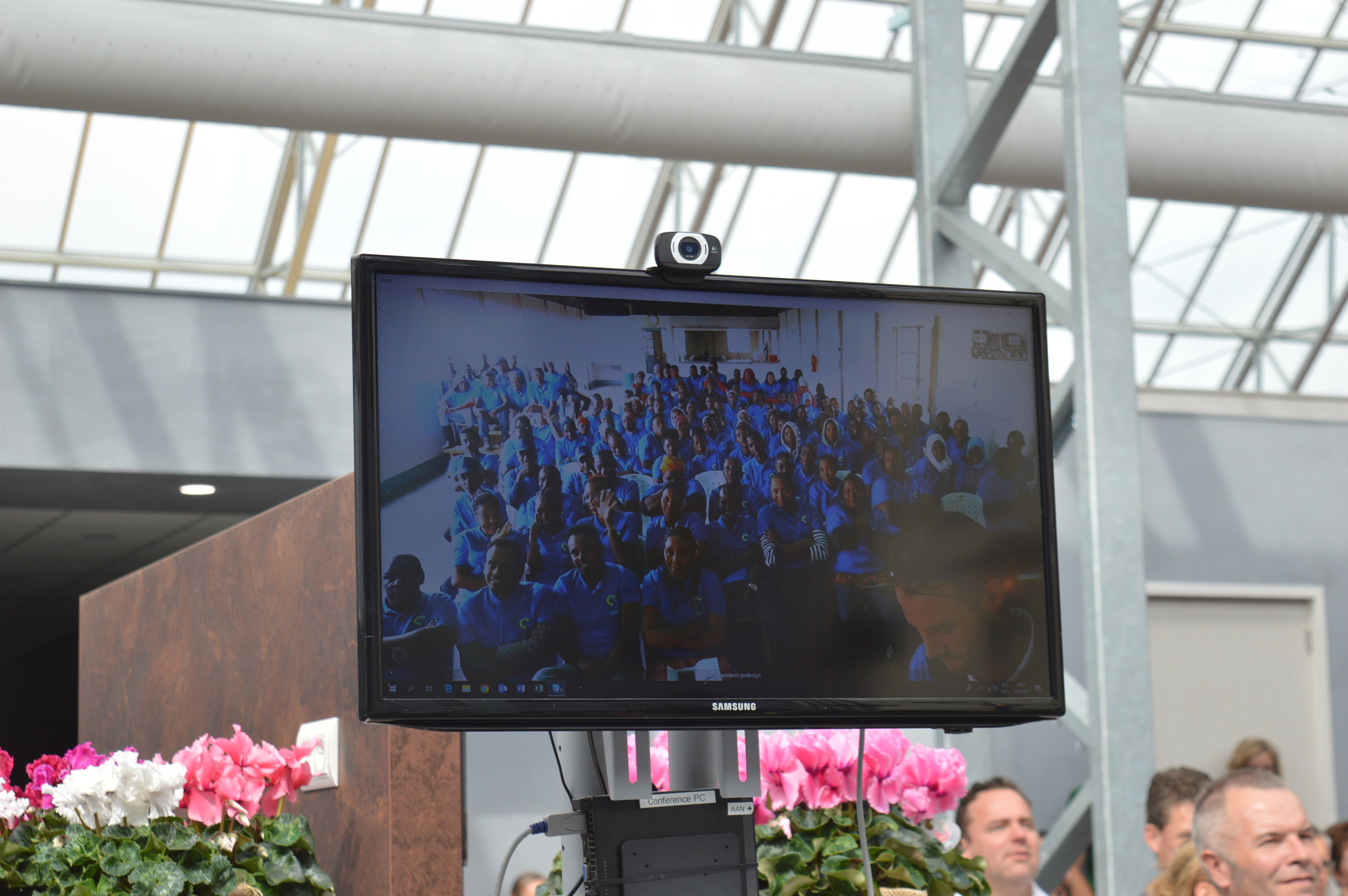 Niet alle medewerkers uit Tanzania konden overkomen, maar dankzij een life videoverbinding konden ze er toch een beetje bij zijn.