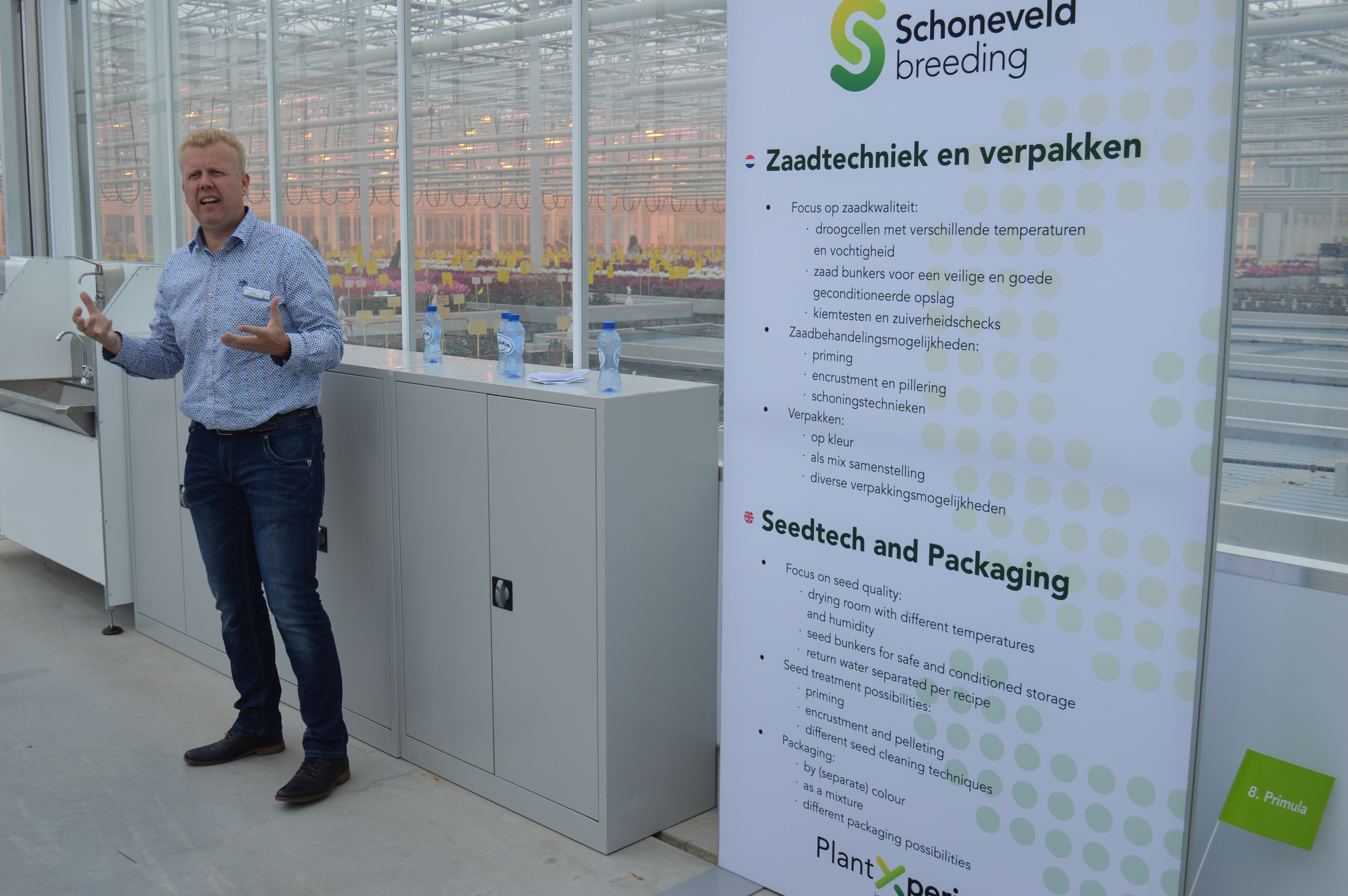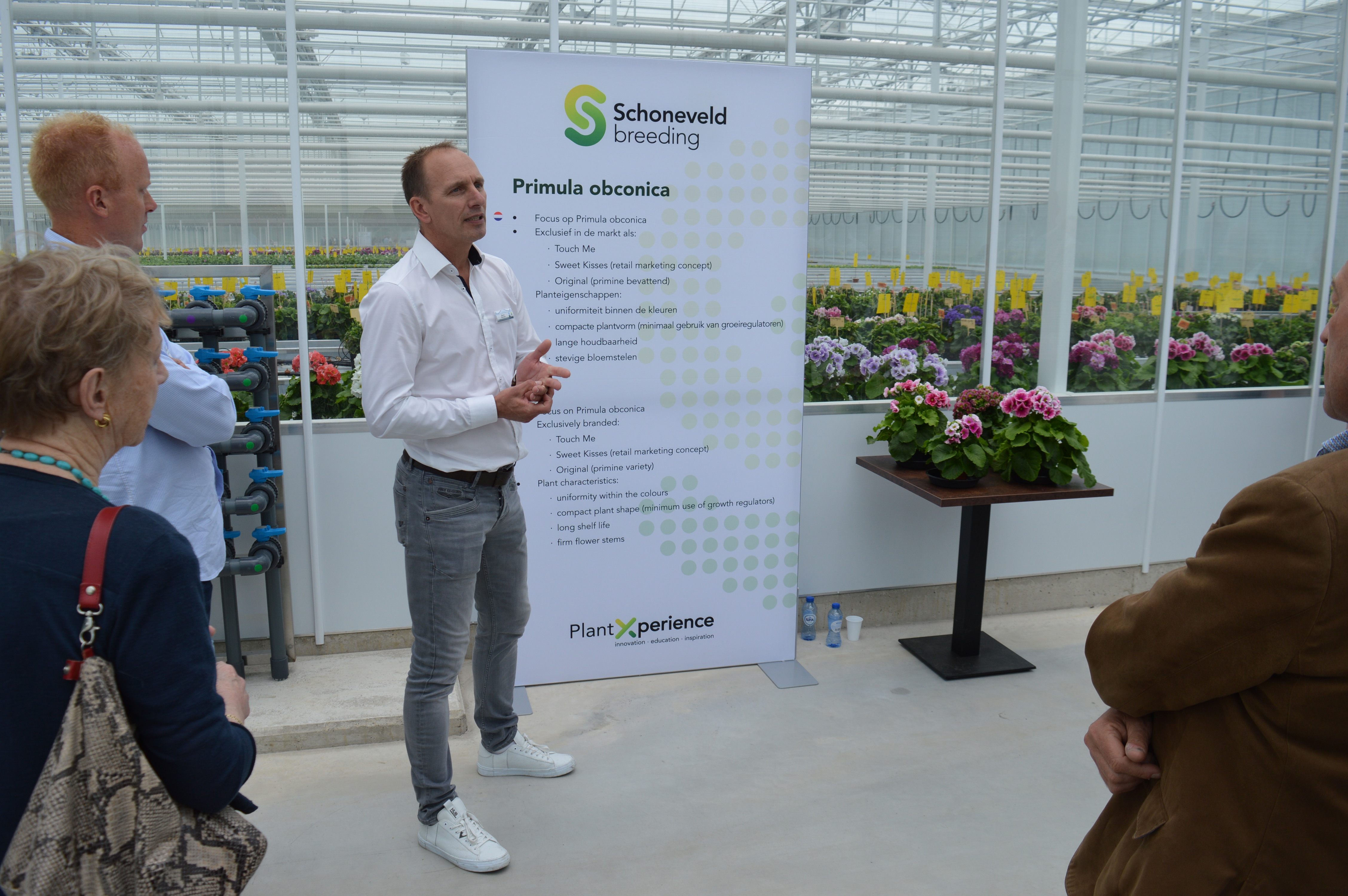 Marco Persoon vertelt het verhaal van de primula. Sinds de jaren 90 is Schoneveld zich gaan bezighouden met de veredeling, en dat resulteerde o.a. in het vinden van een priminevrije variant. Dat was een doorbraak, want de stof zorgde bij veel mensen voor huidirritatie. Na nog enkele jaren veredelen bracht men de primineloze varianten in 2002 op de markt onder het binnen het wereldje nog altijd bekende merk Touch Me.