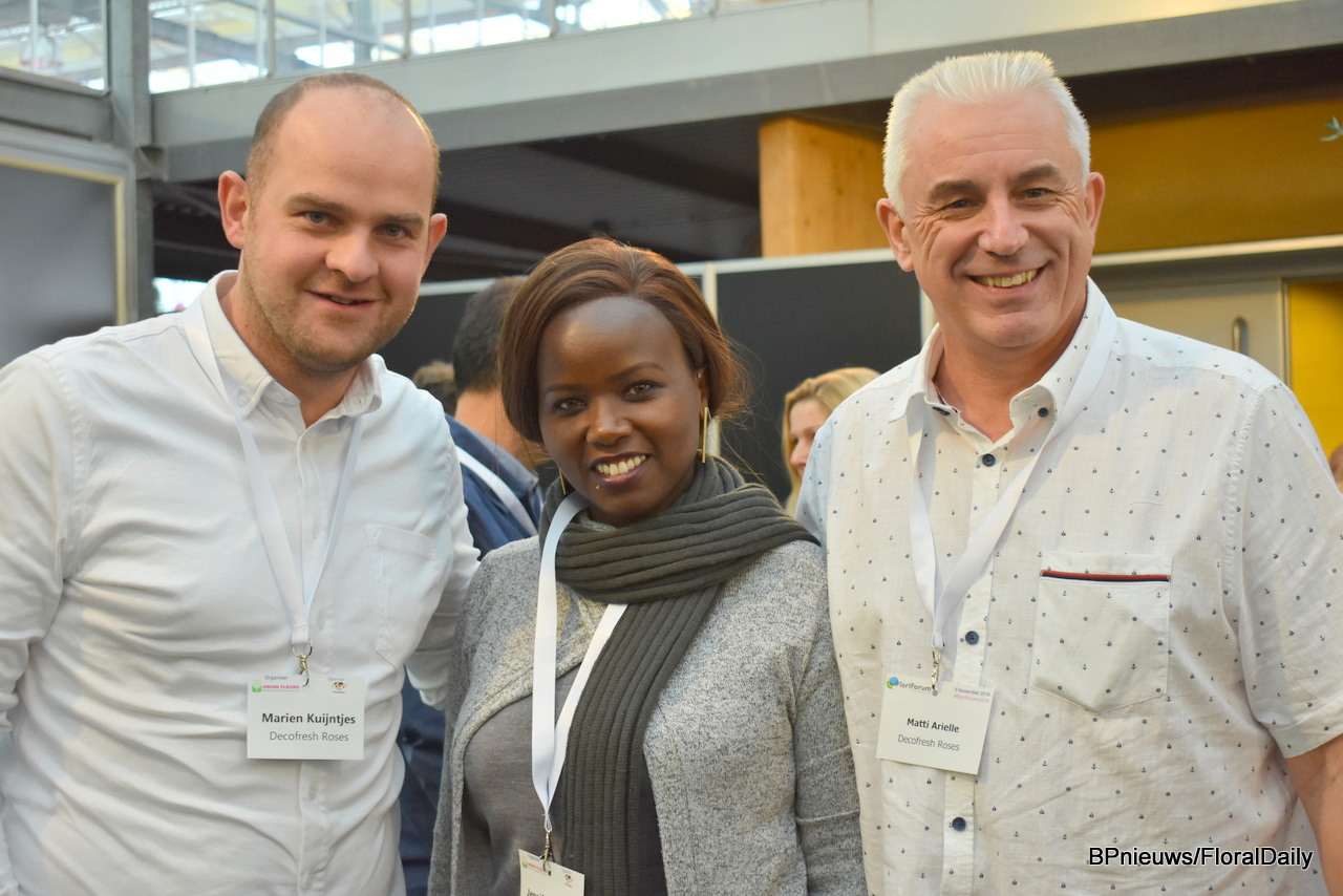 Marien Kuijntjes, Jennifer Gertue en Matti Arielle representeren de Keniaanse rozenkwekerij Decofresh Roses.