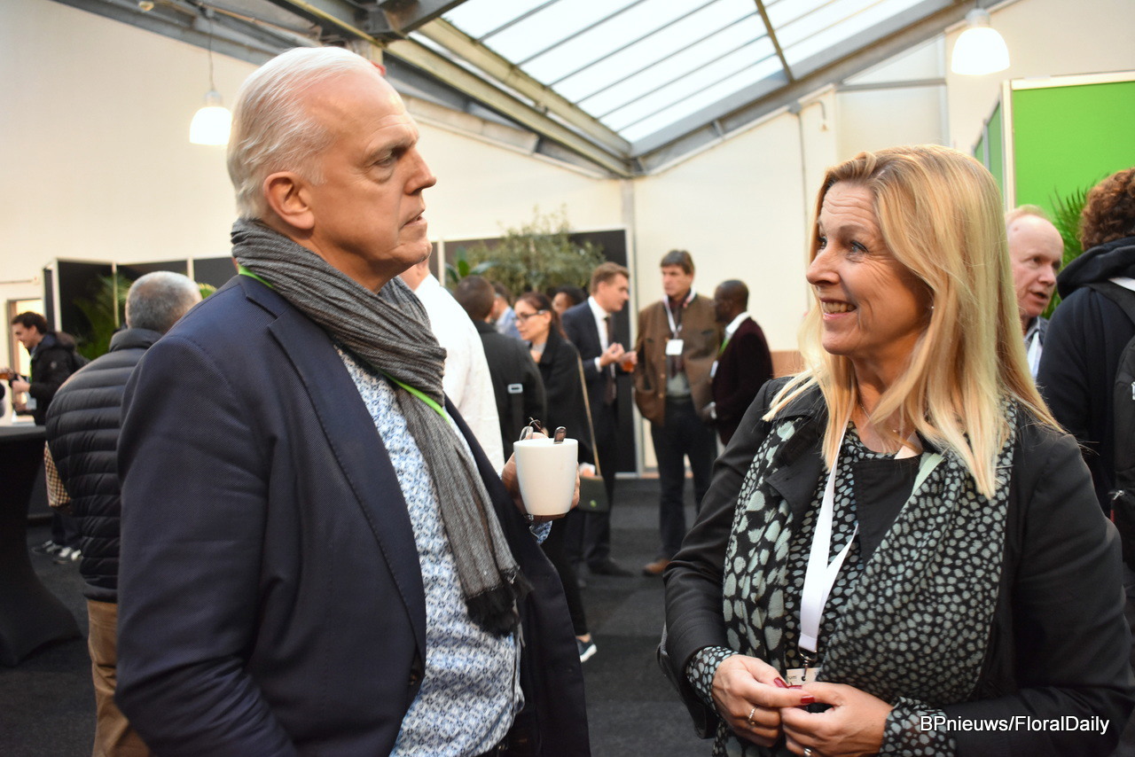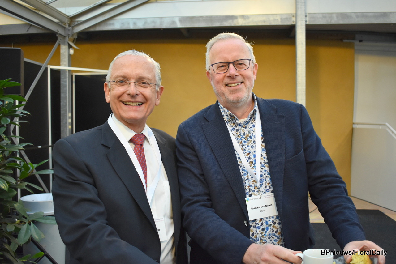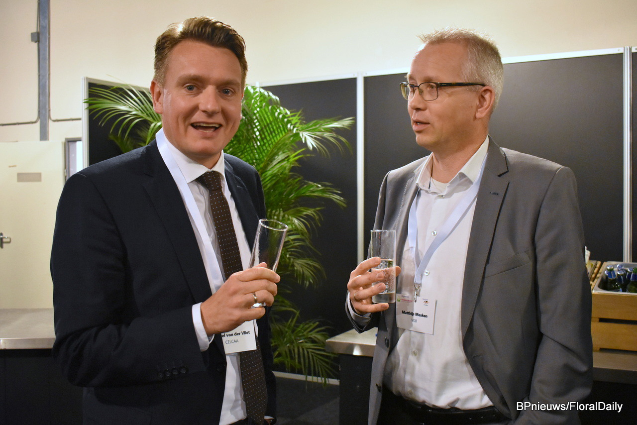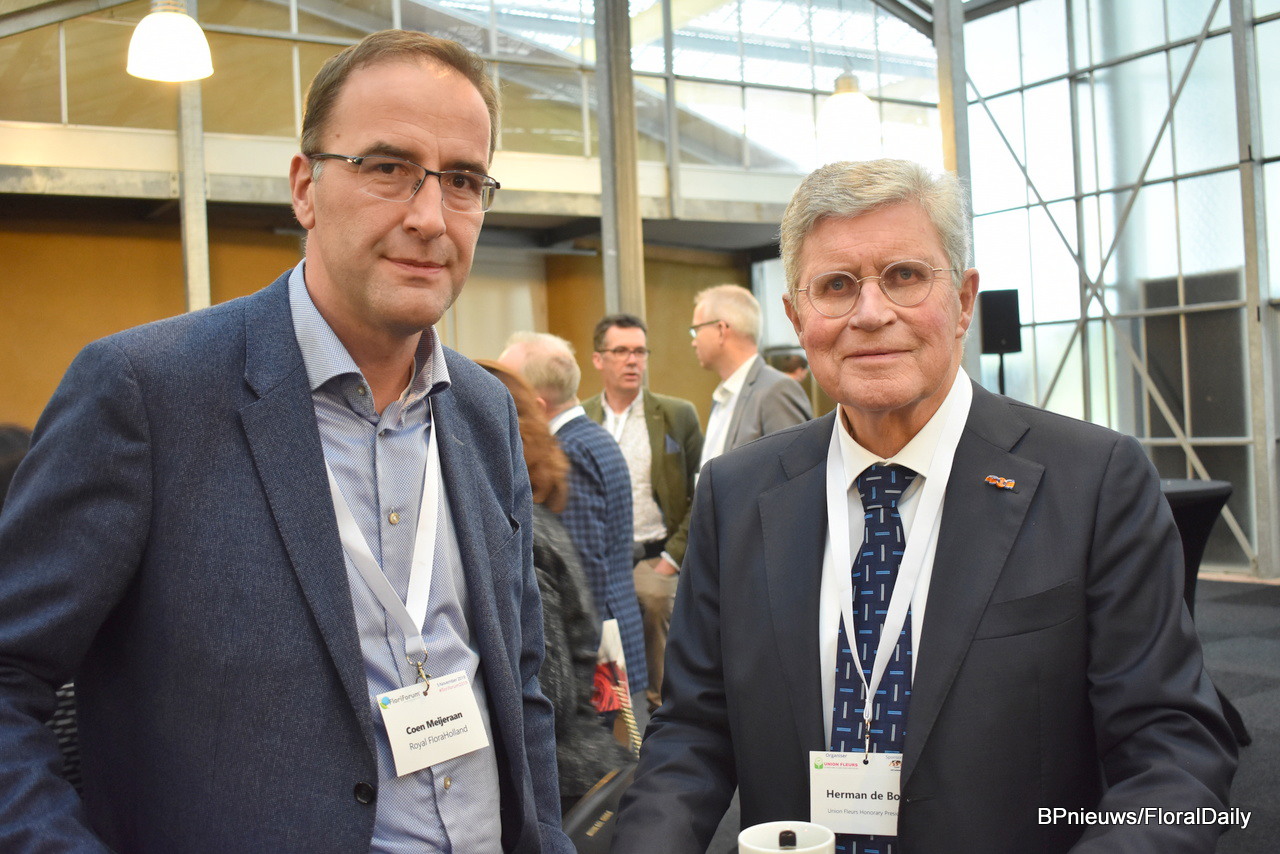 Coen Meijeraan van Royal FloraHolland praat bij met Herman de Boon.
