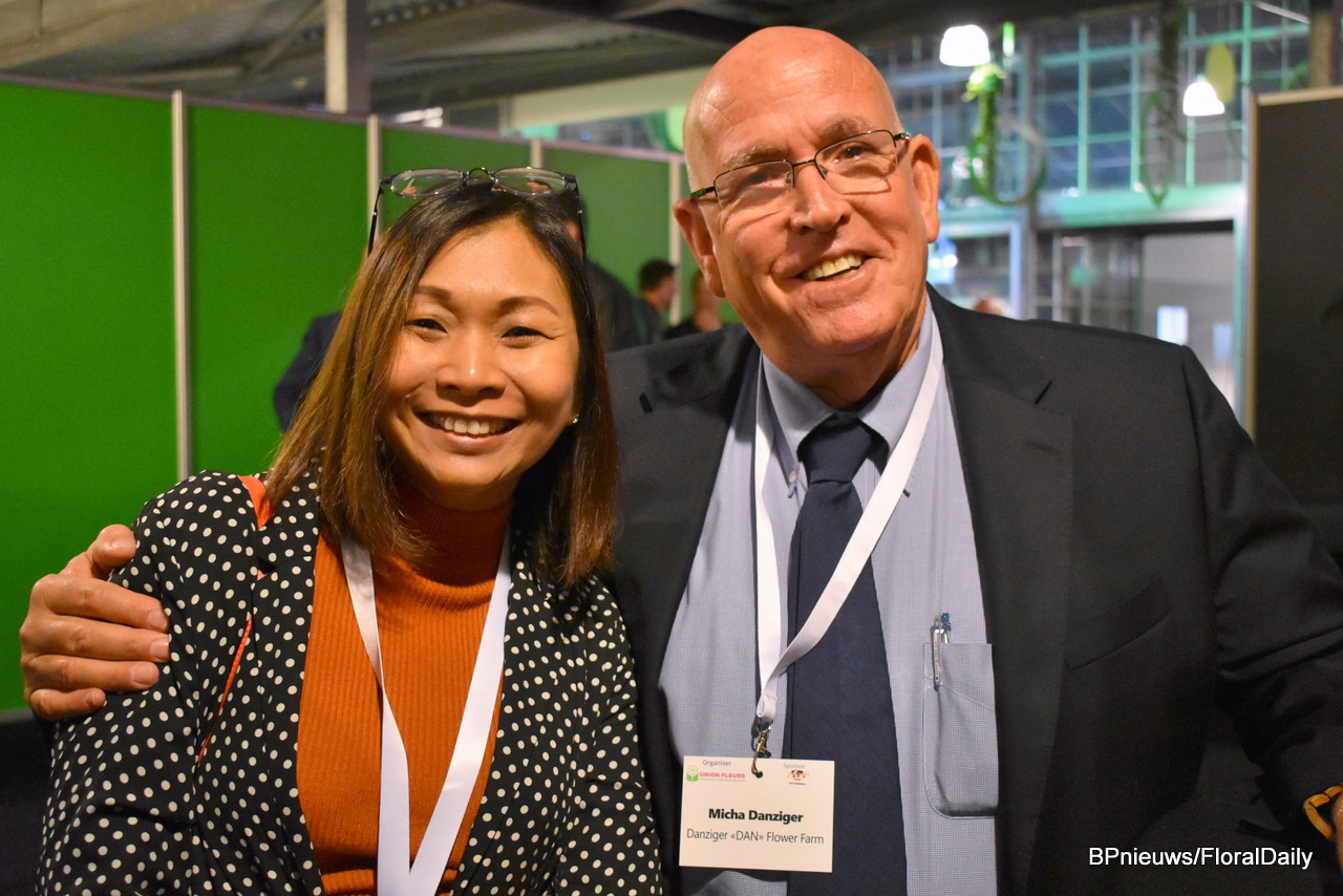 Mya Thway, die zich bezighoudt met de bloemensector van Myanmar met veredelaar Micha Danziger.
