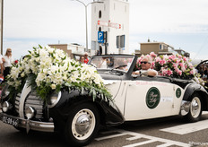 Een oldtimer vol lelies van De Looff Lily-Innovation, ze wonnen de prijs van Mooiste Voertuig