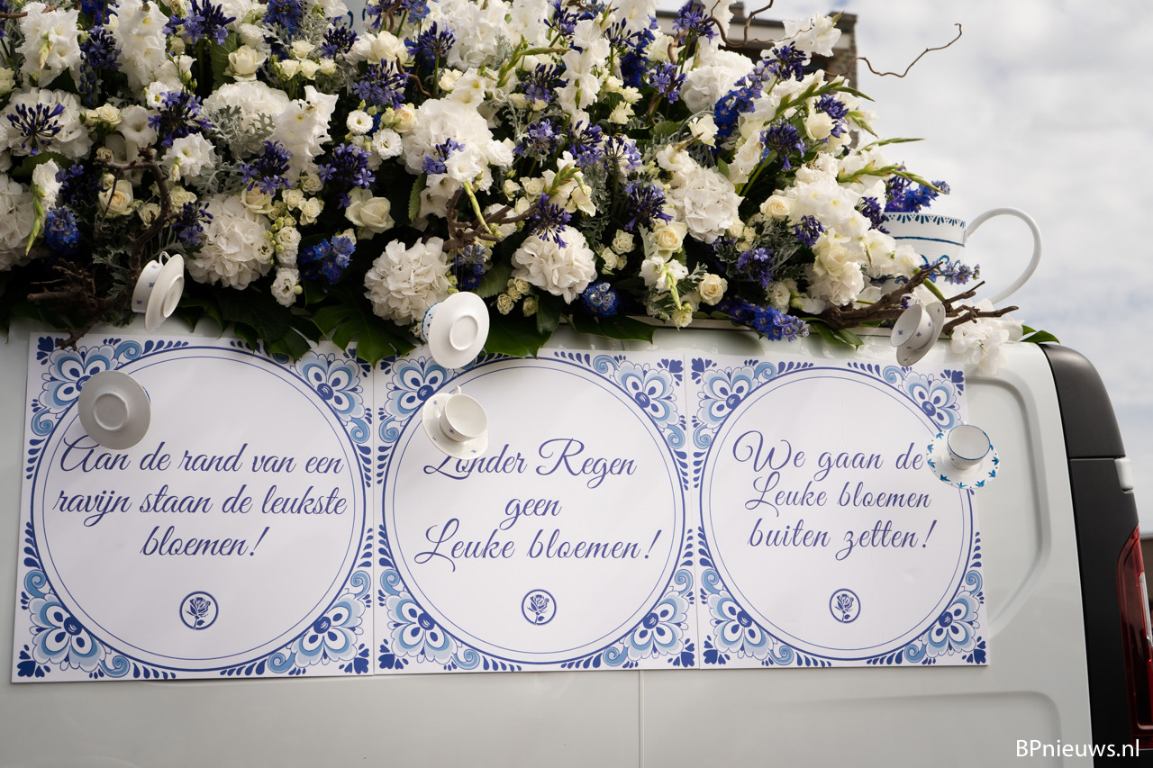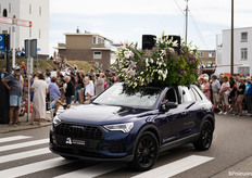 Het is een wonder dat ze nog door het raam konden kijken met zoveel bloemen op de auto