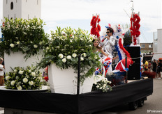 Vier generaties zwaaiende koninginnen op de praalwagen “Koninklijk Huis” aangeboden door Gemeente Katwijk
