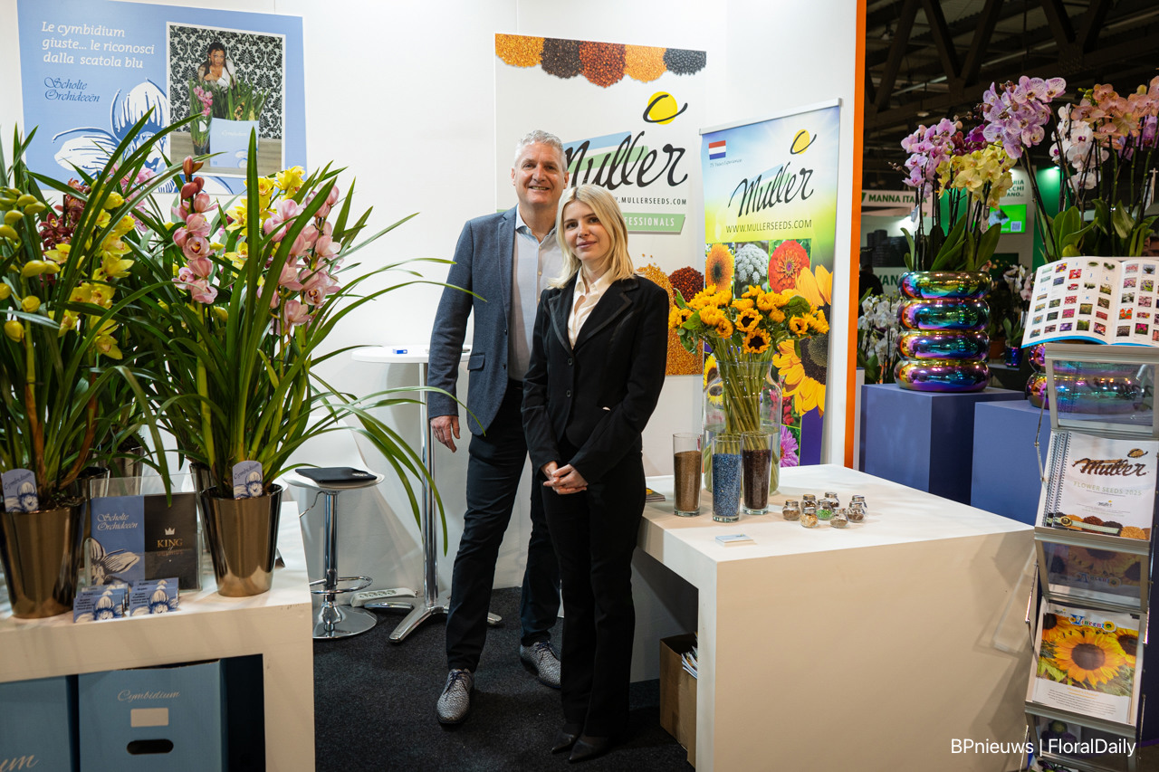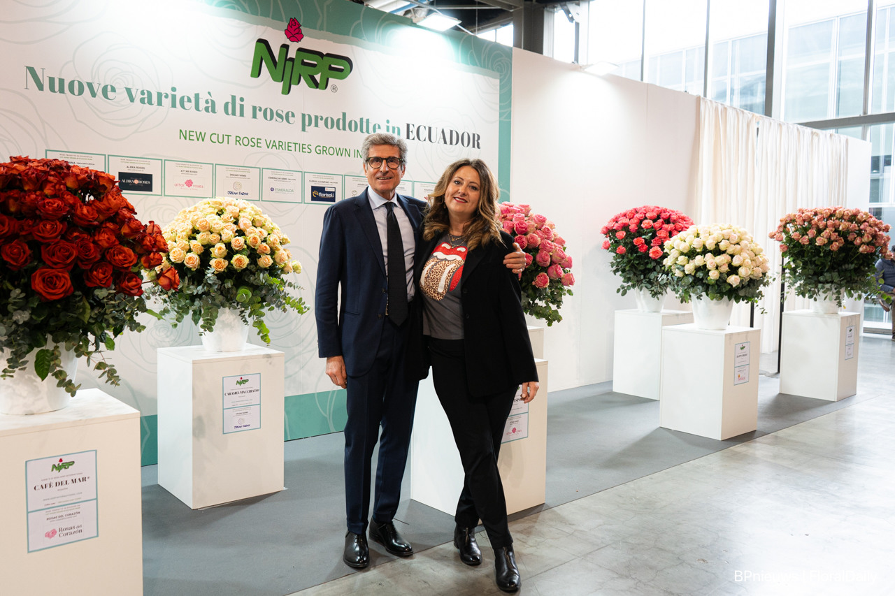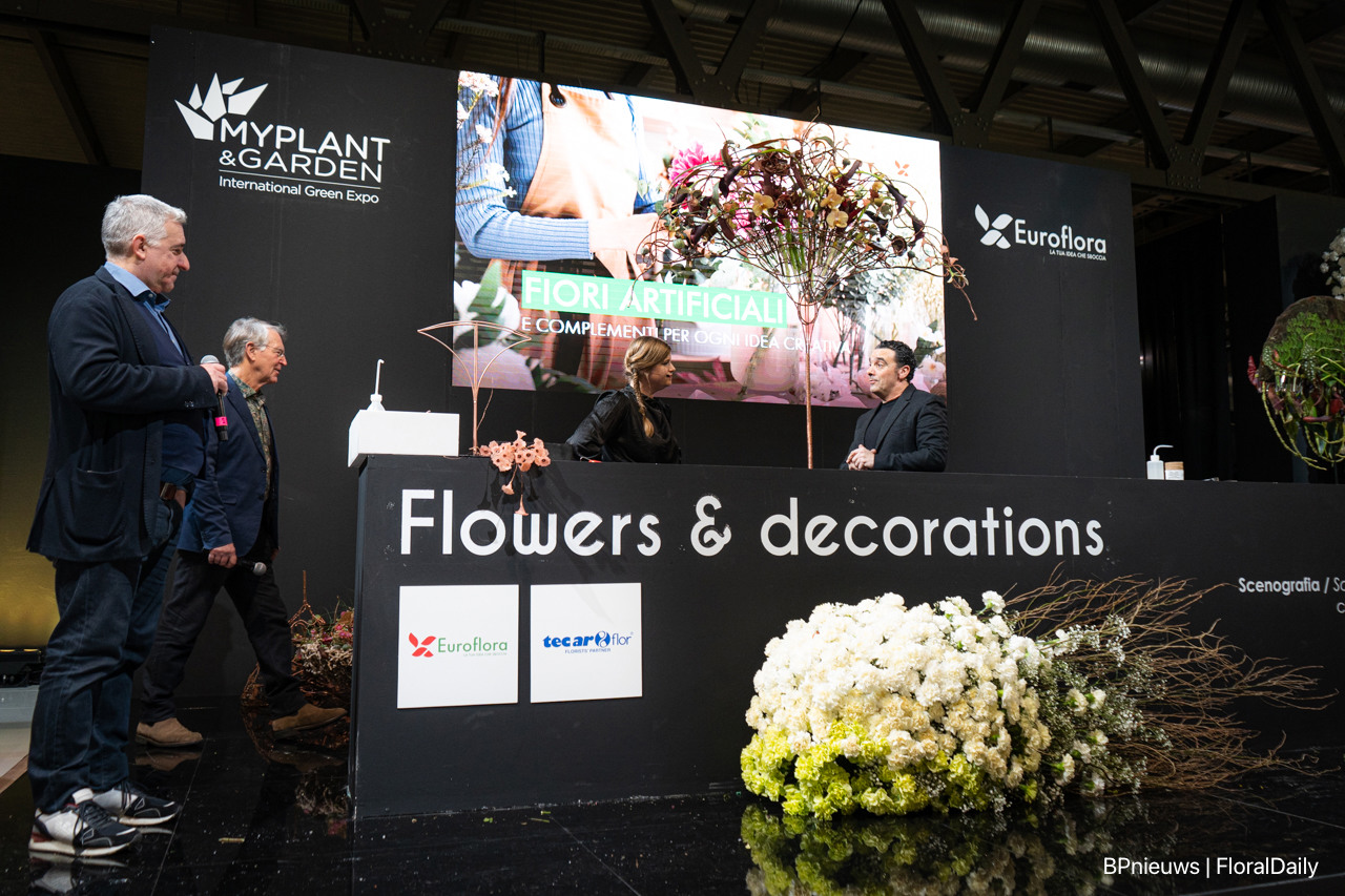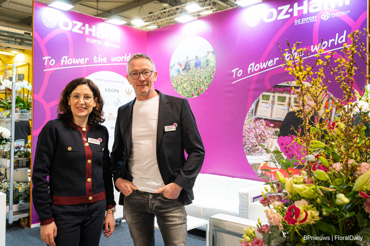 Filippo Faccioli van Myplant&Garden met Deborah Ghione van NIRP. Ze vertellen hoe steeds meer snijbloemen, ook vanuit Kenia en Ecuador, op de beurs te zien zijn.
