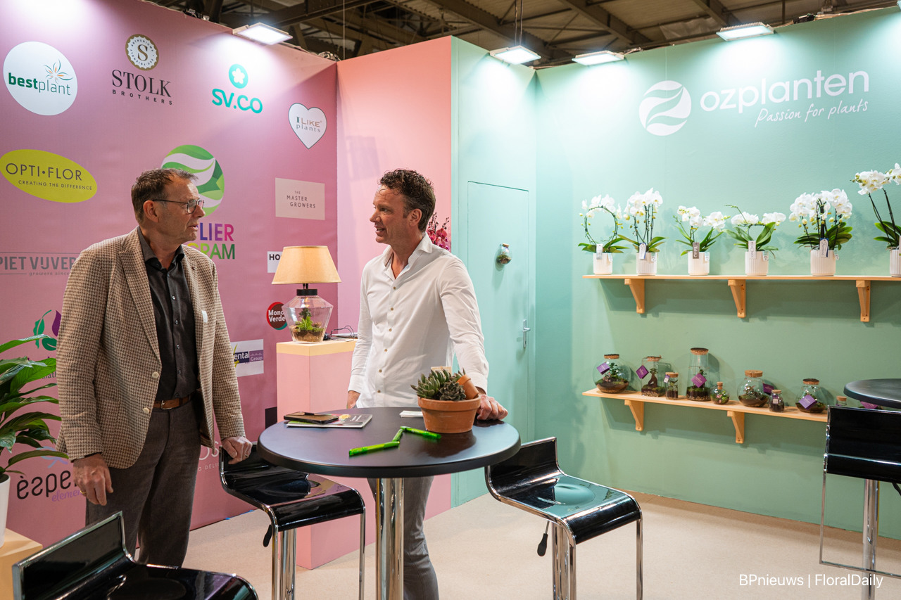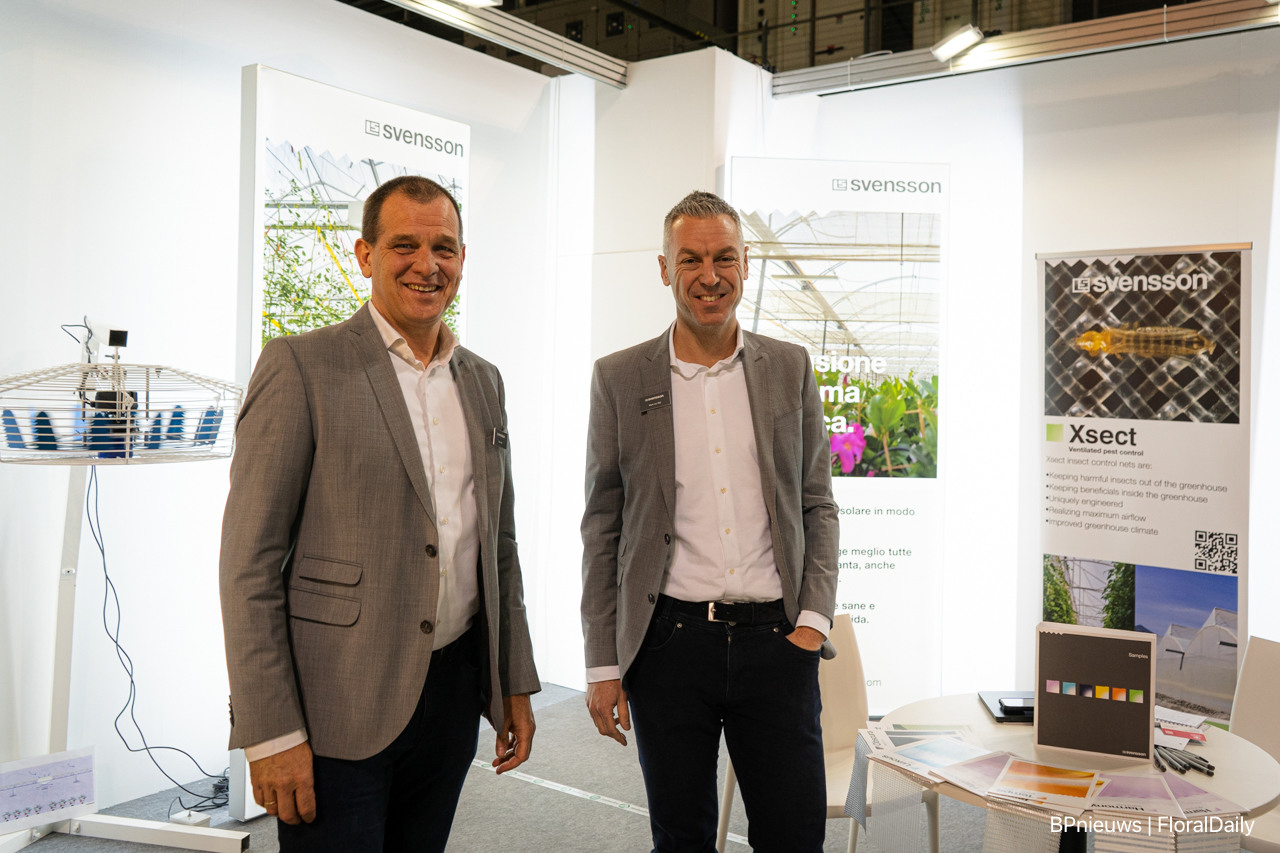 Pieter Mol en Mark van Dijk van Ludvig Svensson. Zij zien een grote markt in Italië, en gebruiken de beurs om bij te praten met de kweker.