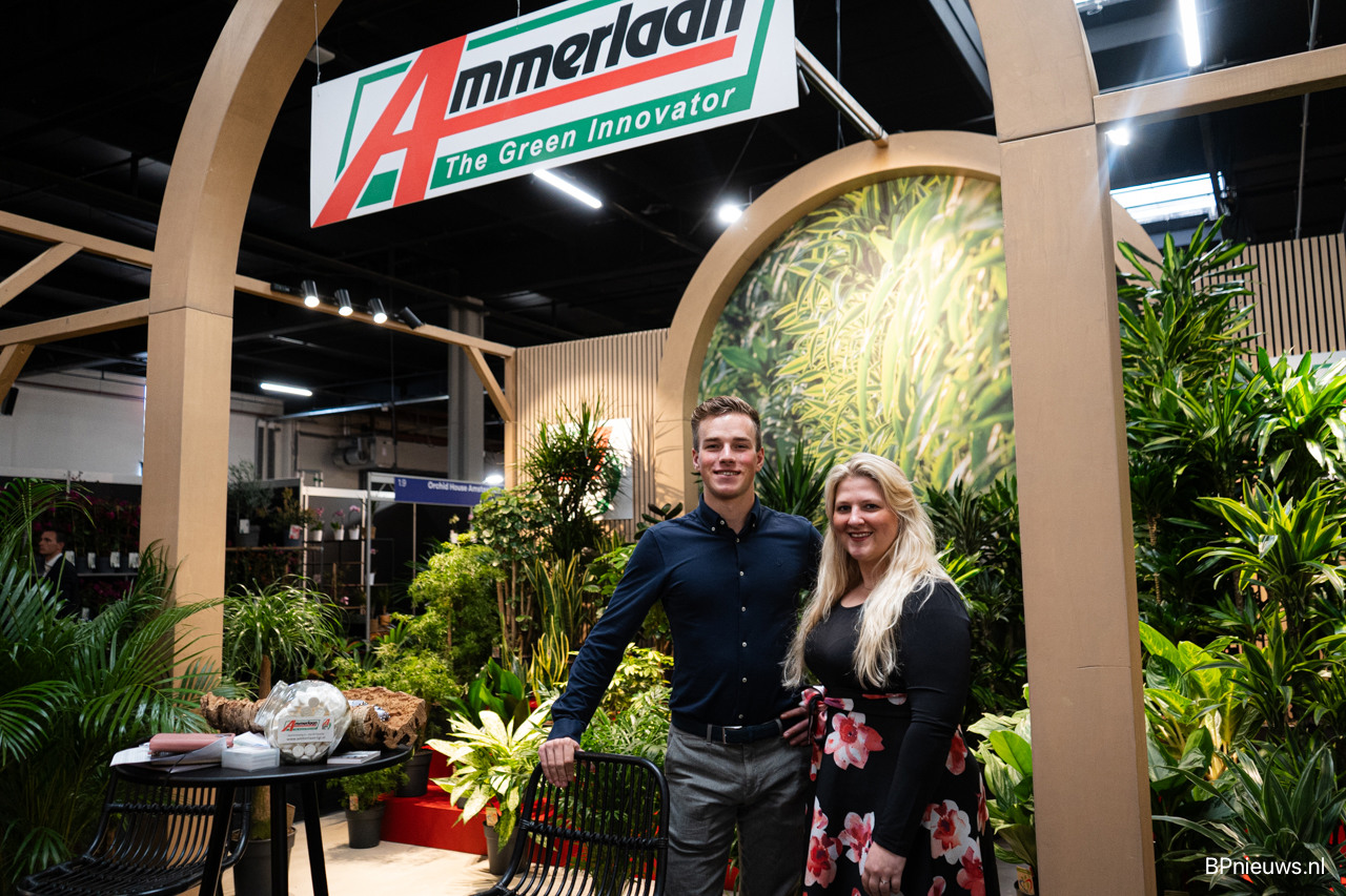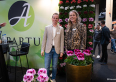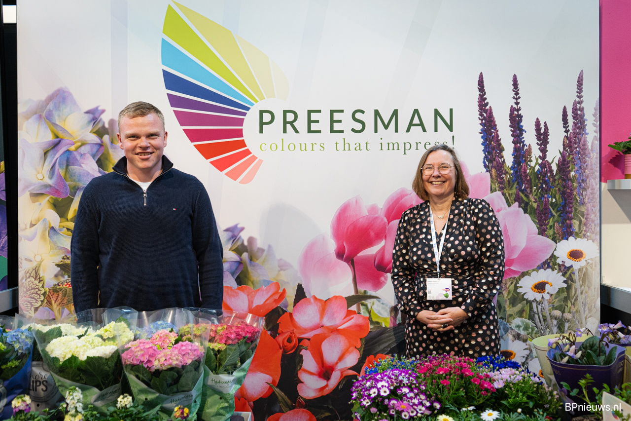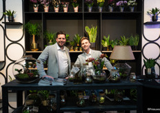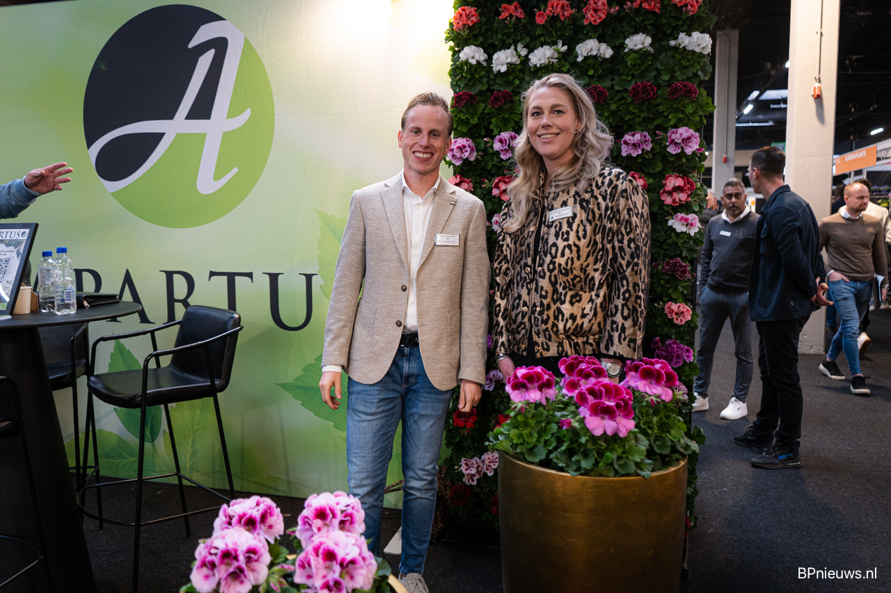Bas en Natalie van Preesman met hun kleurrijke bloeiende potplanten