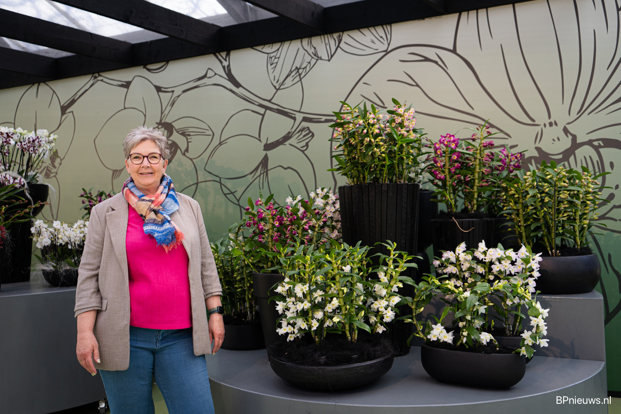 Jolanda Nieuwenhuijze van De Hoog Orchids laat trots hun Nobile zien die in de Orchideeën Plaza in de Keukenhof te zien zijn.