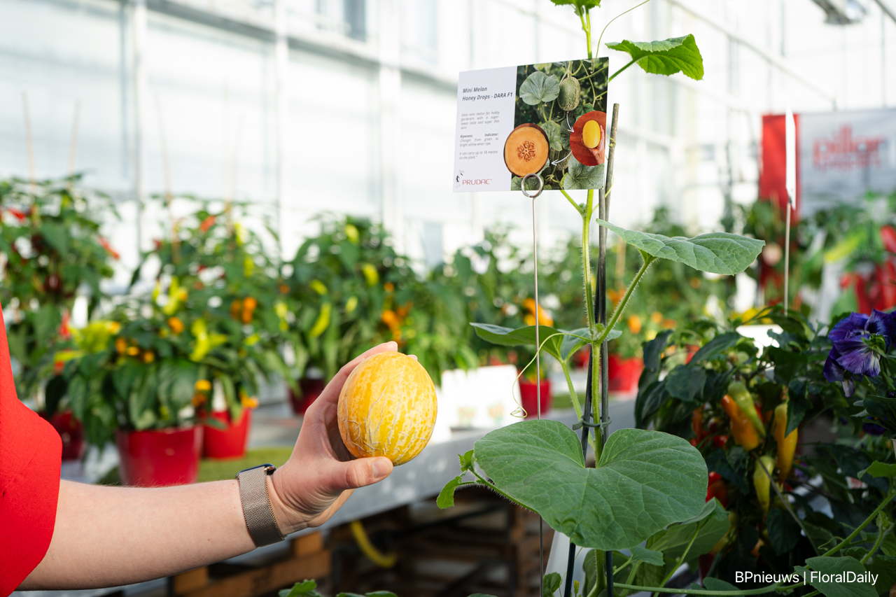 En de nieuwe Minimeloen Honey Drops F1 Dara, met een ultradunne schil en groeit gemiddeld tot wel 18 vruchten per plant.